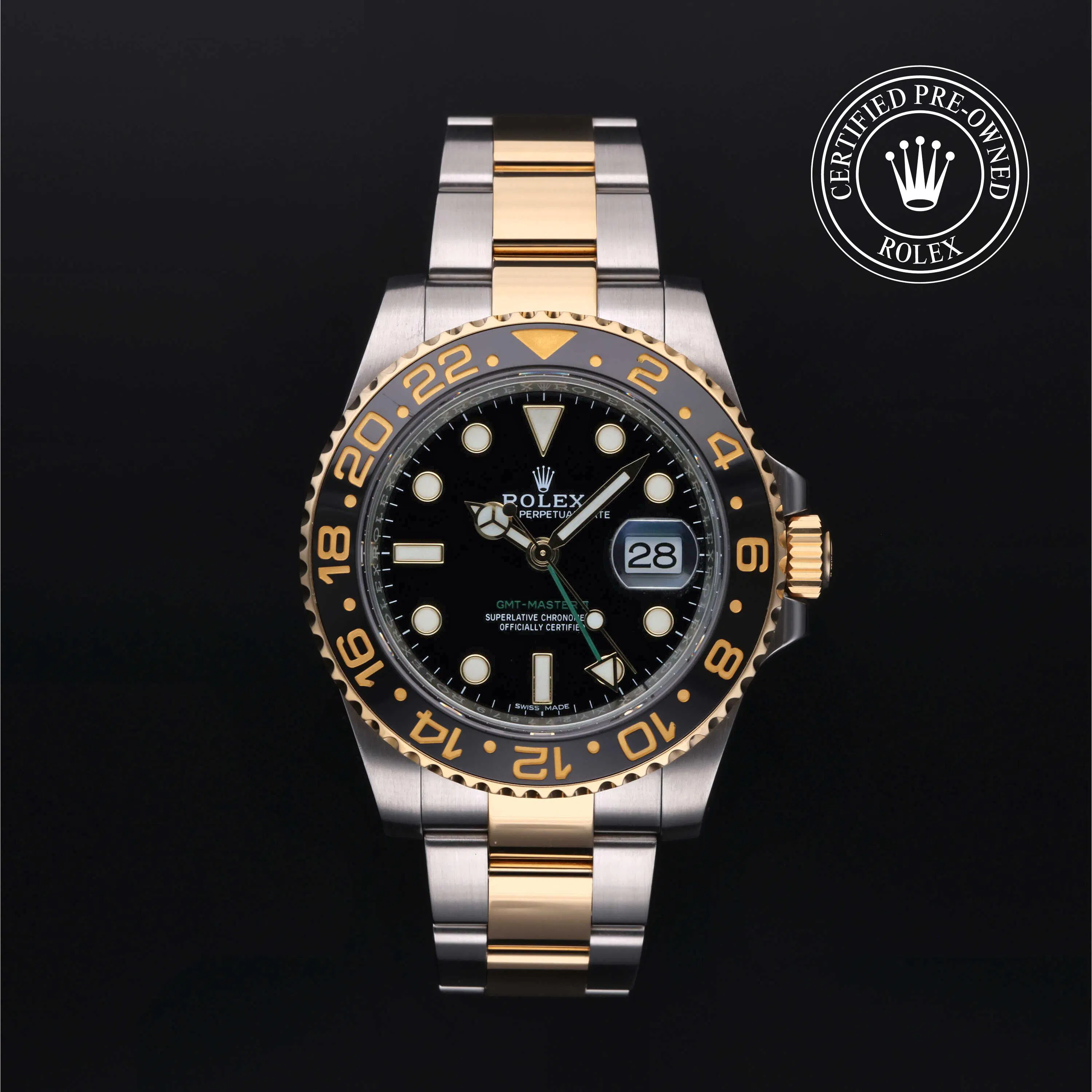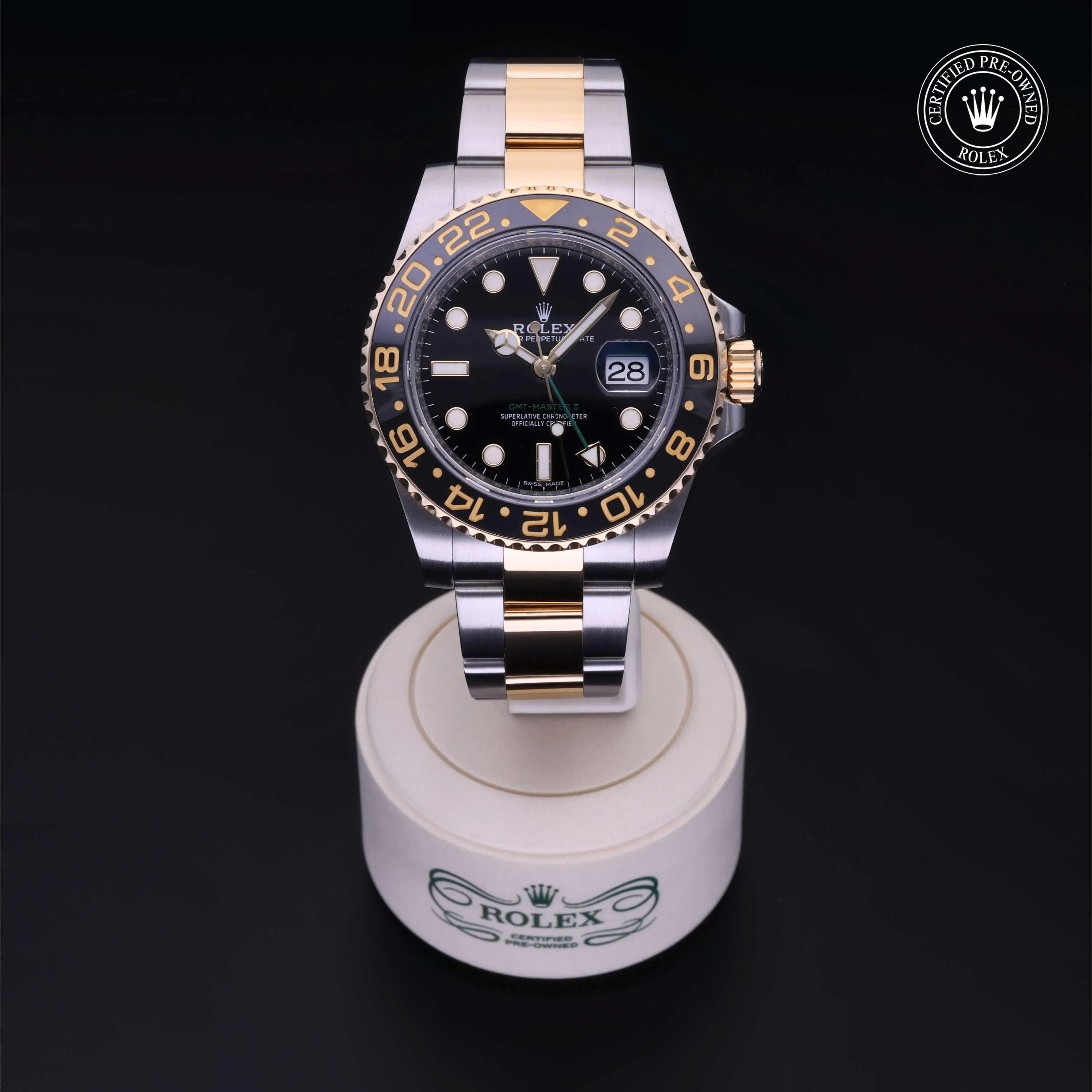 Rolex Certified Pre-Owned GMT-Master II (116713LN) self - winding automatic watch, features a 40mm stainless steel case with an 18k yellow gold bidirectional rotating bezel with a black cerachrom insert surrounding a black dial on a stainless steel and 18k yellow gold Oyster bracelet. Functions include hours, minutes, seconds, date and gmt/world time. This watch has received Rolex-authorized service and certification. It does not come with the original box or papers, but includes a custom Rolex Certified Pre-Owned hang tag, travel pouch and RCPO international warranty card.