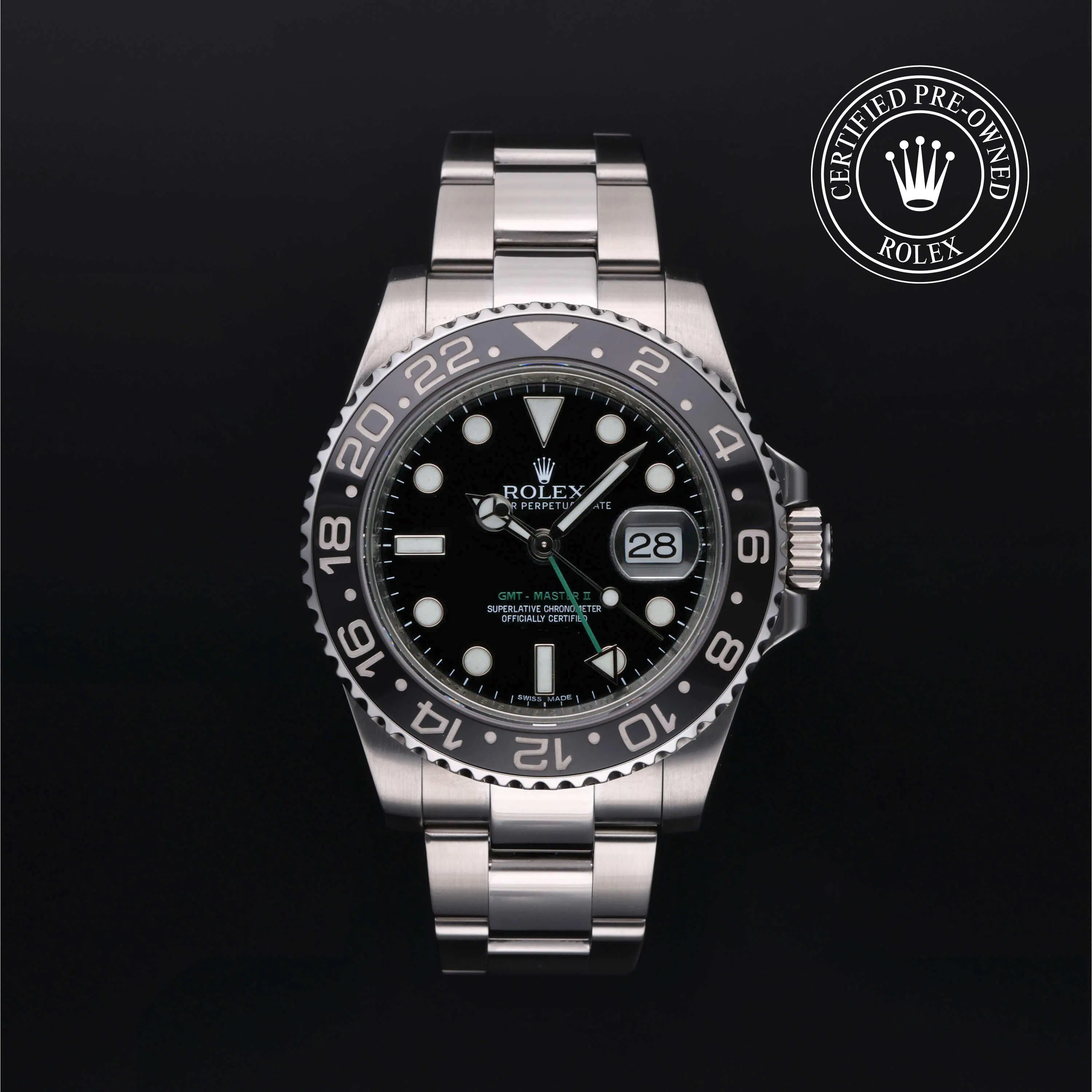 Rolex Certified Pre-Owned GMT-Master II (116710LN) self - winding automatic watch, features a 40mm stainless steel case and bidirectional rotating bezel with a black cerachrom insert surrounding a black dial on a stainless steel Oyster bracelet. Functions include hours, minutes, seconds, date and gmt/world time. This watch has received Rolex-authorized service and certification. It comes with the original box and papers, and includes a custom Rolex Certified Pre-Owned hang tag, travel pouch and RCPO international warranty card.