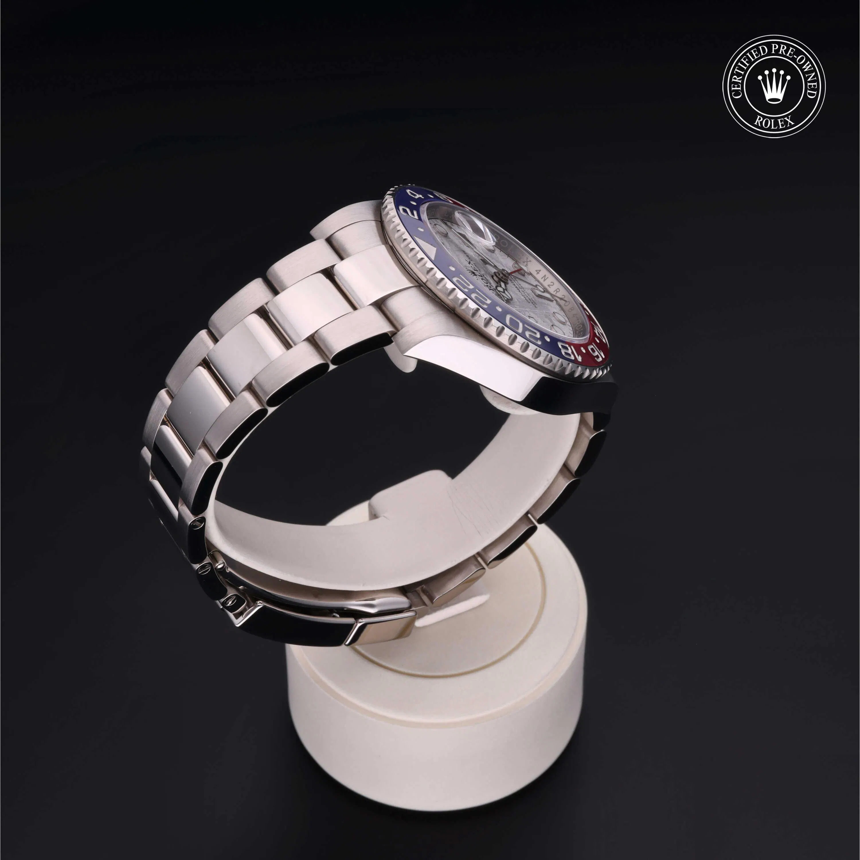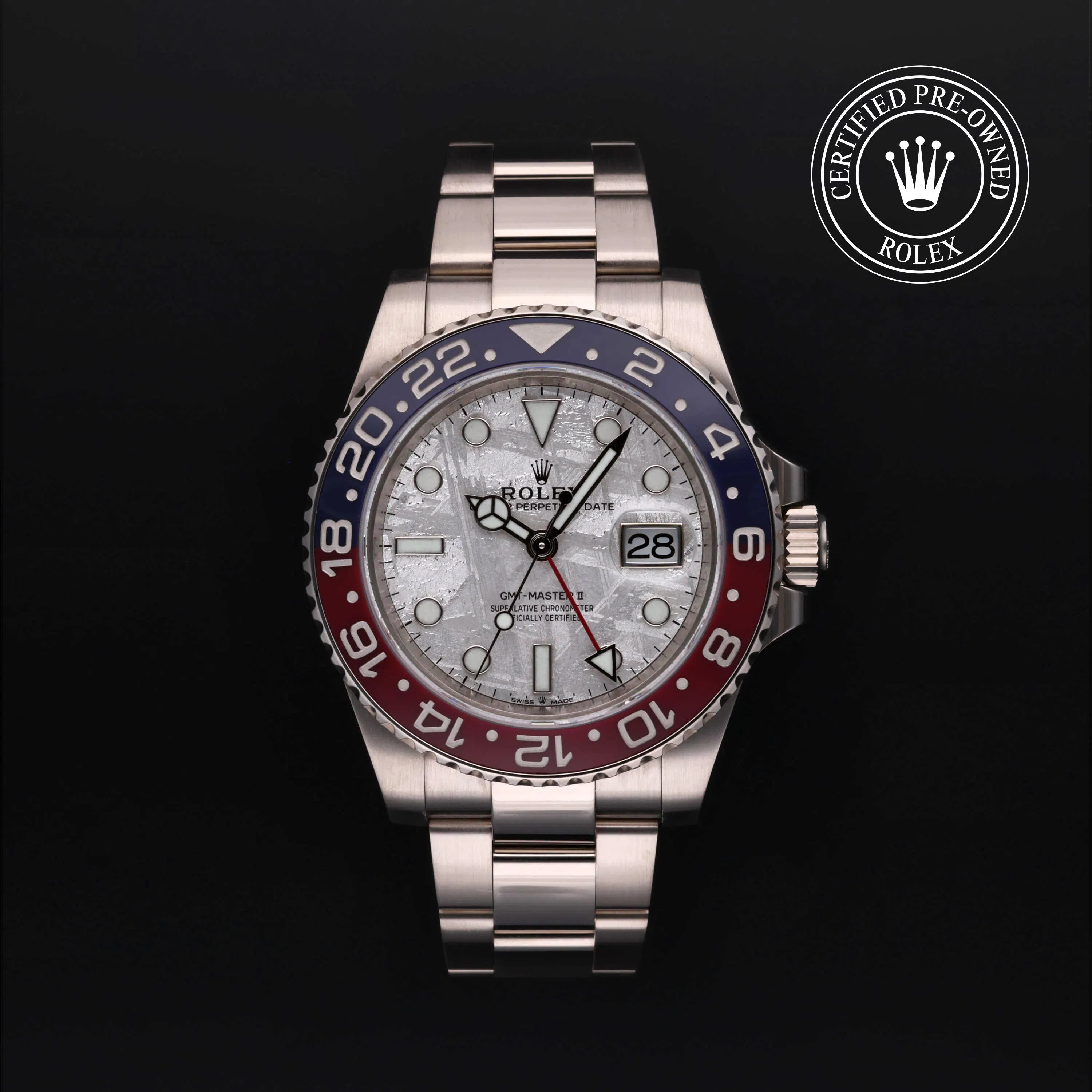 Rolex Certified Pre-Owned GMT-Master II (126719BLRO) self - winding automatic watch, features a 40mm 18k white gold case and bidirectional rotating bezel with a blue and red cerachrom insert surrounding a meteorite dial on an 18k white gold Oyster bracelet. Functions include hours, minutes, seconds, date and gmt/world time. This watch has received Rolex-authorized service and certification. It comes with the original papers, and includes a custom Rolex Certified Pre-Owned hang tag, travel pouch and RCPO international warranty card.