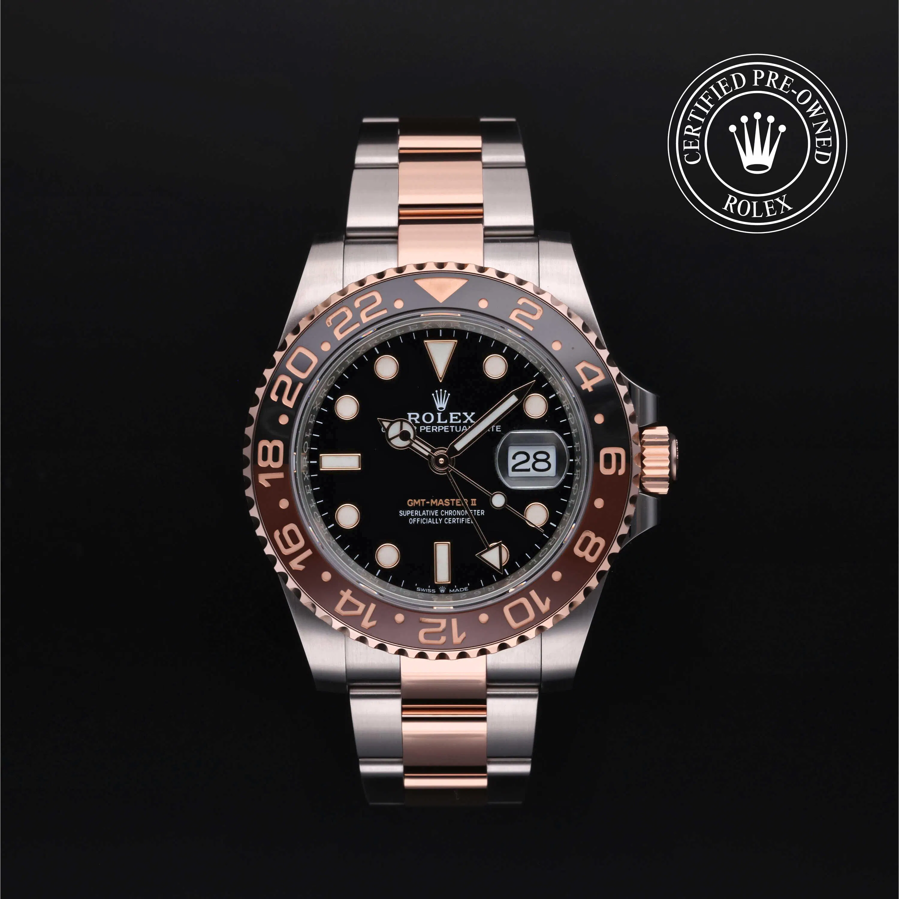 Rolex Certified Pre-Owned GMT-Master II (126711CHNR) self - winding automatic watch, features a 40mm stainless steel case with an 18k rose gold bidirectional rotating bezel with a black and brown cerachrom insert surrounding a black dial on a stainless steel and 18k rose gold oyster bracelet. Functions include hours, minutes, seconds, date and gmt/world time. This watch has received Rolex-authorized service and certification. It comes with the original box and papers, and includes a custom Rolex Certified Pre-Owned hang tag, travel pouch and RCPO international warranty card.
