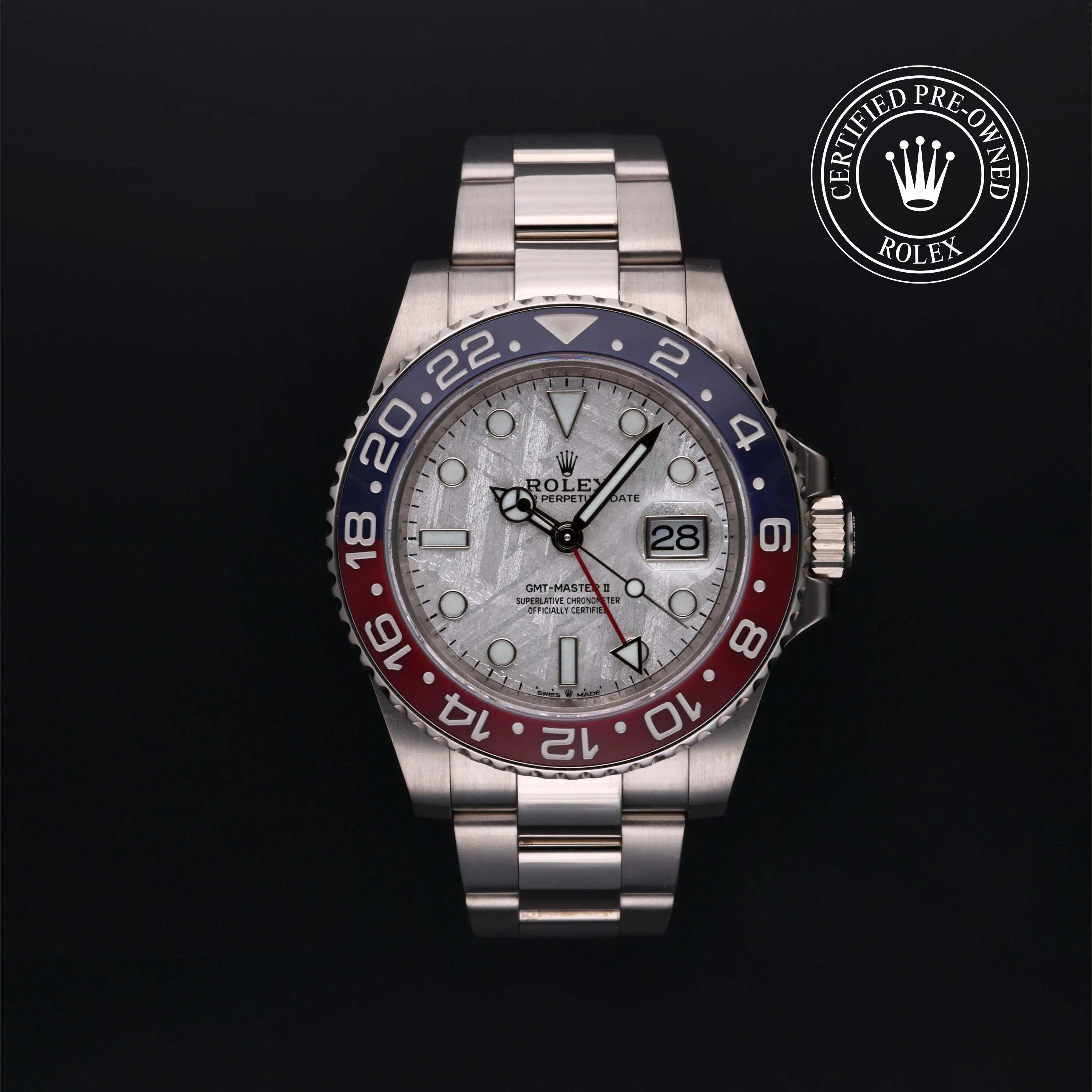 Rolex Certified Pre-Owned GMT-Master II (126719BLRO) self - winding automatic watch, features a 40mm 18k white gold case and bidirectional rotating bezel with a blue and red cerachrom insert surrounding a meteorite dial on an 18k white gold oyster bracelet. Functions include hours, minutes, seconds, date and gmt/world time. This watch has received Rolex-authorized service and certification. It does not come with the original box or papers, but includes a custom Rolex Certified Pre-Owned hang tag, travel pouch and RCPO international warranty card.