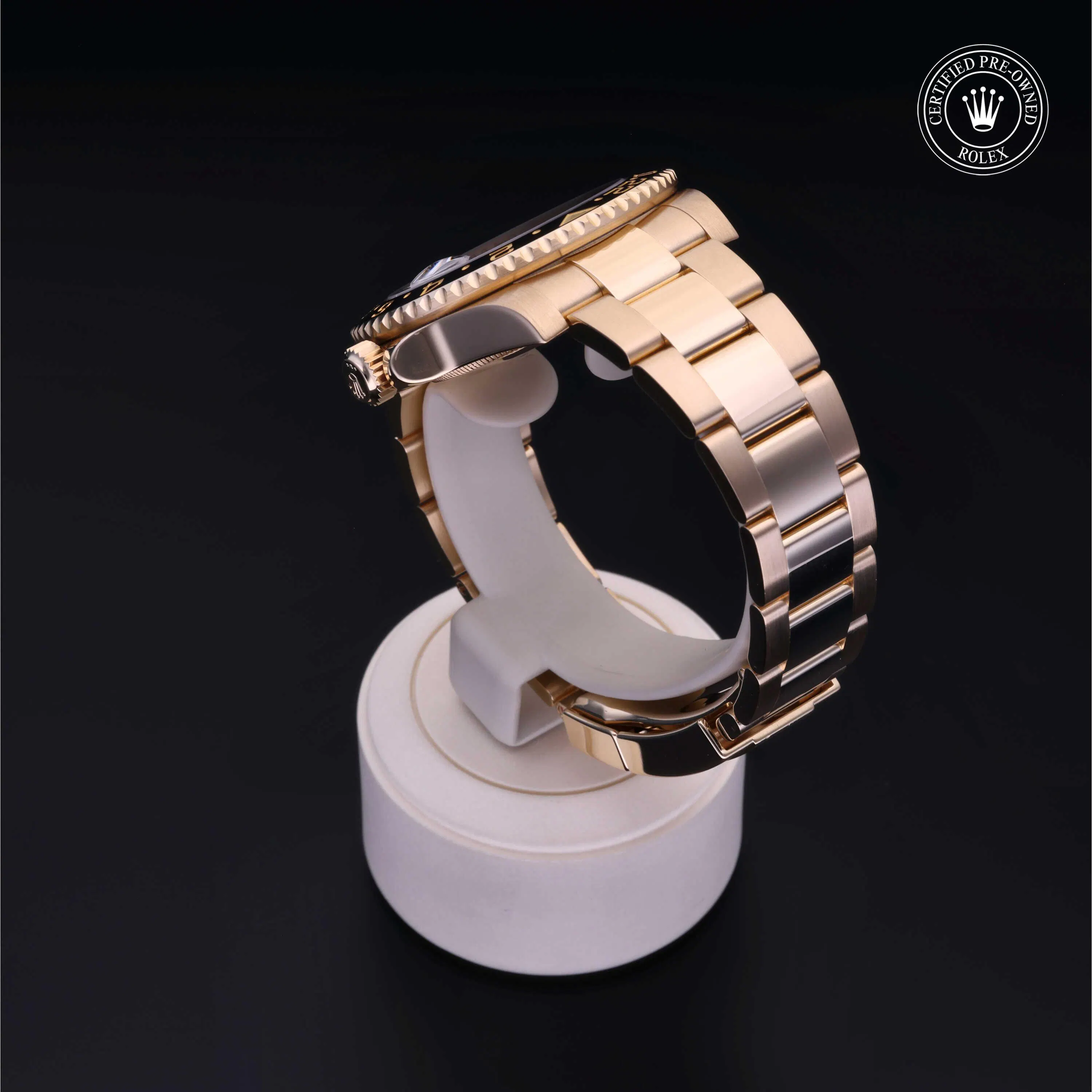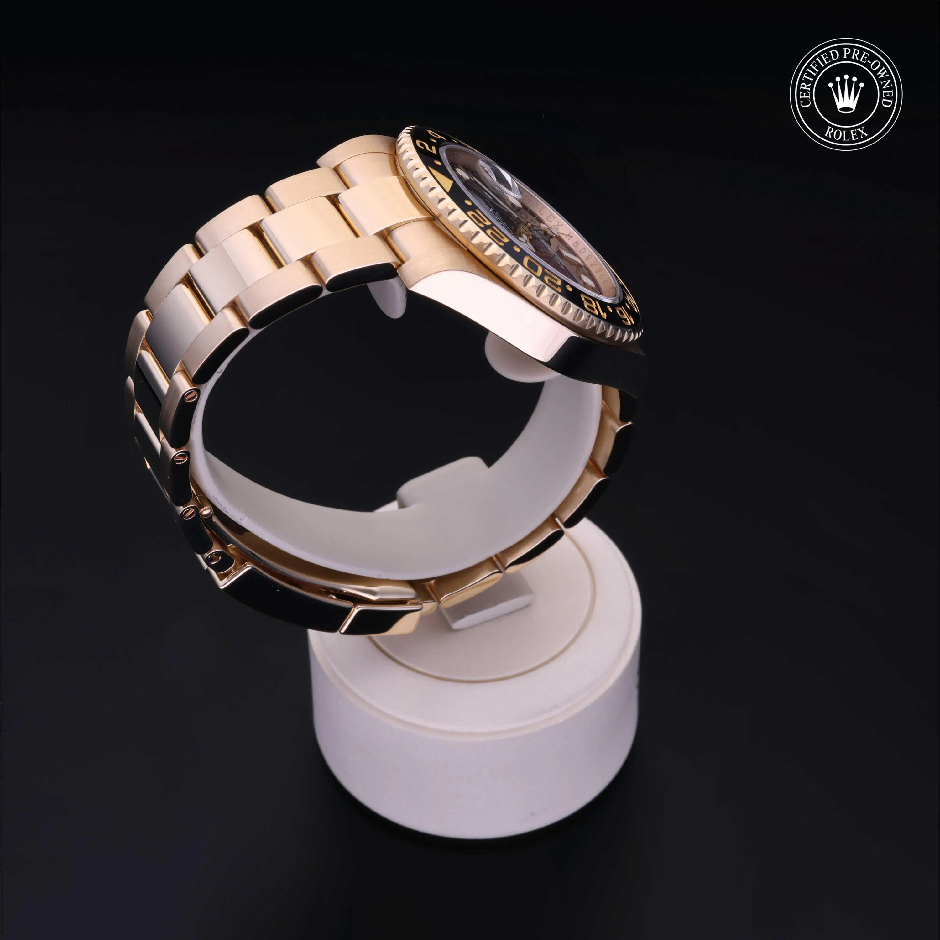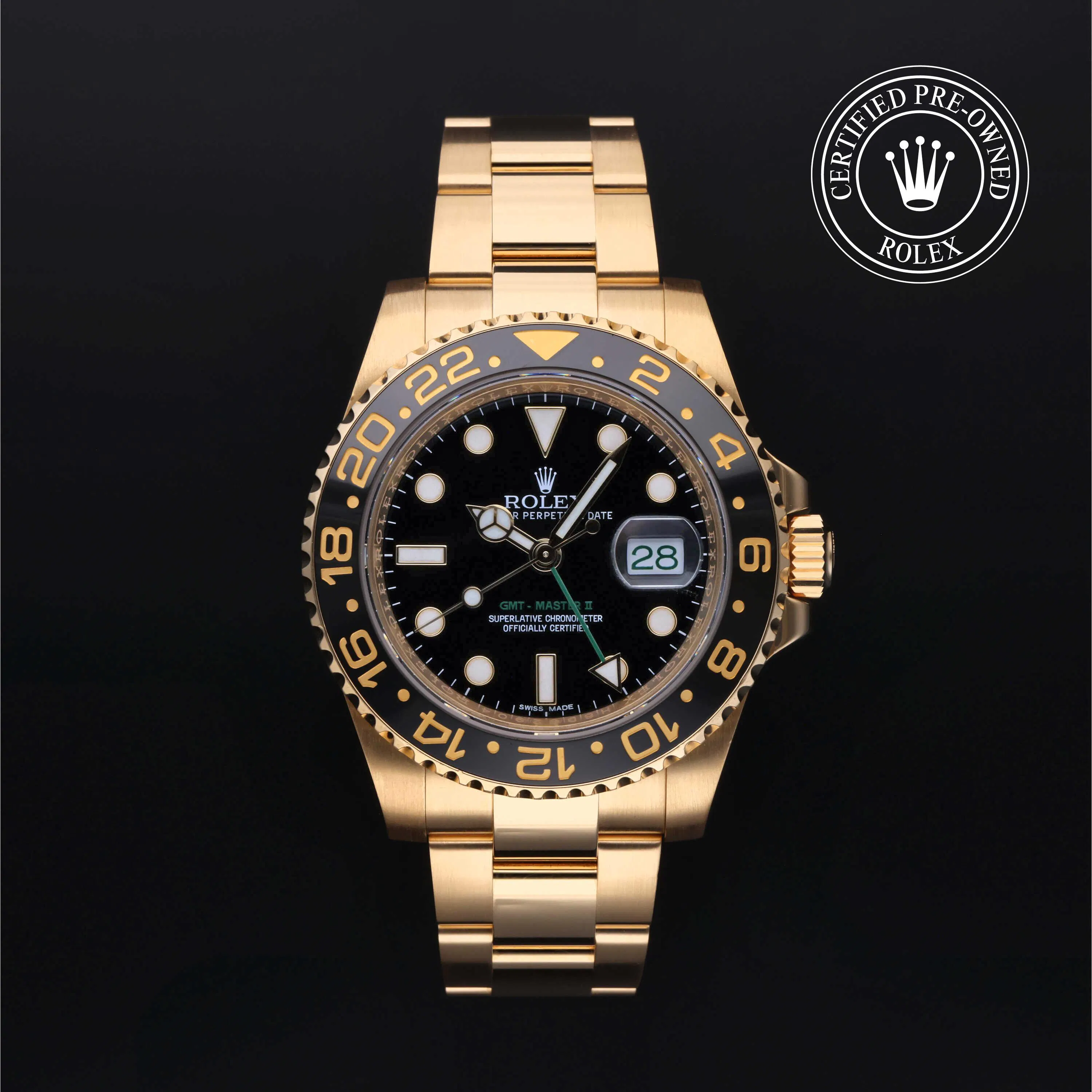 Rolex Certified Pre-Owned GMT-Master II (116718LN) self - winding automatic watch, features a 40mm 18k yellow gold case and unidirectional rotating bezel with a black cerachrom insert surrounding a black dial on an 18k yellow gold oyster bracelet. Functions include hours, minutes, seconds, date and gmt/world time. This watch has received Rolex-authorized service and certification. It comes with the original box and papers, and includes a custom Rolex Certified Pre-Owned hang tag, travel pouch and RCPO international warranty card.