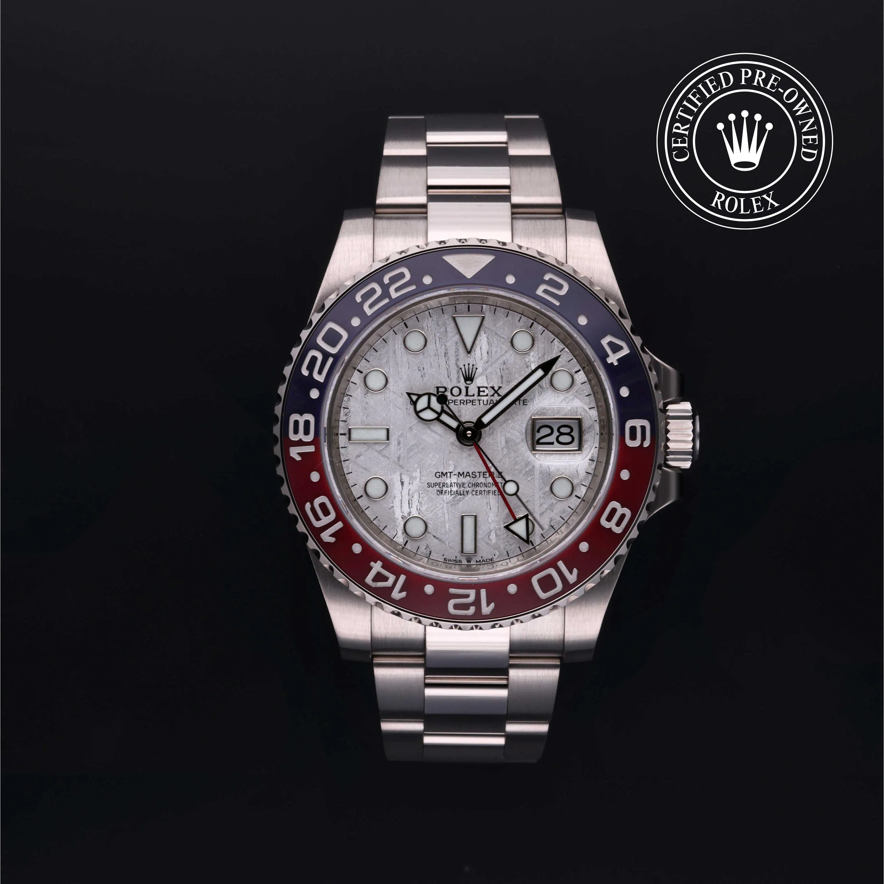 Rolex Certified Pre-Owned Rolex GMT-Master II (126719BLRO) self - winding automatic watch, features a 40mm 18k white gold case and bidirectional rotating bezel with a blue and red cerachrom insert surrounding a meteorite dial on an 18k white gold Oyster bracelet. Functions include hours, minutes, seconds, date and gmt/world time. This watch has received Rolex-authorized service and certification. It comes with the original box and papers, and includes a custom Rolex Certified Pre-Owned hang tag, travel pouch and RCPO international warranty card.