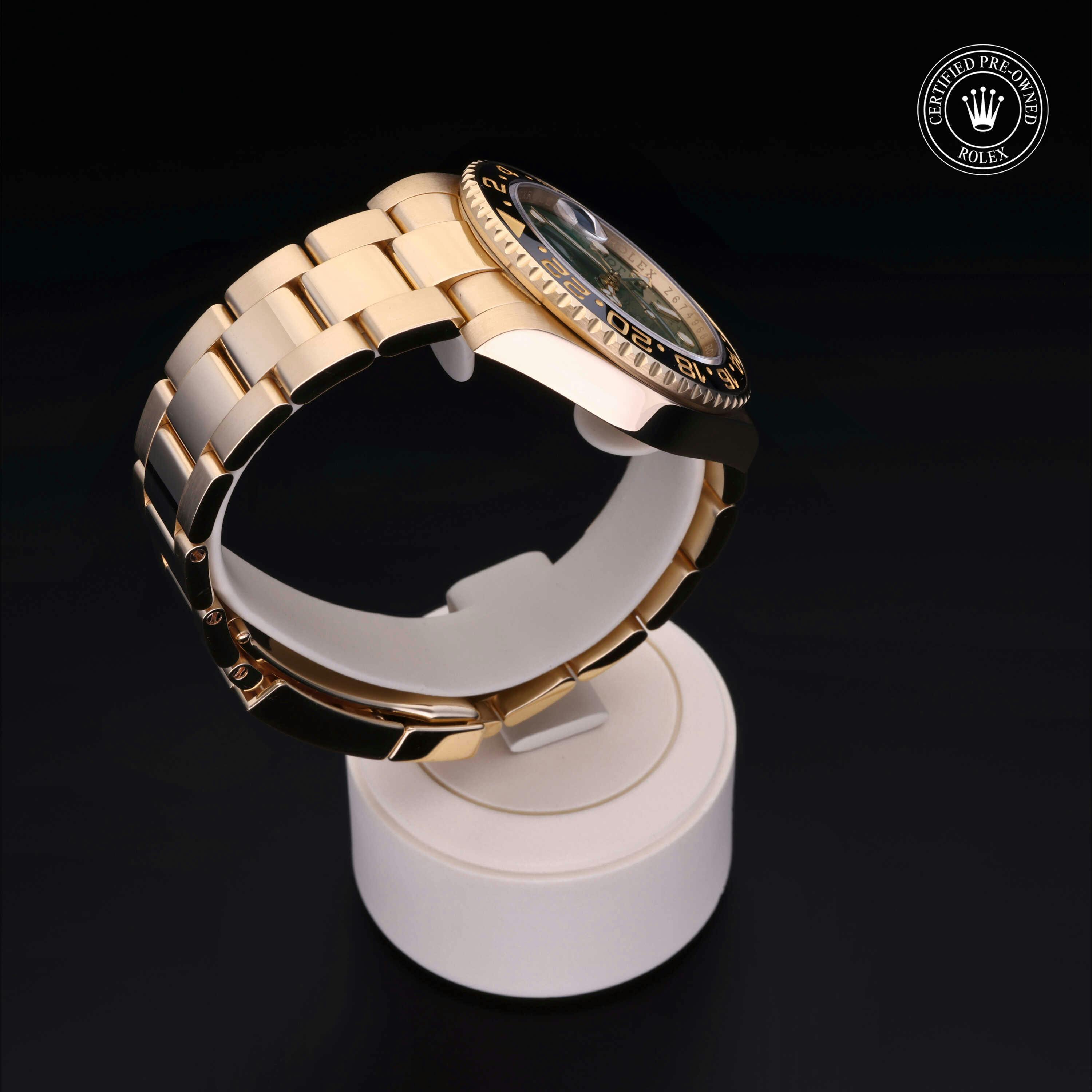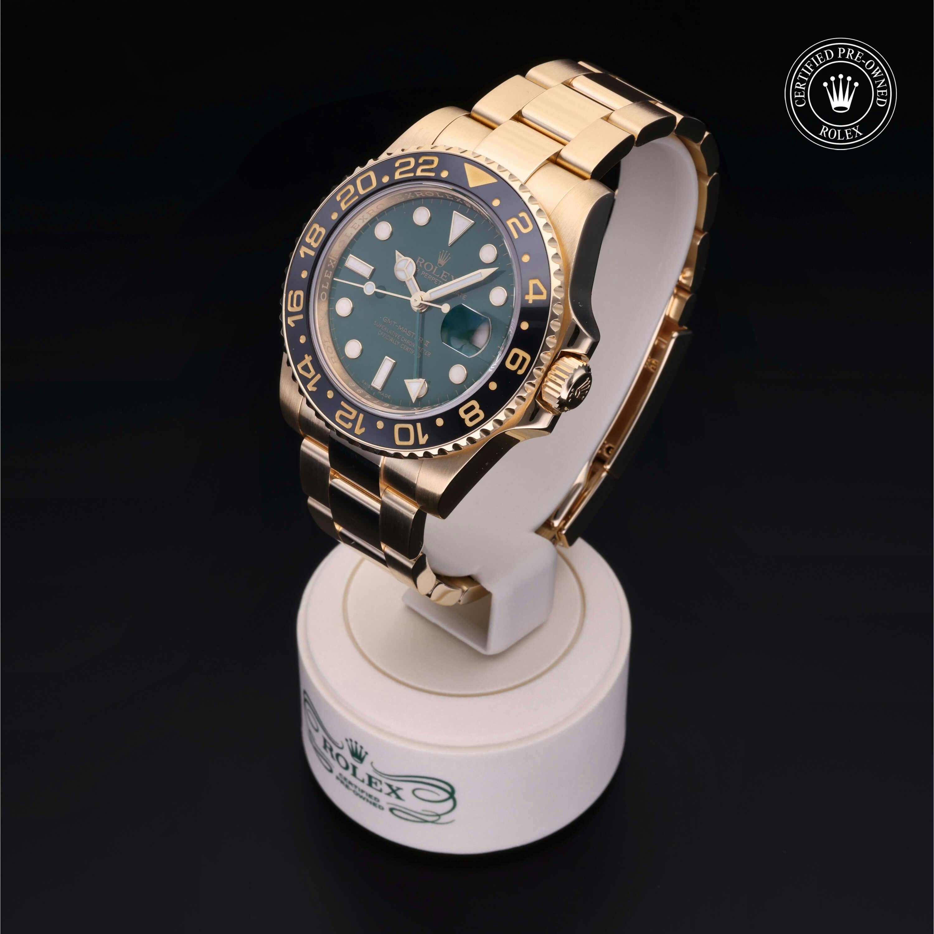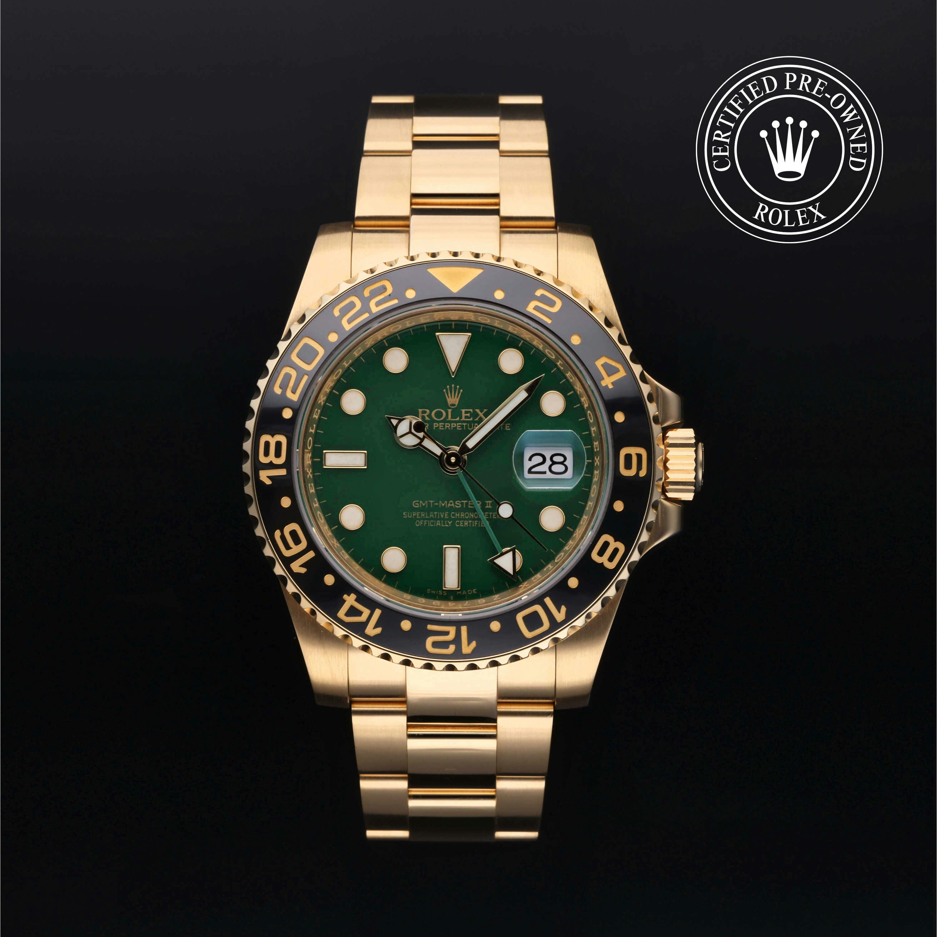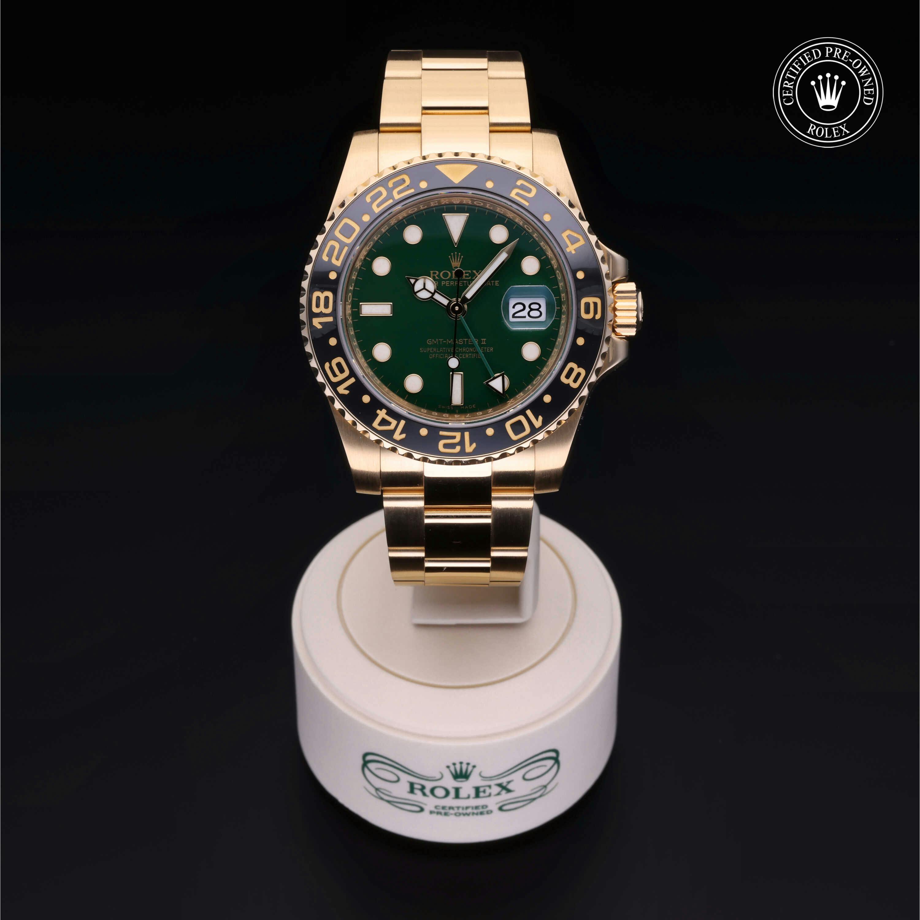 Pre-Owned Rolex GMT-Master II (116718LN) self - winding automatic watch, features a 40mm 18k yellow gold case surrounding a green dial on a strap. Functions include hours, minutes, seconds, date, gmt/world time This watch has been serviced and does not come with box or papers. Time remaining on the Manufacturer's service warranty!