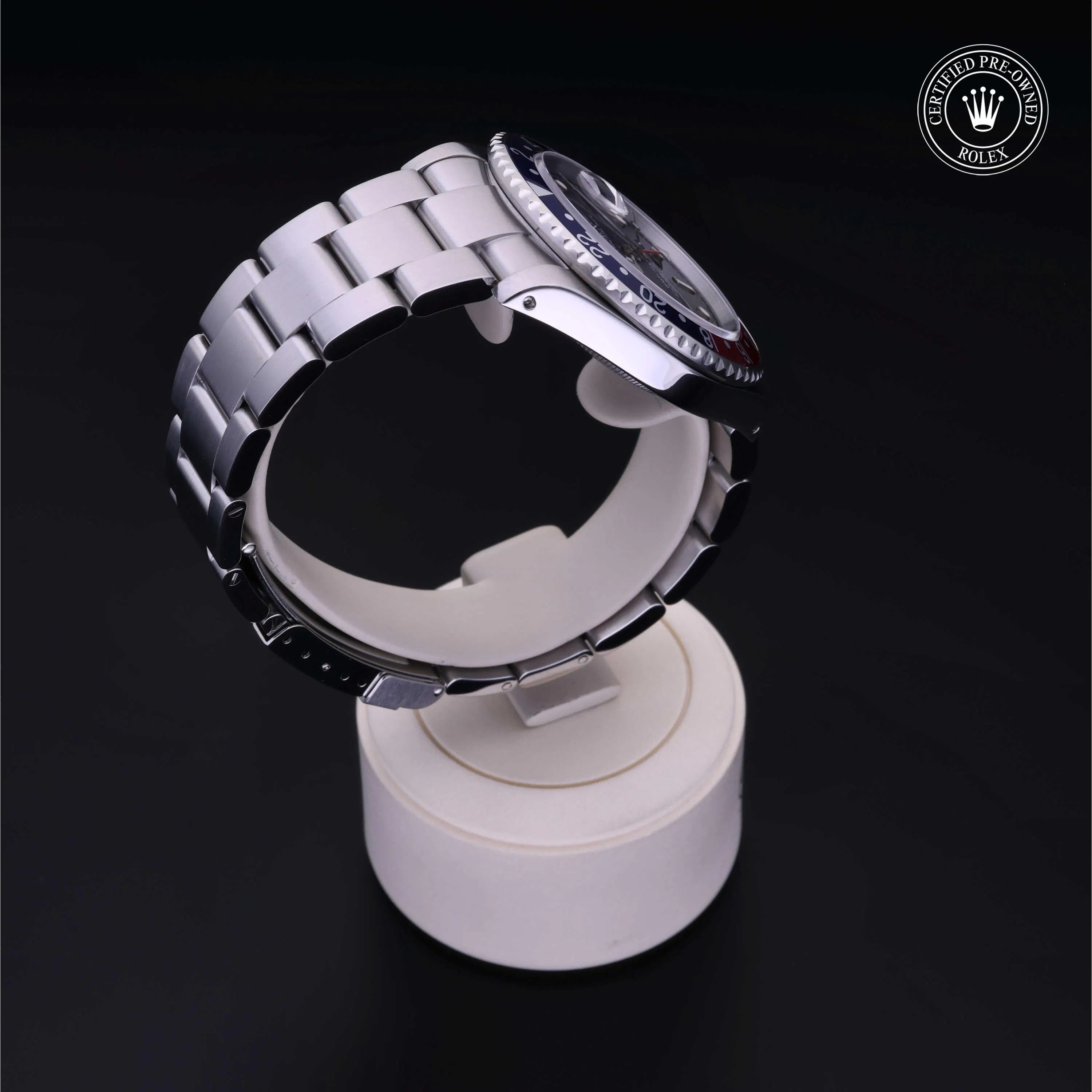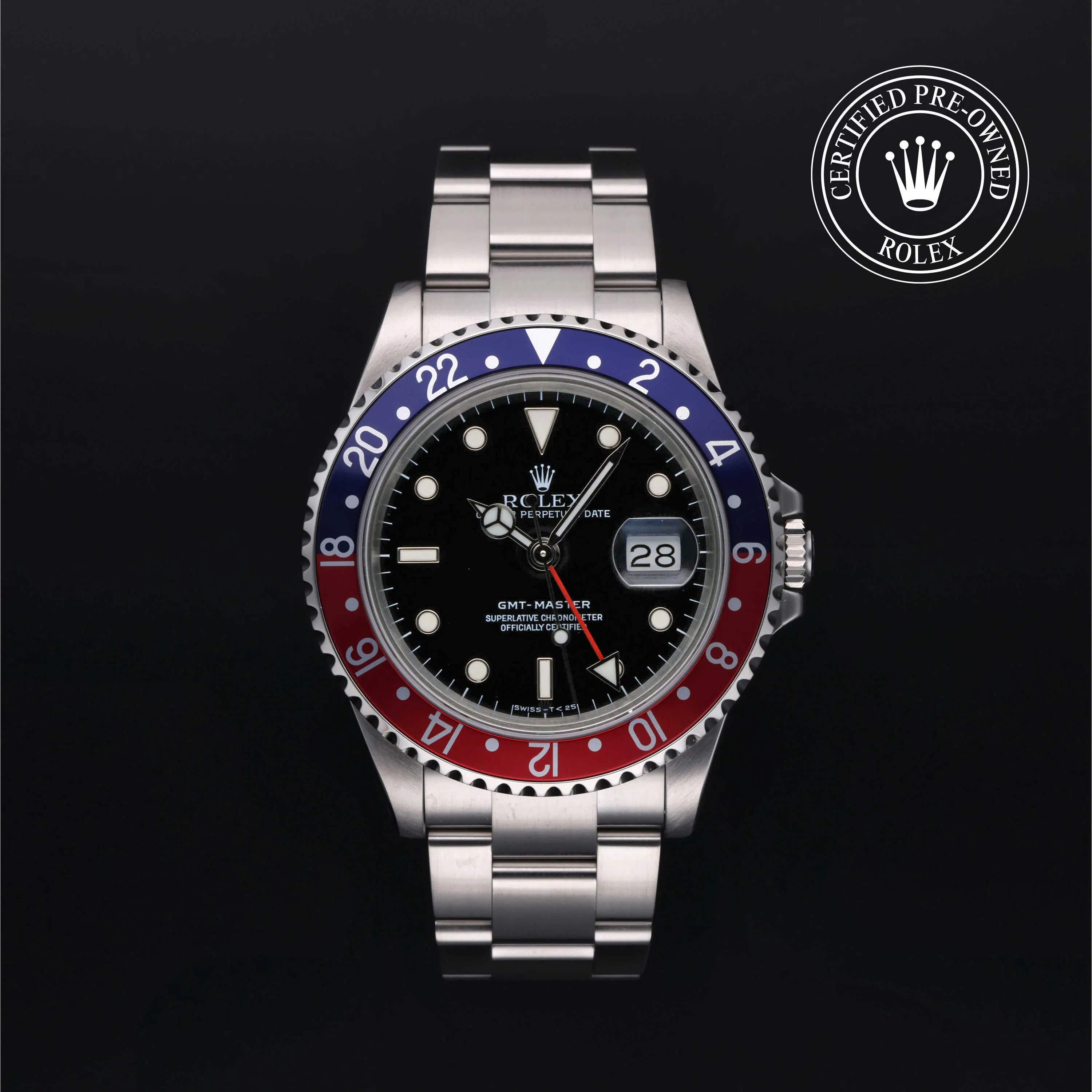 Rolex Certified Pre-Owned GMT-Master (16700) self - winding automatic watch, features a 40mm stainless steel case and rotating bezel with a blue and red aluminum insert surrounding a black dial on a stainless steel Oyster bracelet. Functions include hours, minutes, seconds, date and gmt/world time. This watch has received Rolex-authorized service and certification. It does not come with the original box or papers, but includes a custom Rolex Certified Pre-Owned hang tag, travel pouch and RCPO international warranty card.