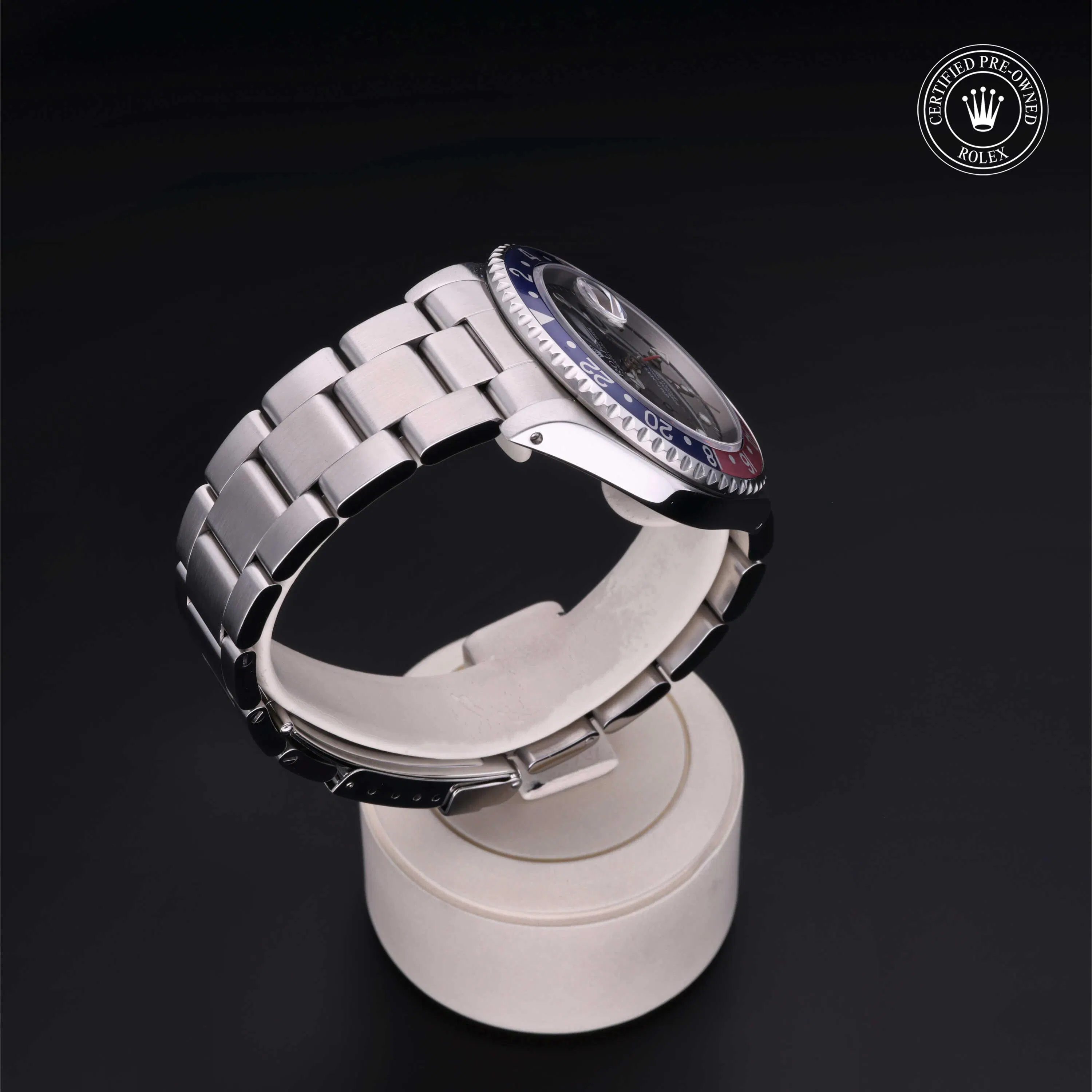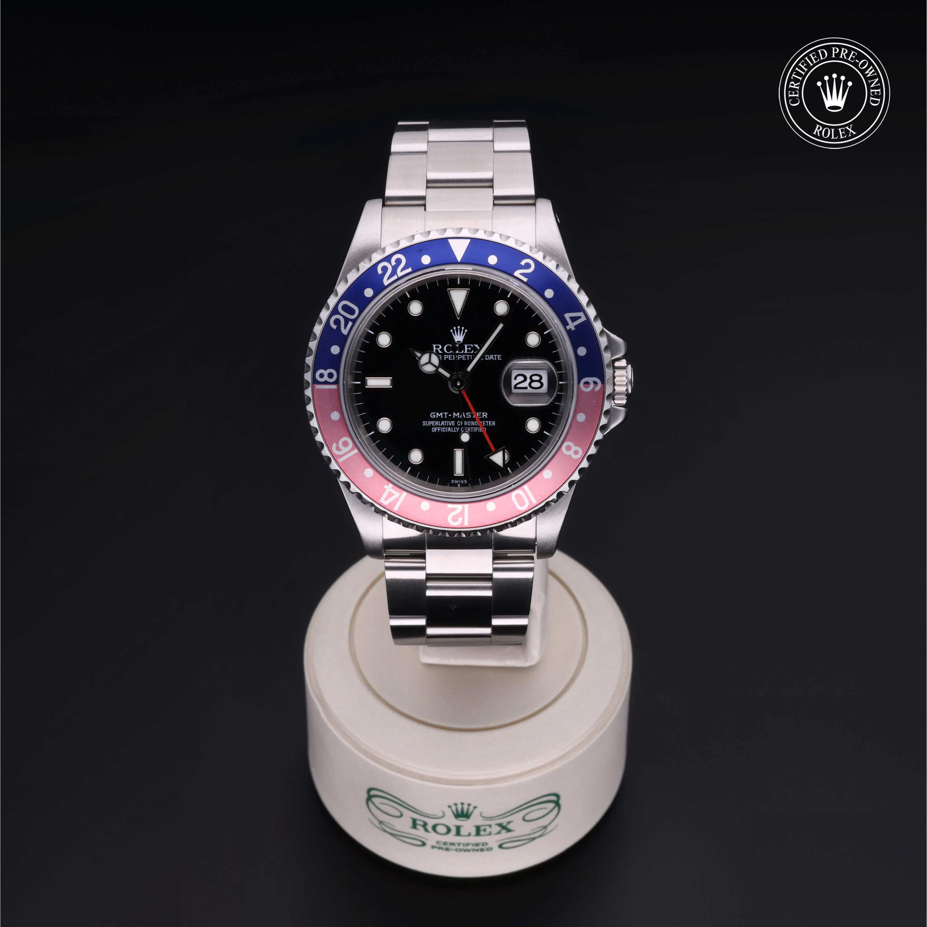 Rolex Certified Pre-Owned GMT-Master (16700) self - winding automatic watch, features a 40mm stainless steel case and rotating bezel with a blue and red aluminum insert surrounding a black dial on a stainless steel oyster bracelet. Functions include hours, minutes, seconds, date and gmt/world time. This watch has received Rolex-authorized service and certification. It comes with the original box and papers, and includes a custom Rolex Certified Pre-Owned hang tag, travel pouch and RCPO international warranty card.