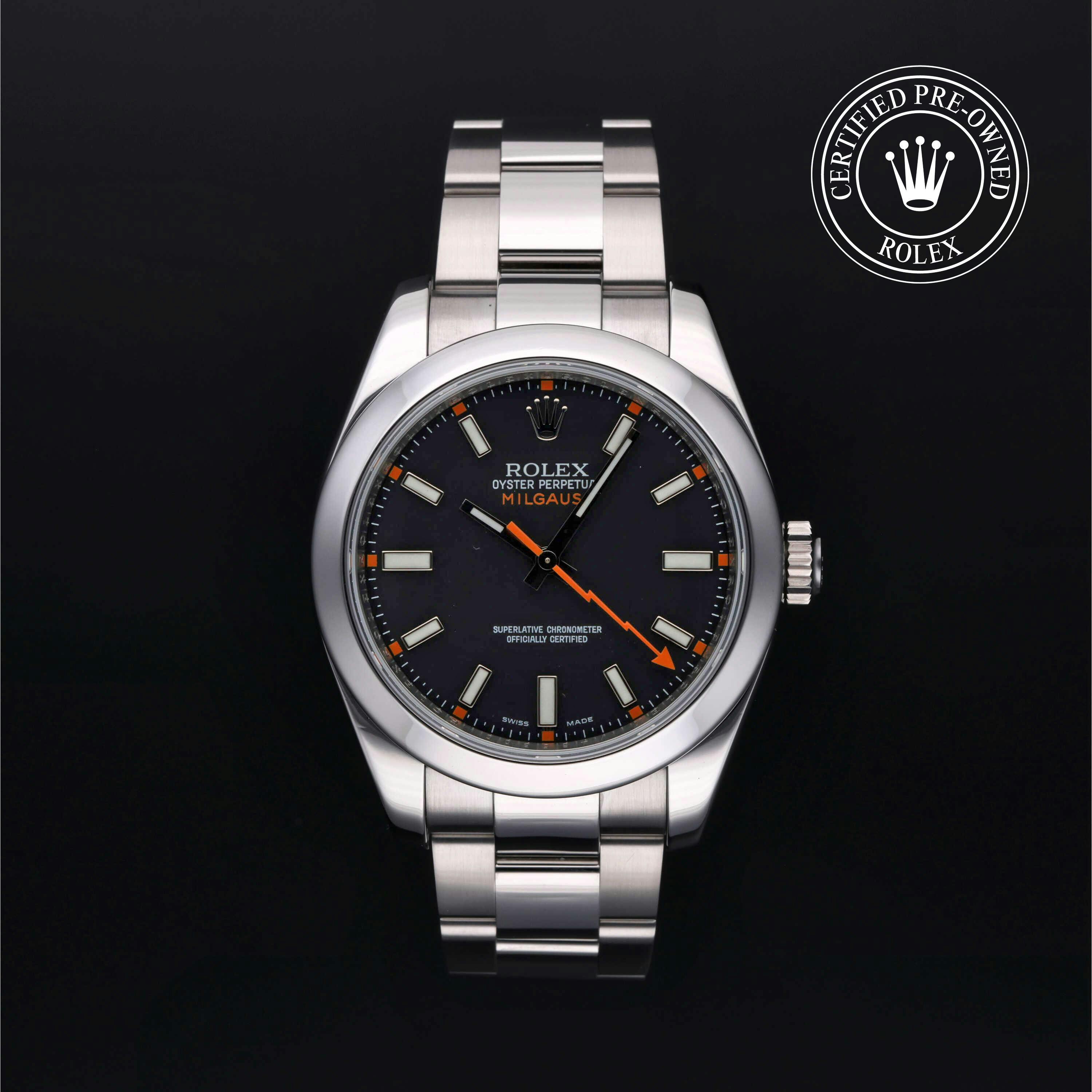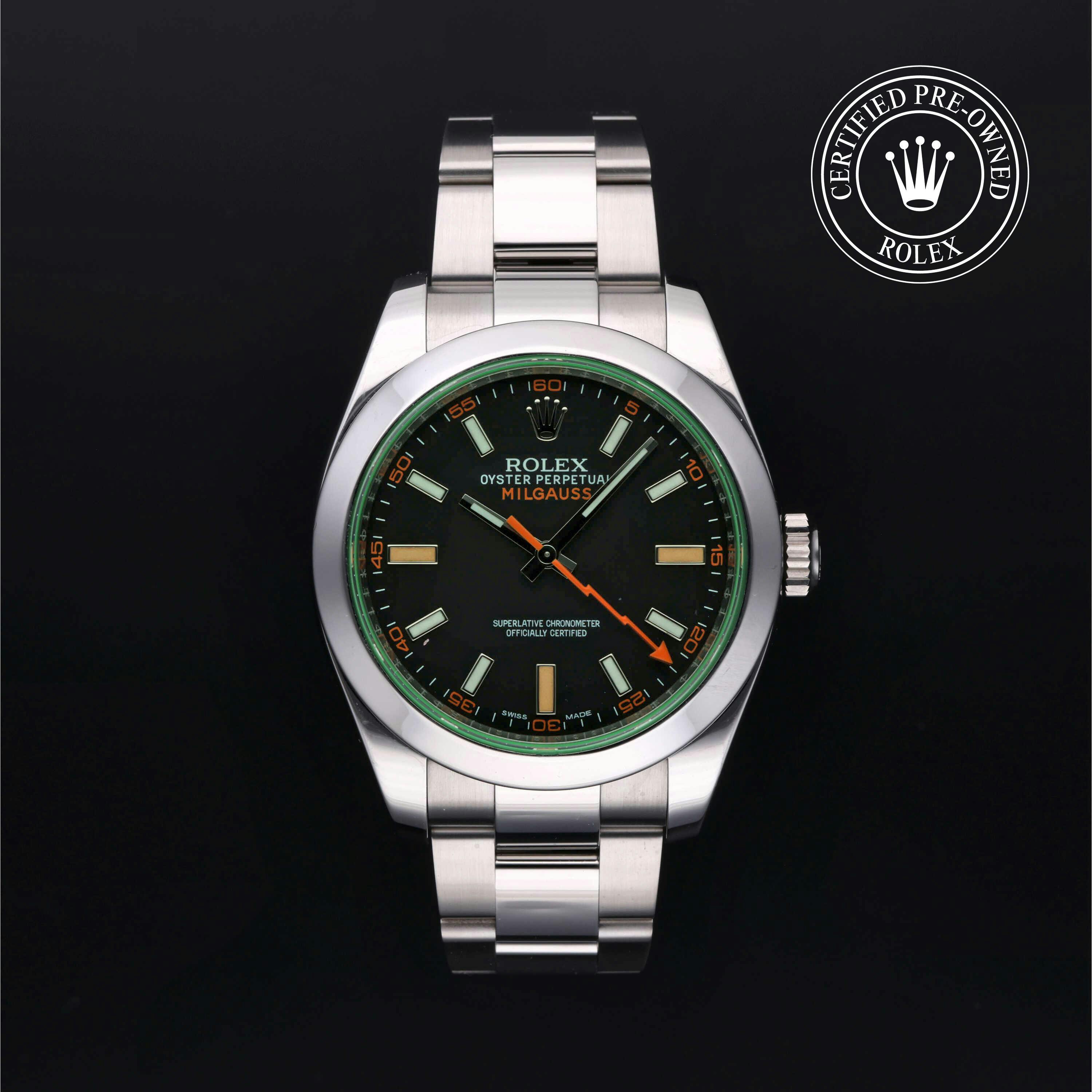 The Milgauss is as versatile as models like the Explorer and Oyster Perpetual , but it stands apart with bold features like the distinctive orange lightning bolt seconds hand and green-tinted sapphire crystal, referred to as "Glace Verte." Water-resistant to 100 meters thanks to its Twinlock crown and screw-down case back, the Milgauss is an ideal companion for daily wear or collection rotation.