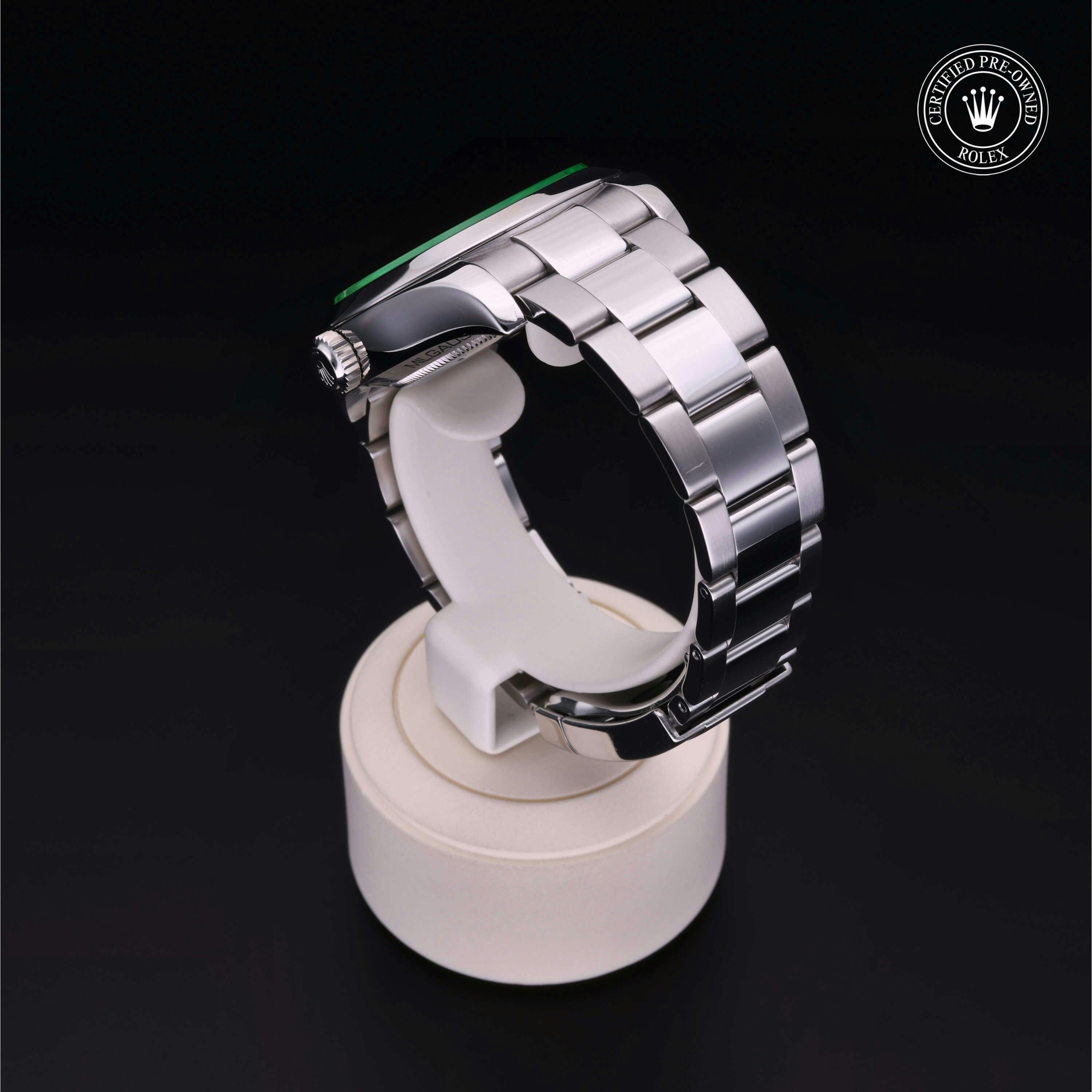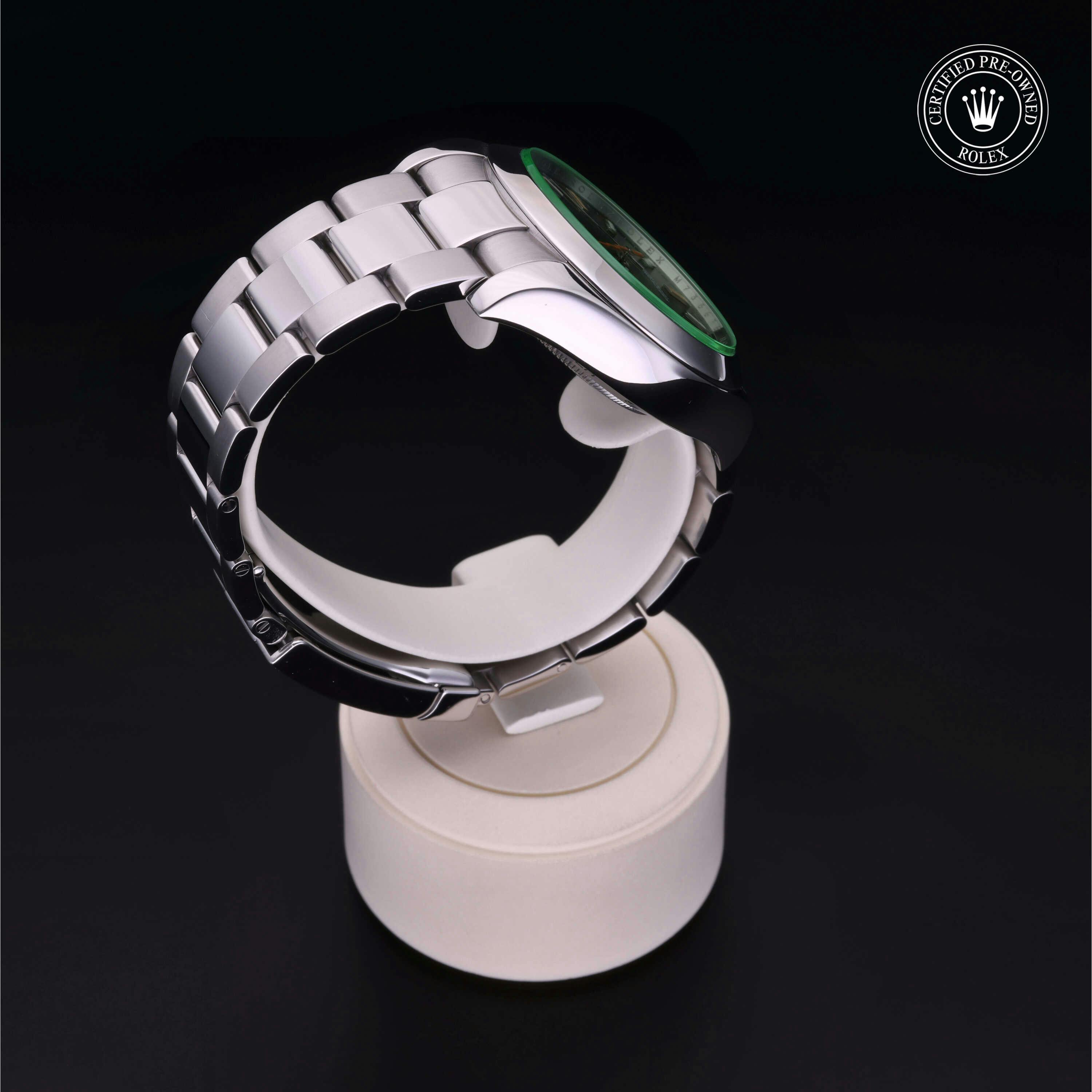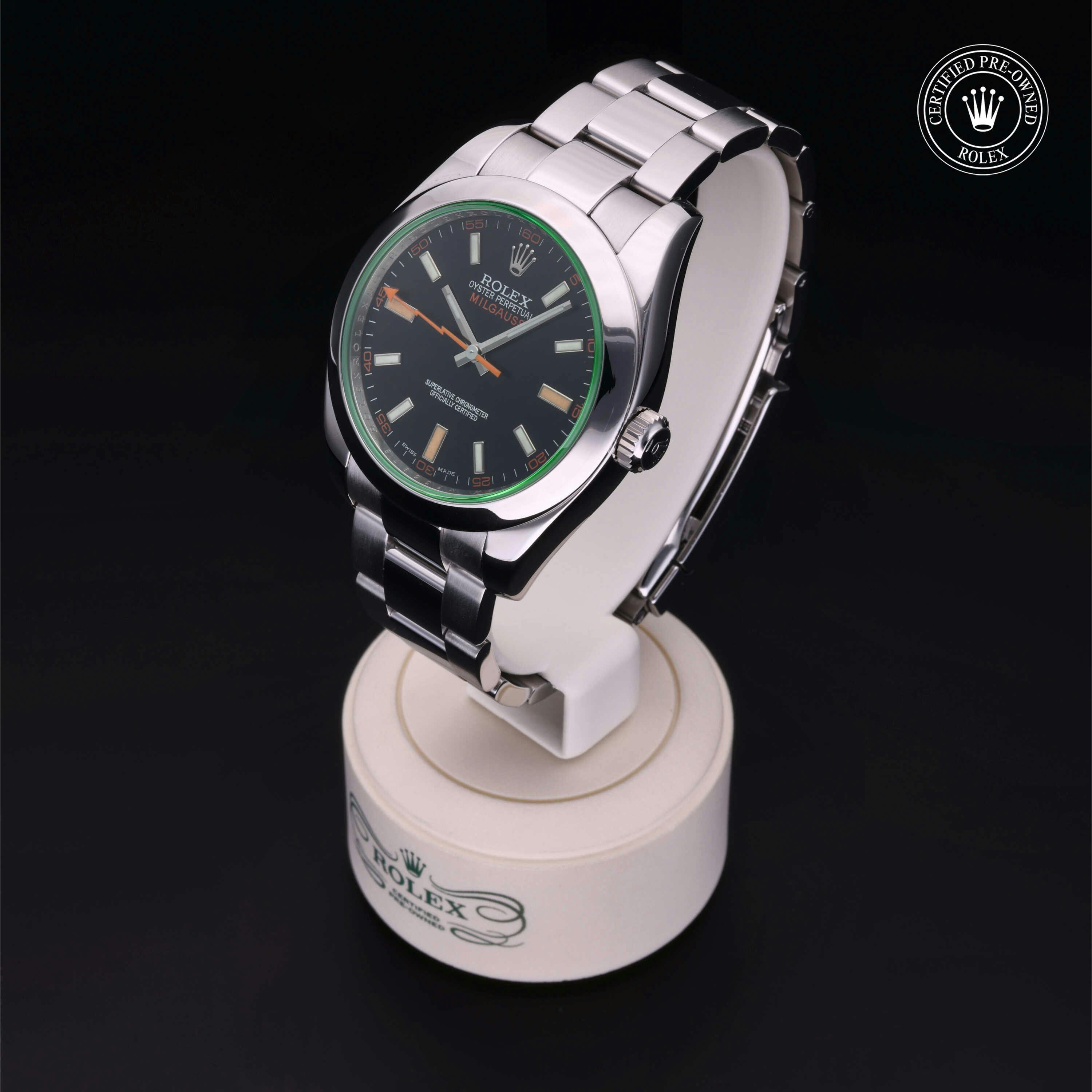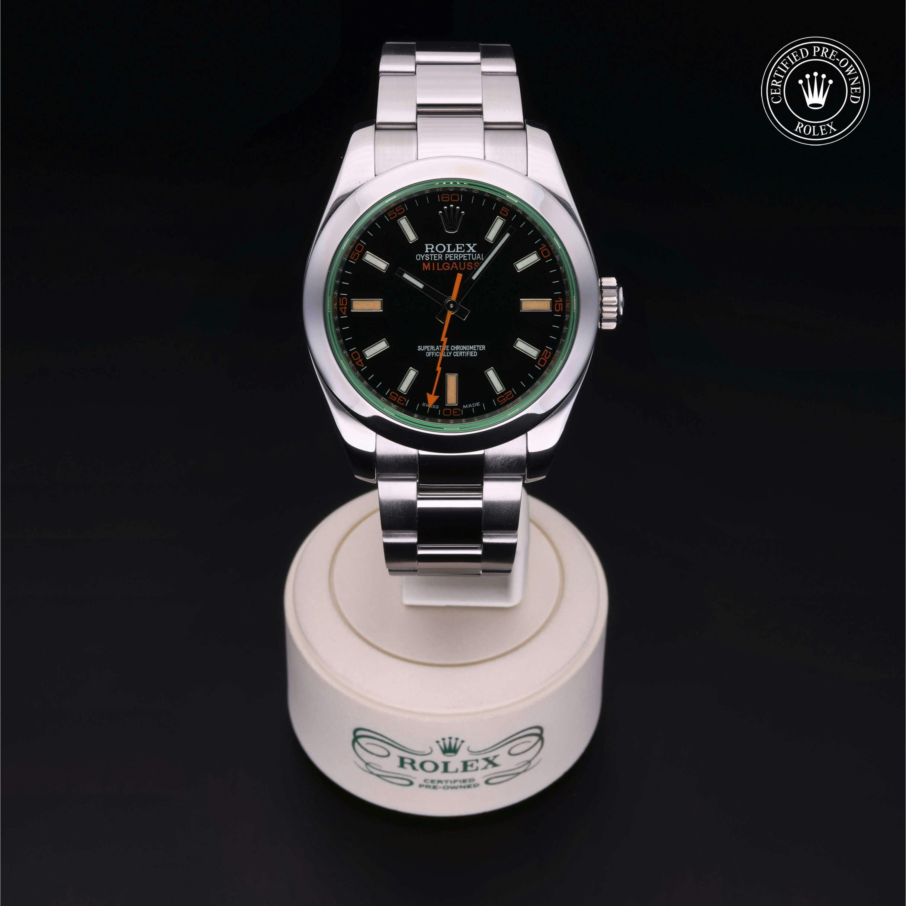 Rolex Certified Pre-Owned Milgauss (116400GV) self - winding automatic watch, features a 40mm stainless steel case surrounding a black dial underneath a green crystal. Watch is secured on a stainless steel oyster bracelet complete with a folding buckle. Functions include hours, minutes, seconds and is anti-magnetic. This watch has been serviced by an authorized Rolex service center and certified by Rolex. It does not come with the original box or papers, but includes a custom Rolex Certified Pre-Owned hang tag, travel pouch and international warranty card.