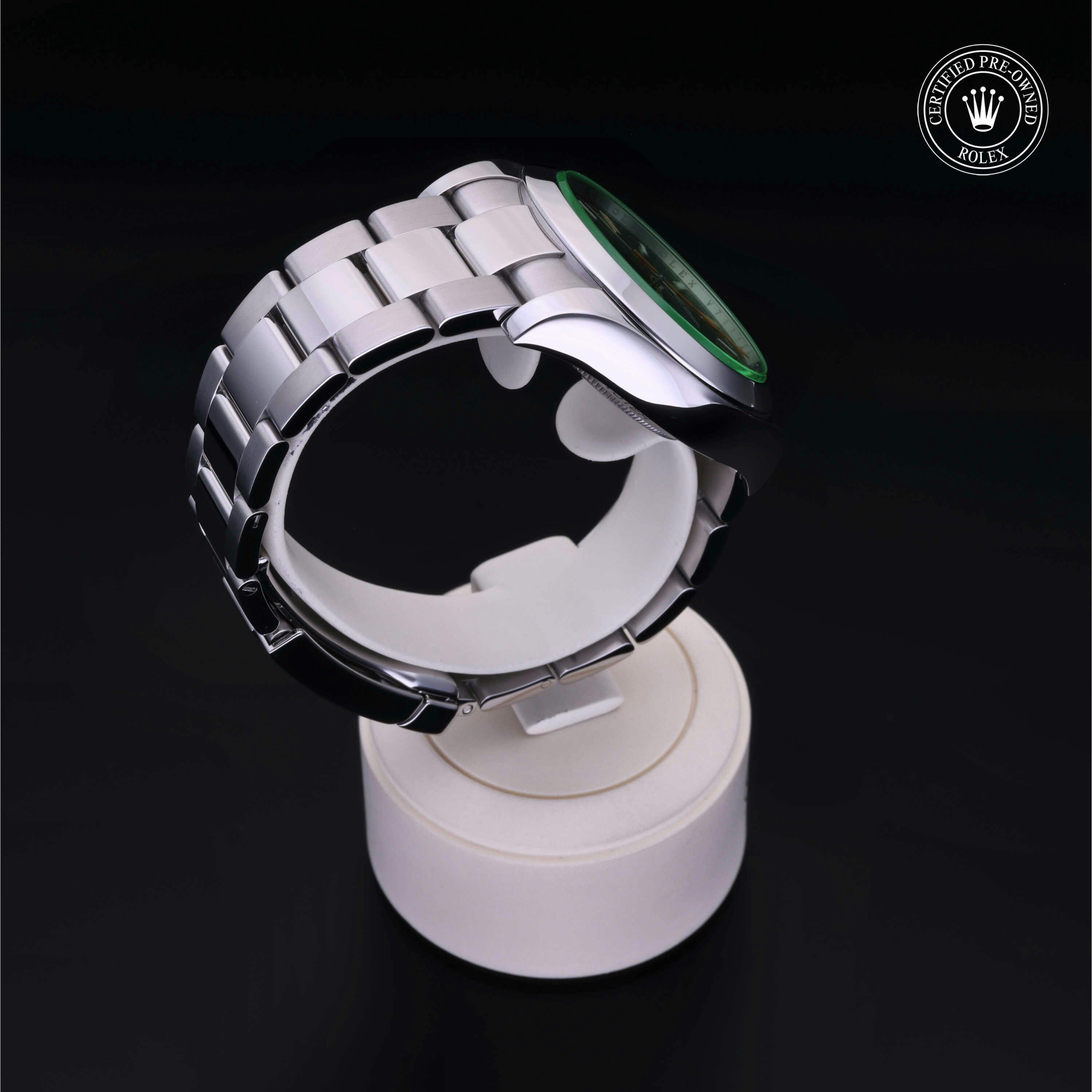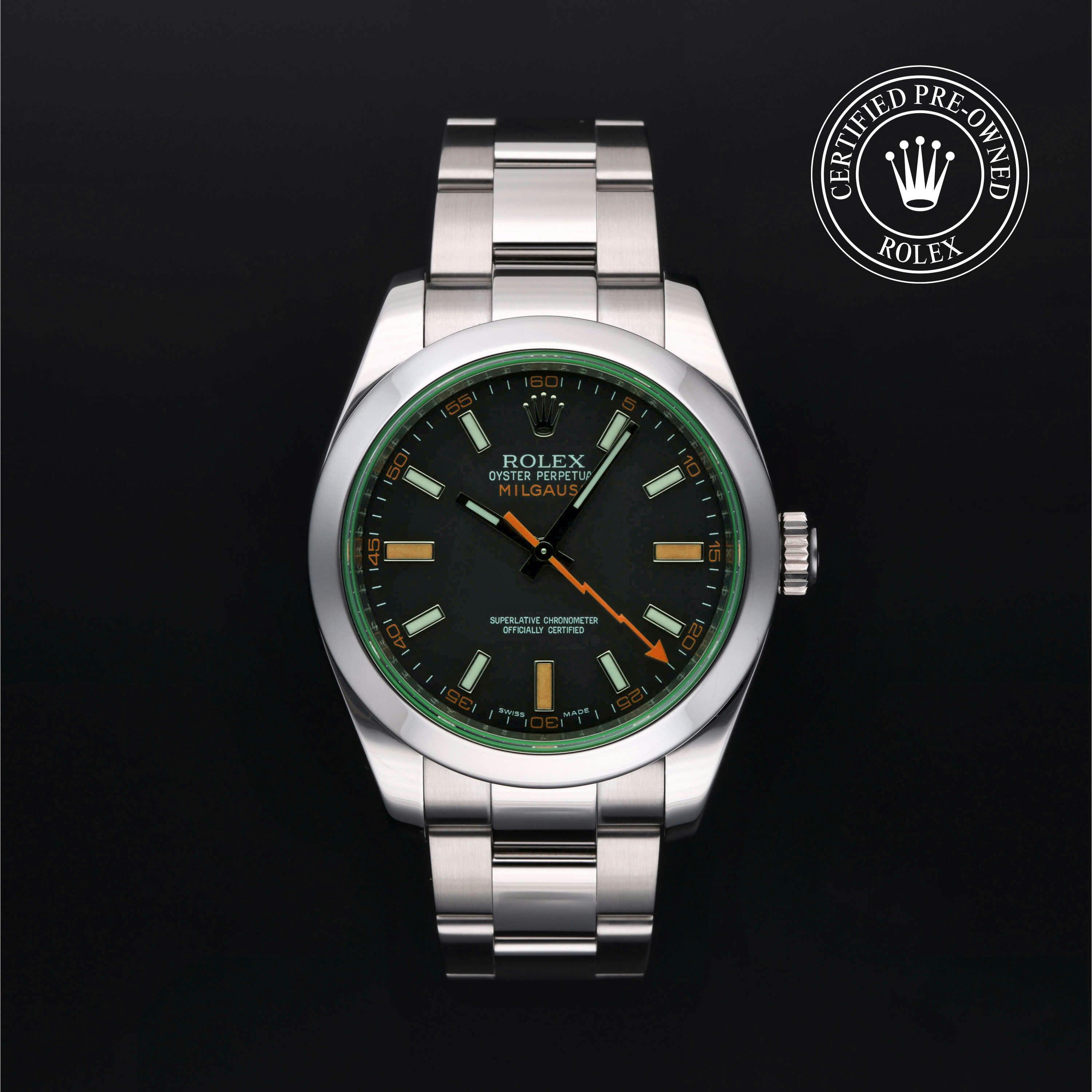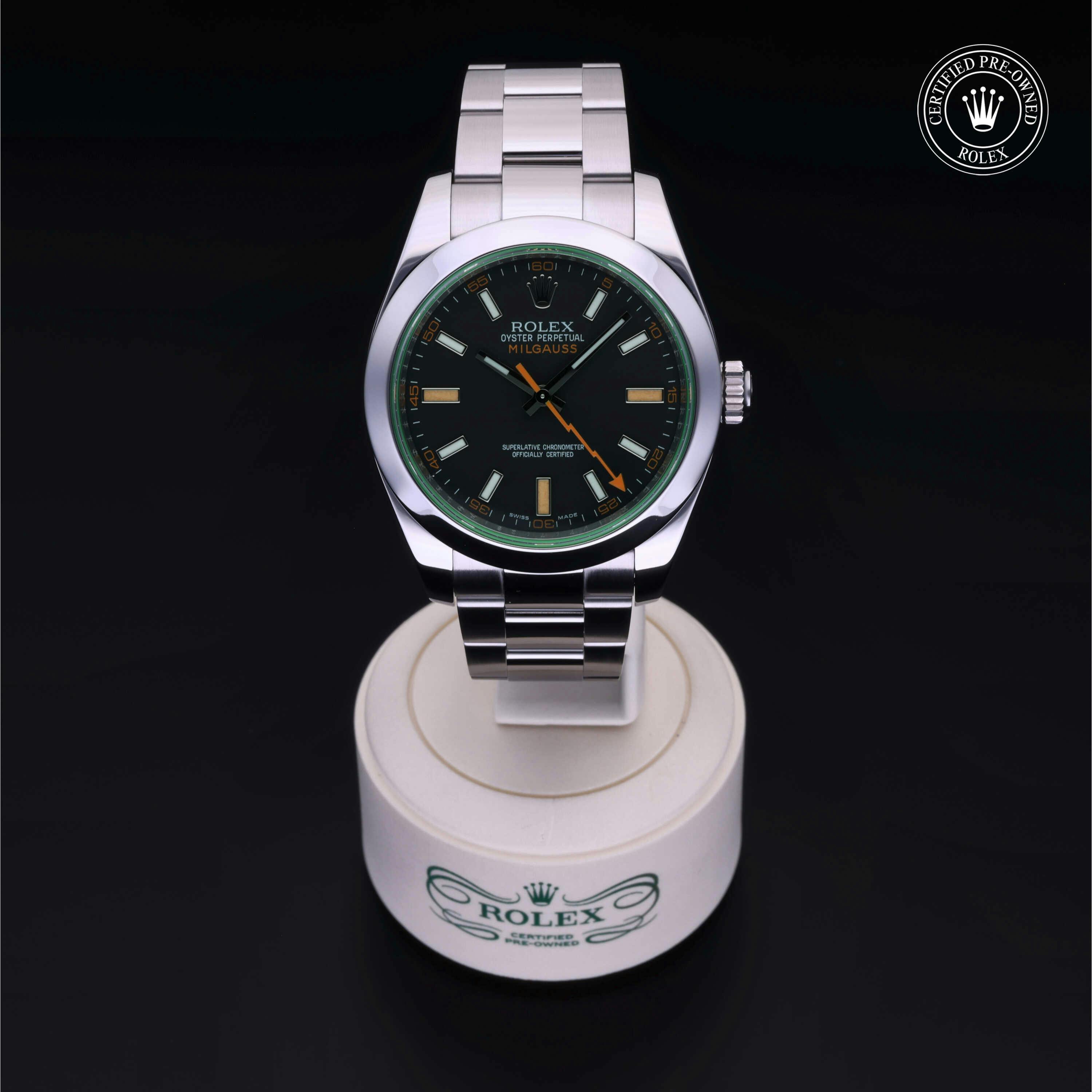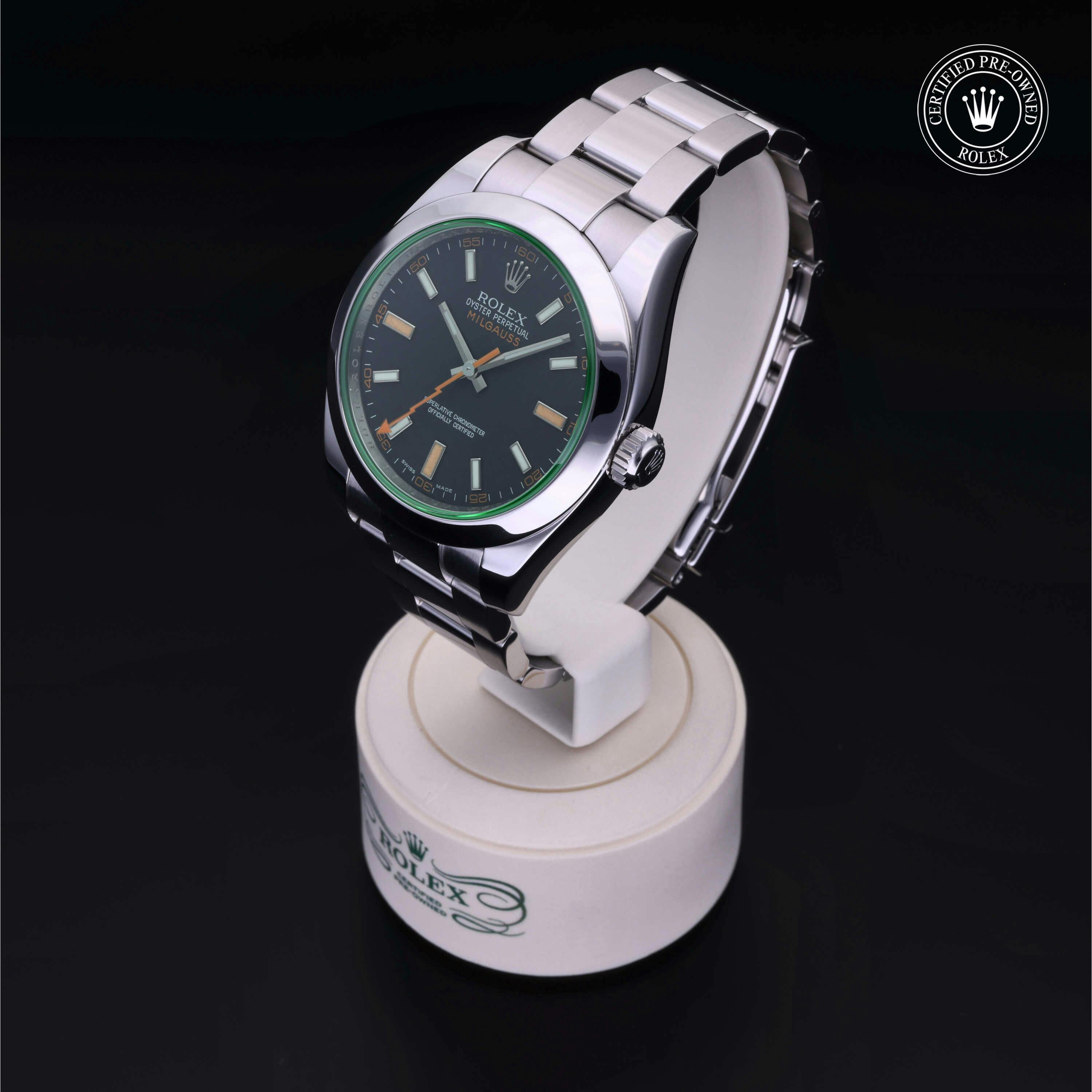 Rolex Certified Pre-Owned Milgauss (116400GV) self - winding automatic watch, features a 40mm stainless steel case and smooth bezel surrounding an intense black dial with a green sapphire crystal on a stainless steel oyster bracelet. Functions include hours, minutes, seconds and anti-magnetic. This watch has received Rolex-authorized service and certification. It does not come with the original box or papers, but includes a custom Rolex Certified Pre-Owned hang tag, travel pouch and RCPO international warranty card.