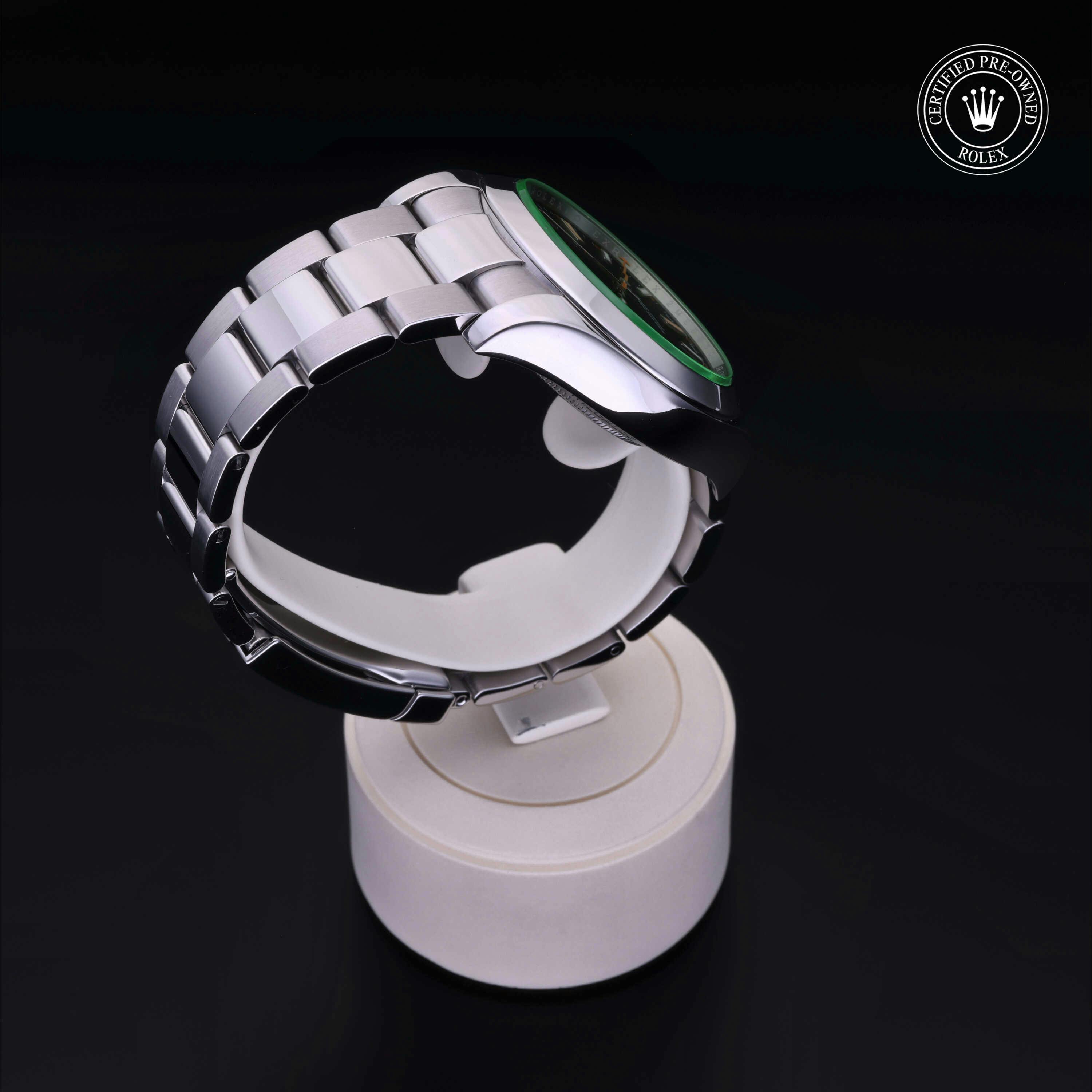 Rolex Certified Pre-Owned Milgauss (116400GV) self - winding automatic watch, features a 40mm stainless steel case and smooth bezel surrounding an intense black dial with a green sapphire crystal on a stainless steel oyster bracelet. Functions include hours, minutes, seconds and anti-magnetic. This watch has received Rolex-authorized service and certification. It does not come with the original box or papers, but includes a custom Rolex Certified Pre-Owned hang tag, travel pouch and RCPO international warranty card.