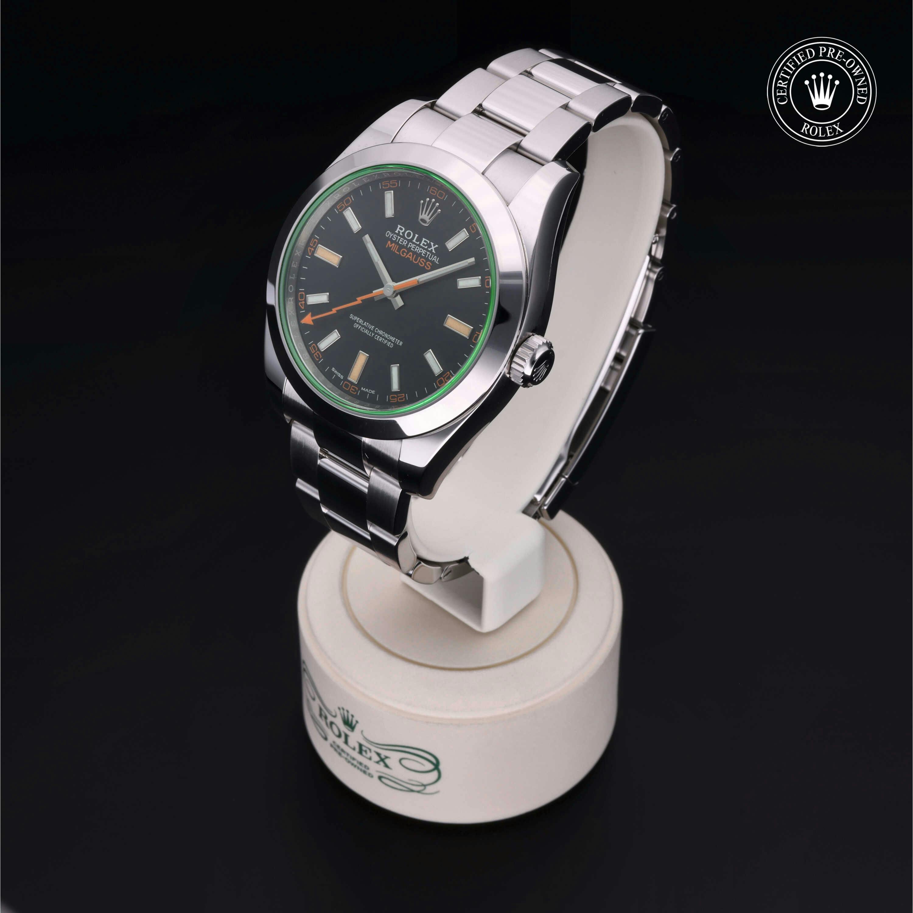 Rolex Certified Pre-Owned Milgauss (116400GV) self - winding automatic watch, features a 40mm stainless steel case and smooth bezel surrounding an intense black dial with a green crystal on a stainless steel oyster bracelet. Functions include hours, minutes, seconds and anti-magnetic. This watch has received Rolex-authorized service and certification. It comes with the original box and papers and includes a custom Rolex Certified Pre-Owned hang tag, travel pouch and RCPO international warranty card.