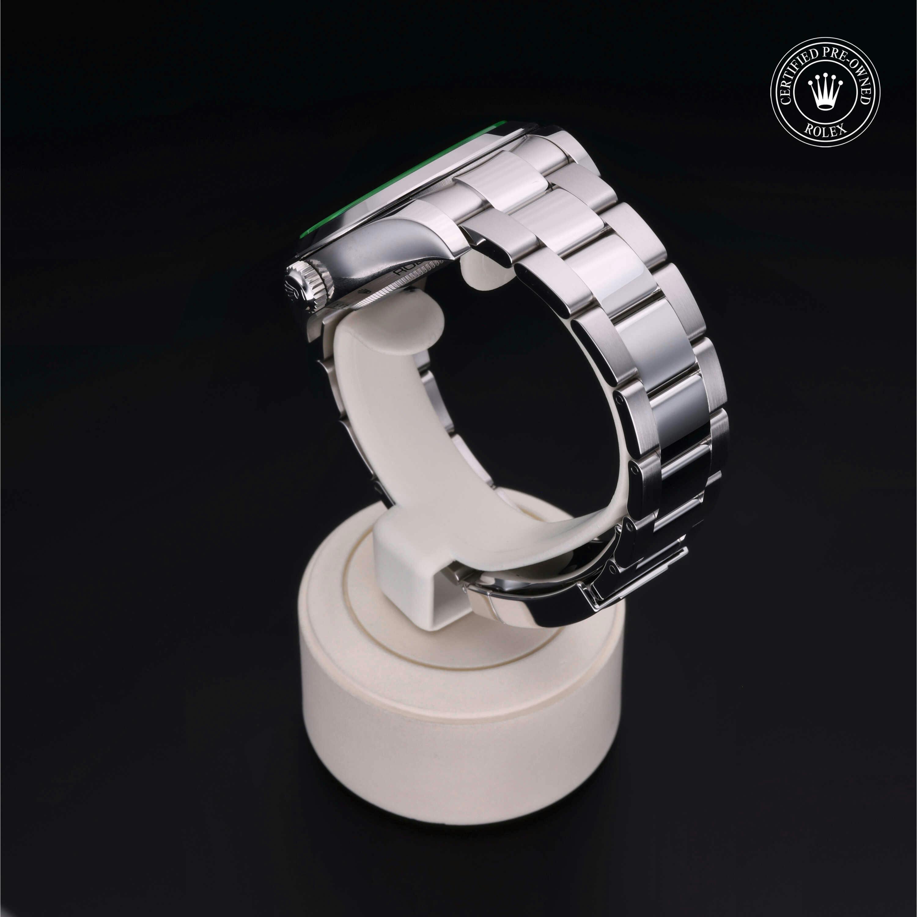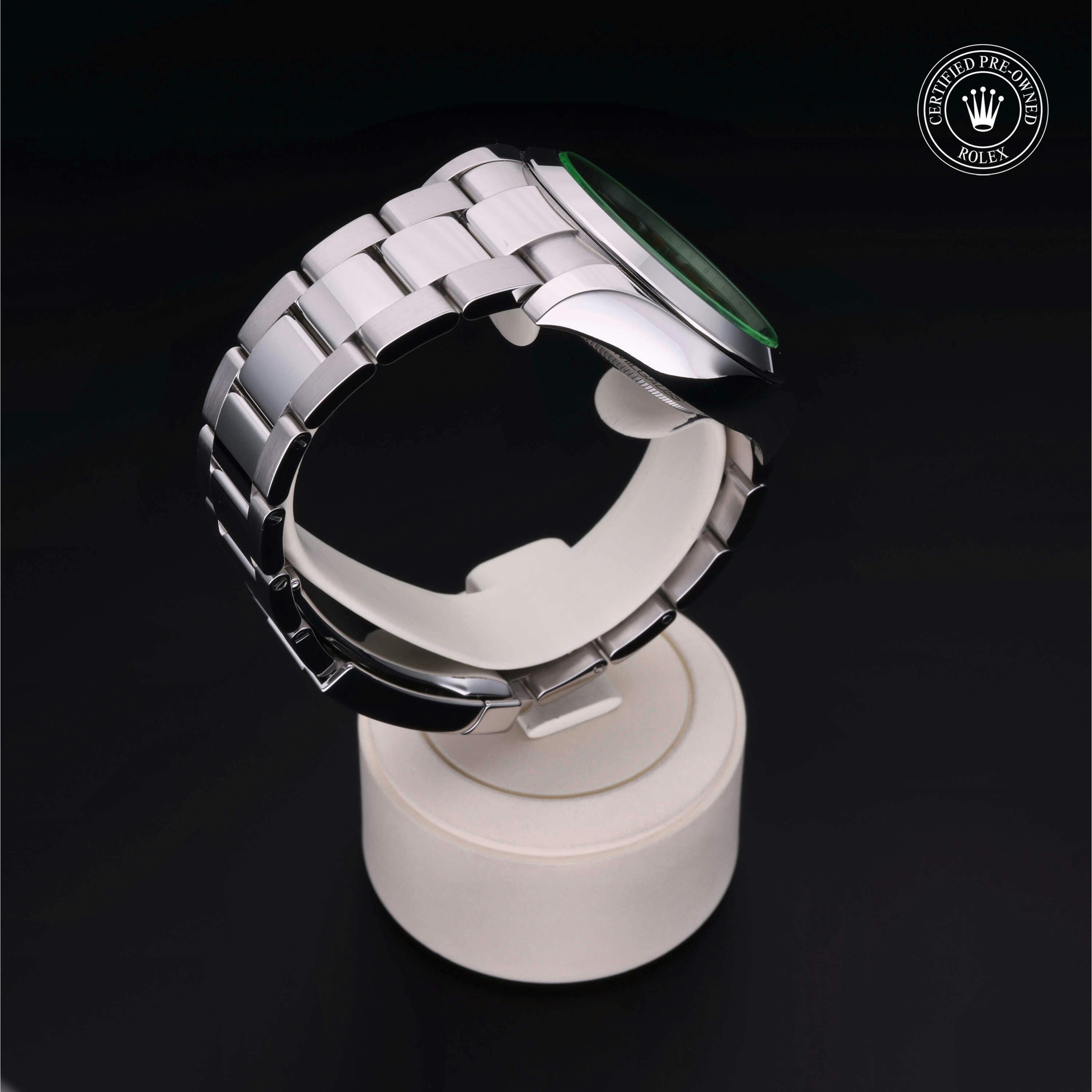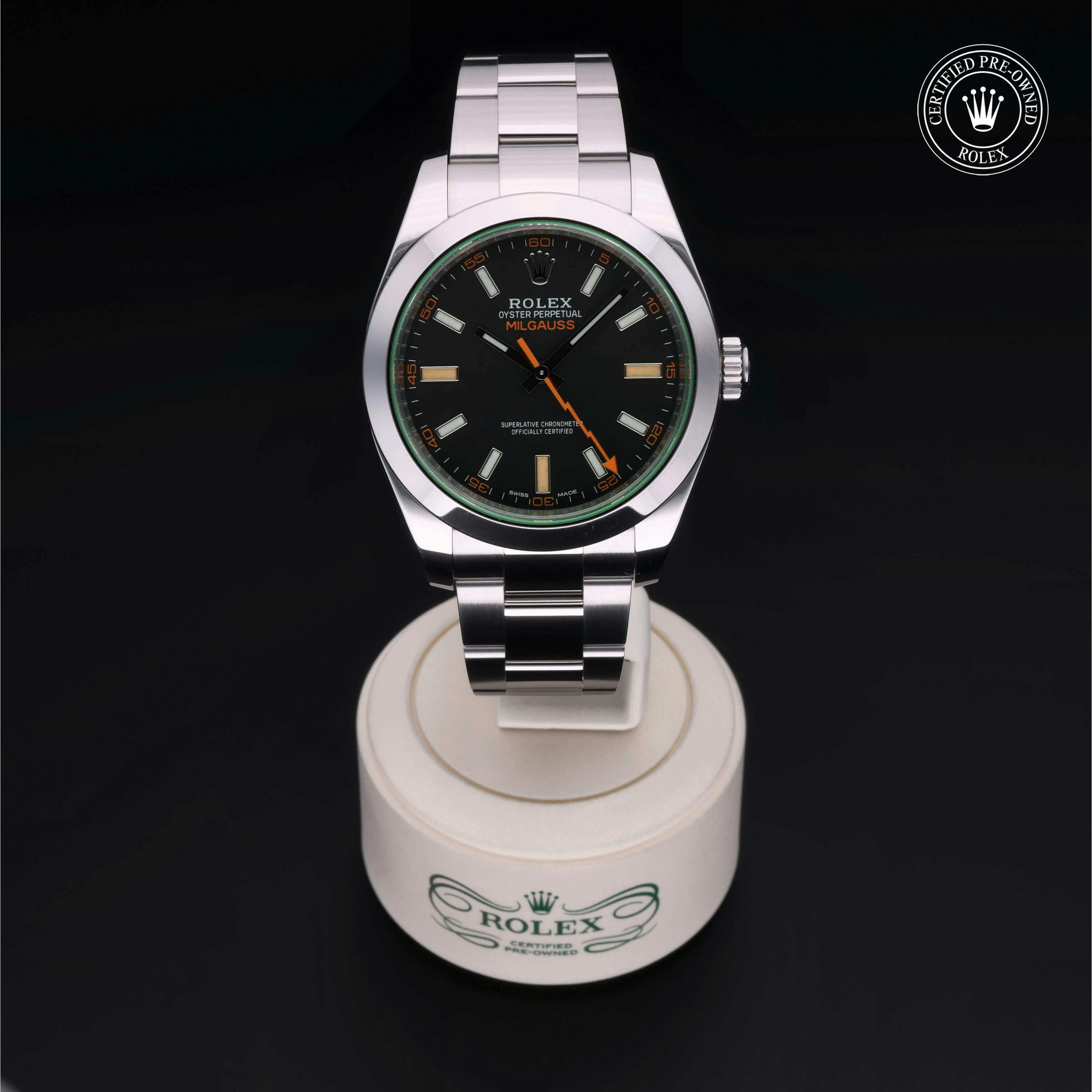 Rolex Certified Pre-Owned Milgauss (116400GV) self - winding automatic watch, features a 40mm stainless steel case and smooth bezel surrounding an intense black dial with a green crystal on a stainless steel oyster bracelet. Functions include hours, minutes, seconds and anti-magnetic. This watch has received Rolex-authorized service and certification. It comes with the original box and papers and includes a custom Rolex Certified Pre-Owned hang tag, travel pouch and RCPO international warranty card.