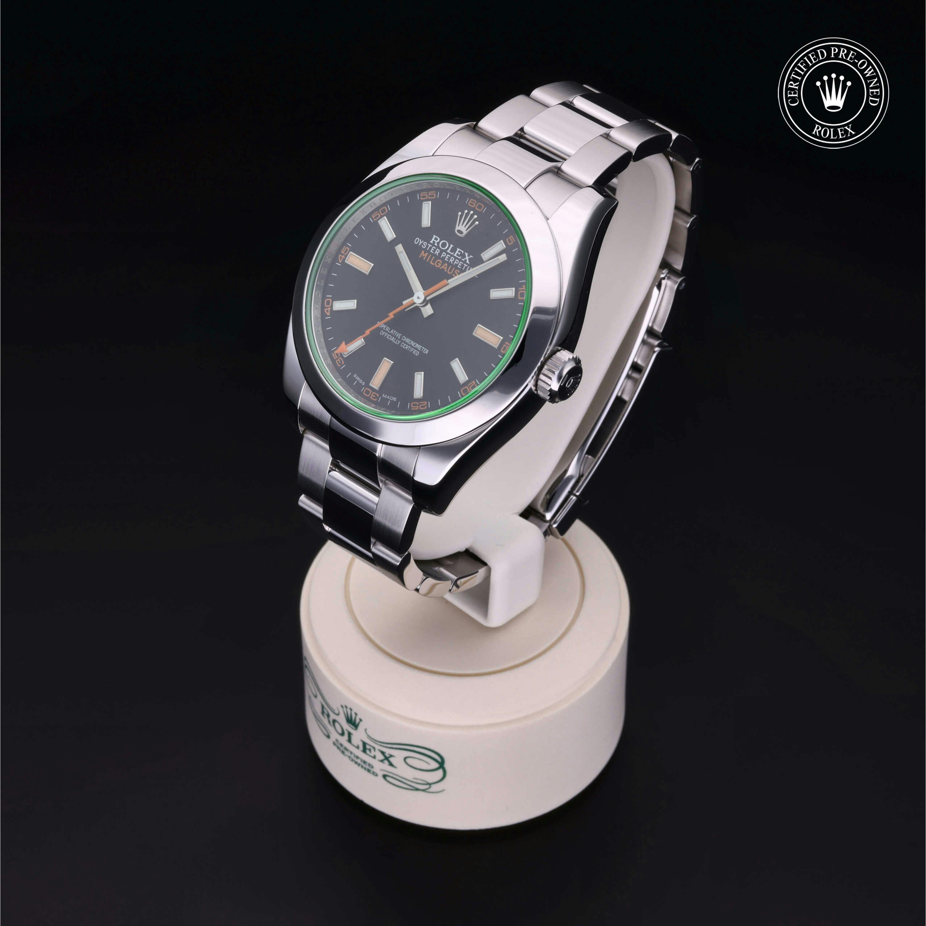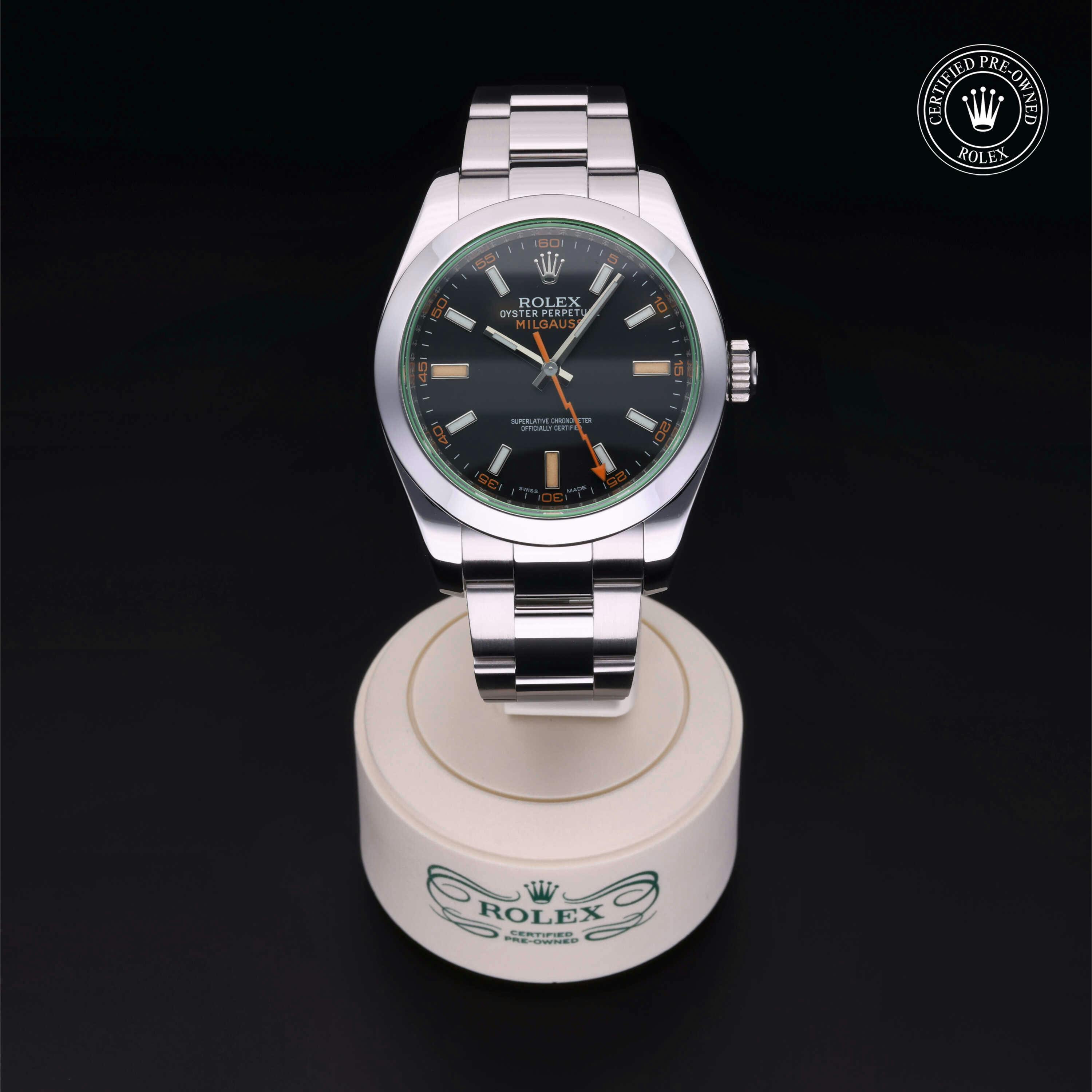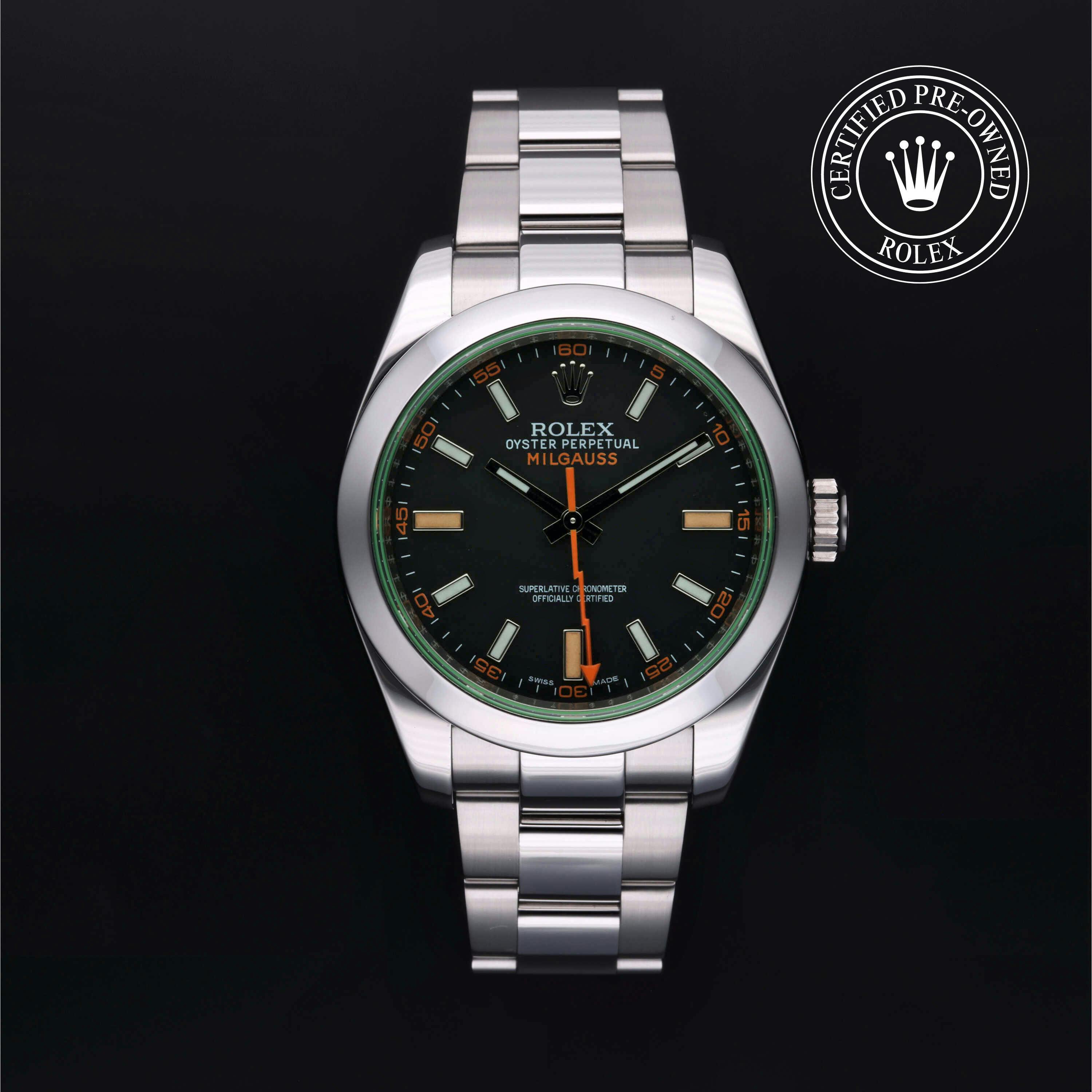 Rolex Certified Pre-Owned Milgauss (116400GV) self - winding automatic watch, features a 40mm stainless steel case and smooth bezel surrounding an intense black dial with a green sapphire crystal on a stainless steel oyster bracelet. Functions include hours, minutes, seconds and anti-magnetic. This watch has received Rolex-authorized service and certification. It comes with the original papers, and includes a custom Rolex Certified Pre-Owned hang tag, travel pouch and RCPO international warranty card.