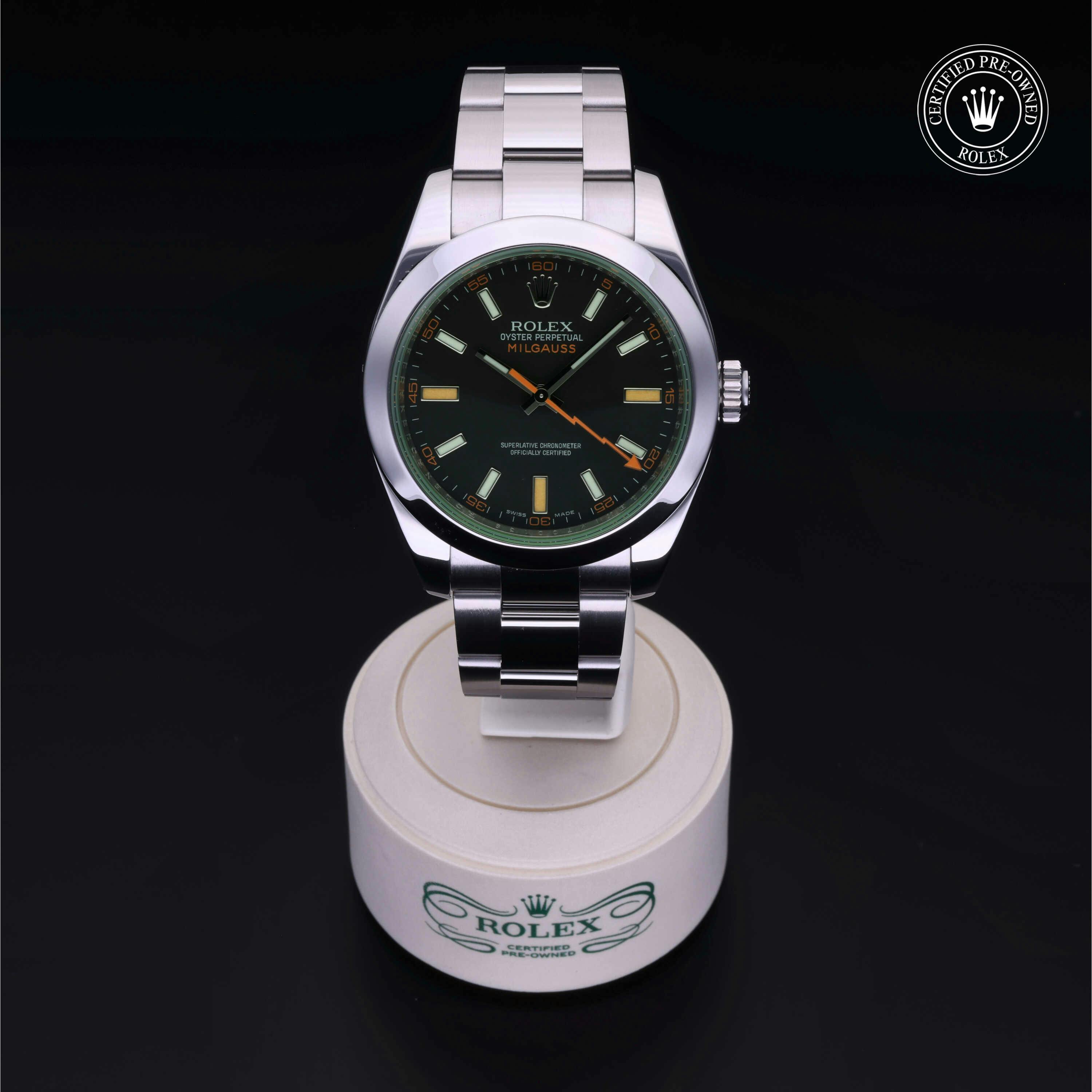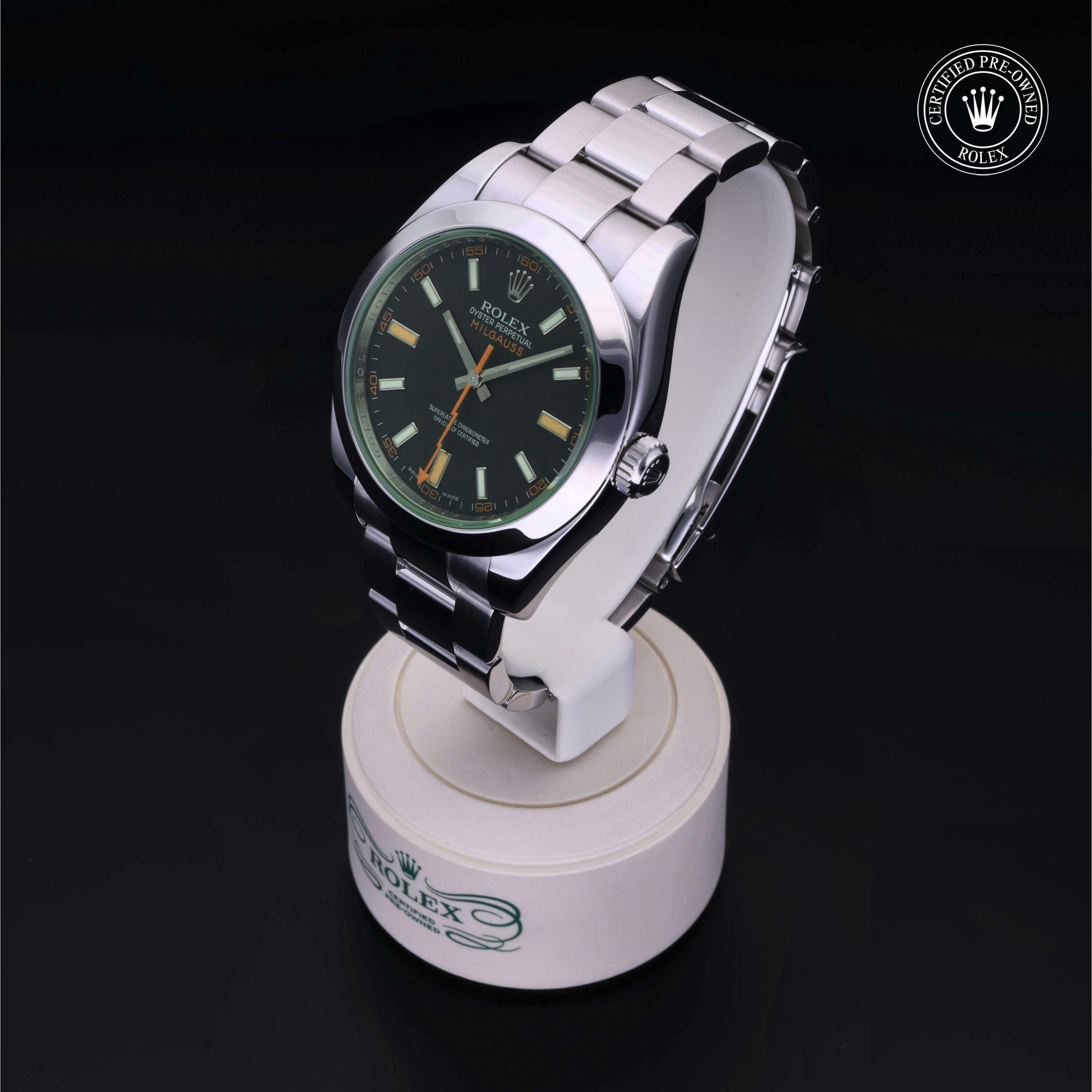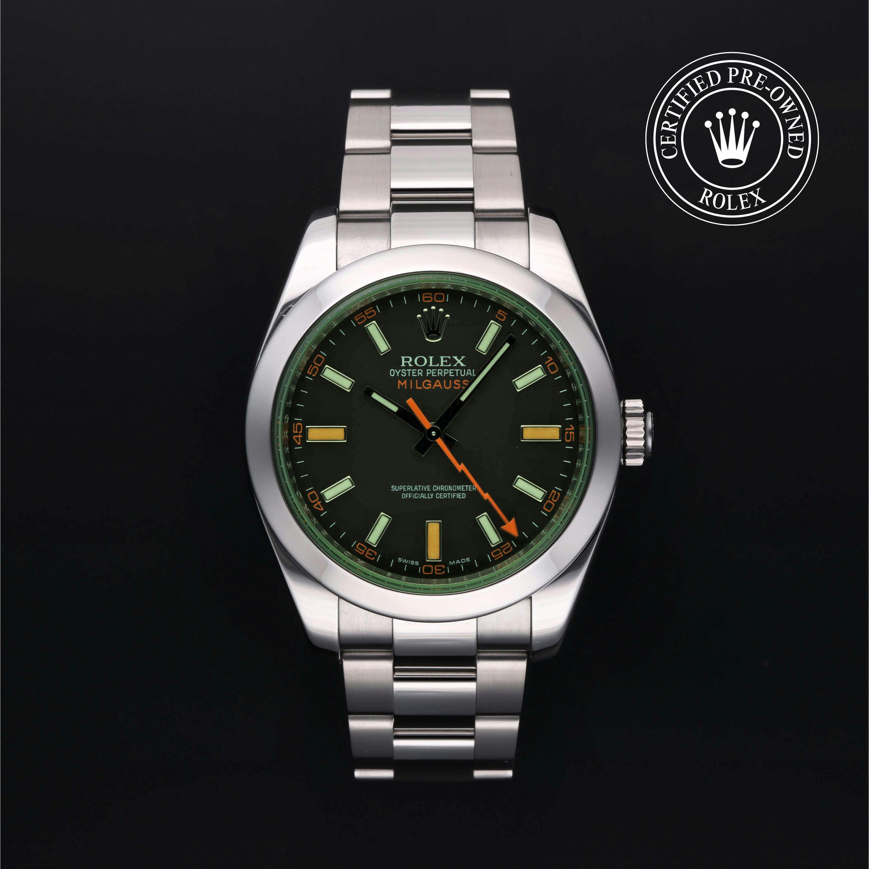 Rolex Certified Pre-Owned Milgauss (116400GV) self - winding automatic watch, features a 40mm stainless steel case and smooth bezel surrounding an intense black dial with a green sapphire crystal on a stainless steel oyster bracelet. Functions include hours, minutes, seconds and anti-magnetic. This watch has received Rolex-authorized service and certification. It comes with the original papers, and includes a custom Rolex Certified Pre-Owned hang tag, travel pouch and RCPO international warranty card.
