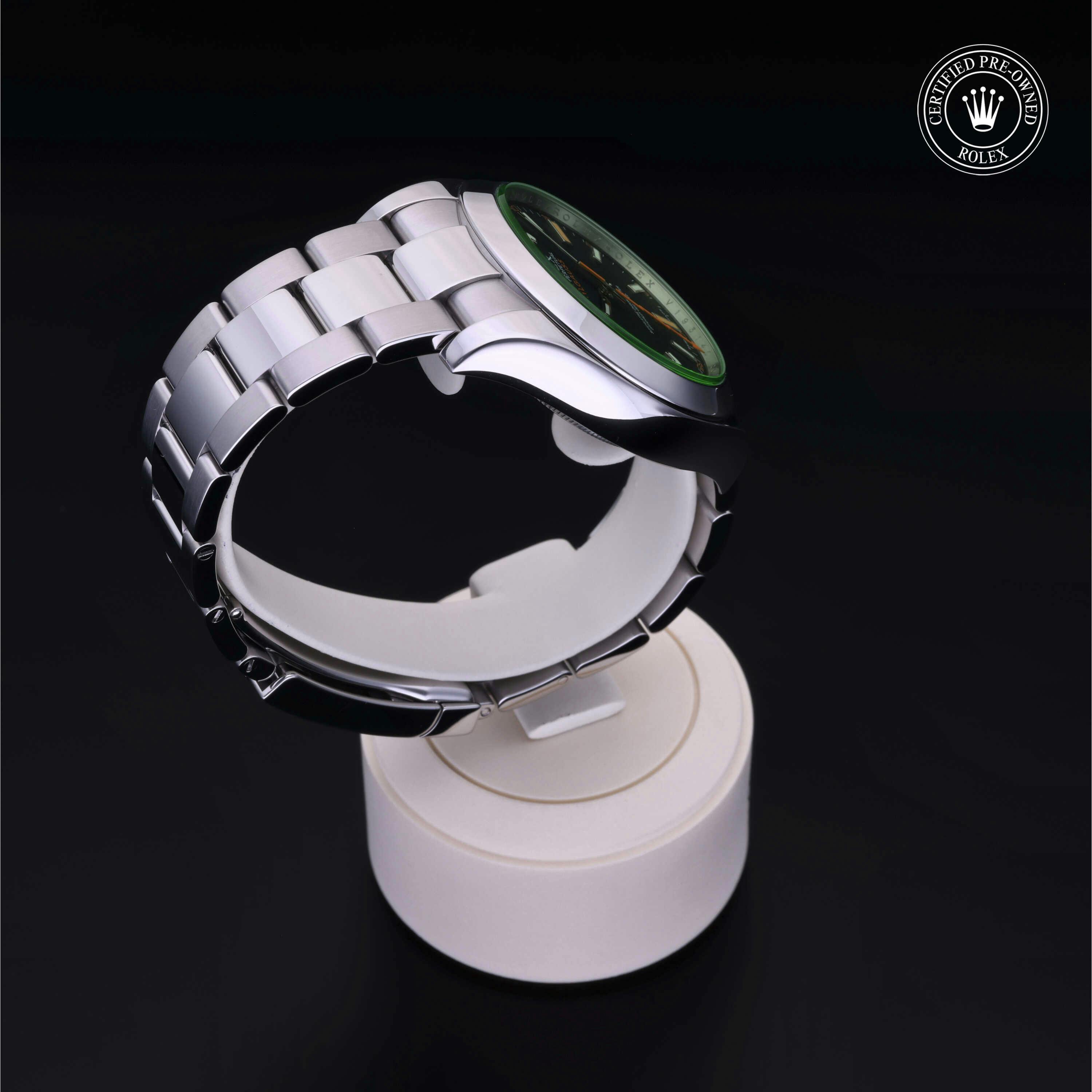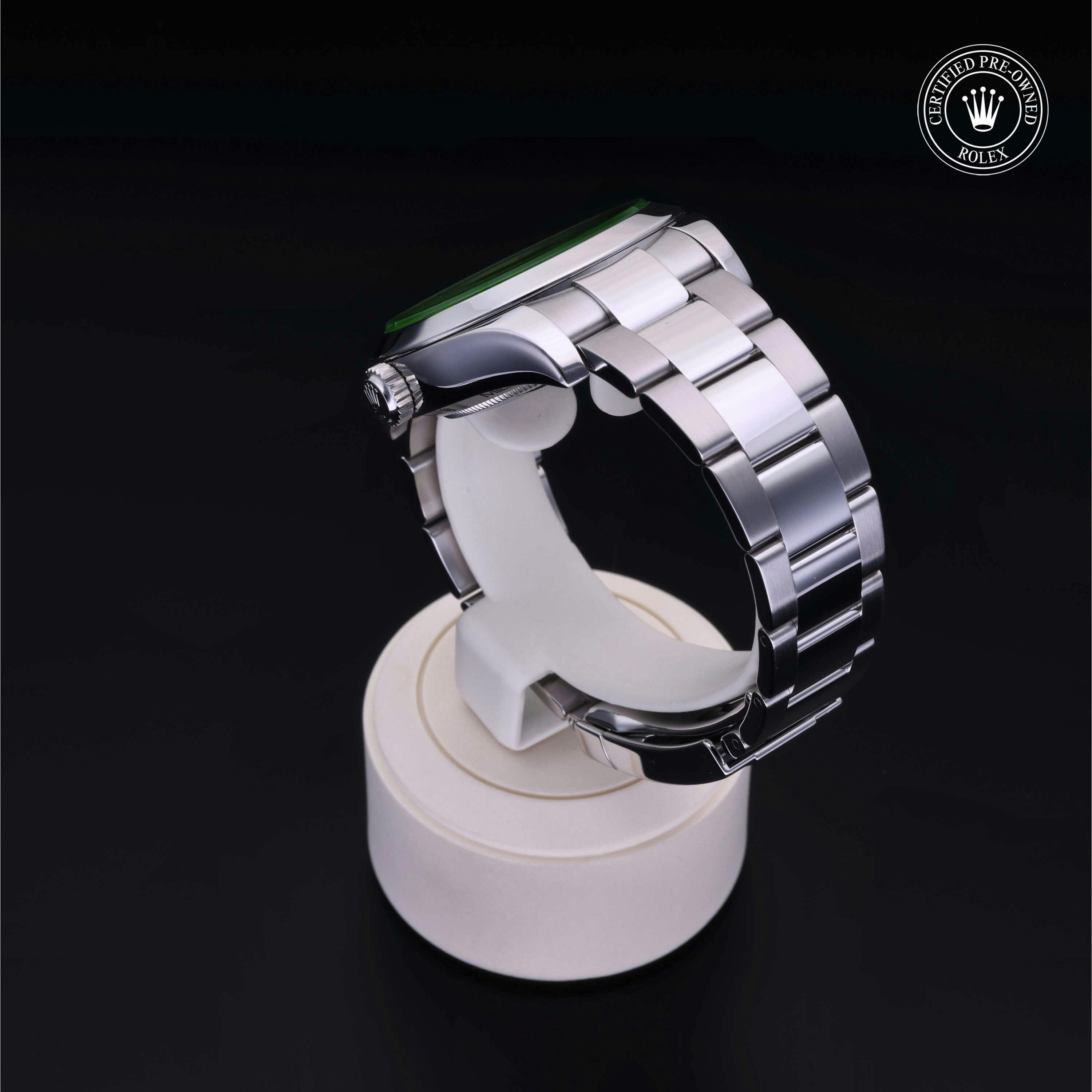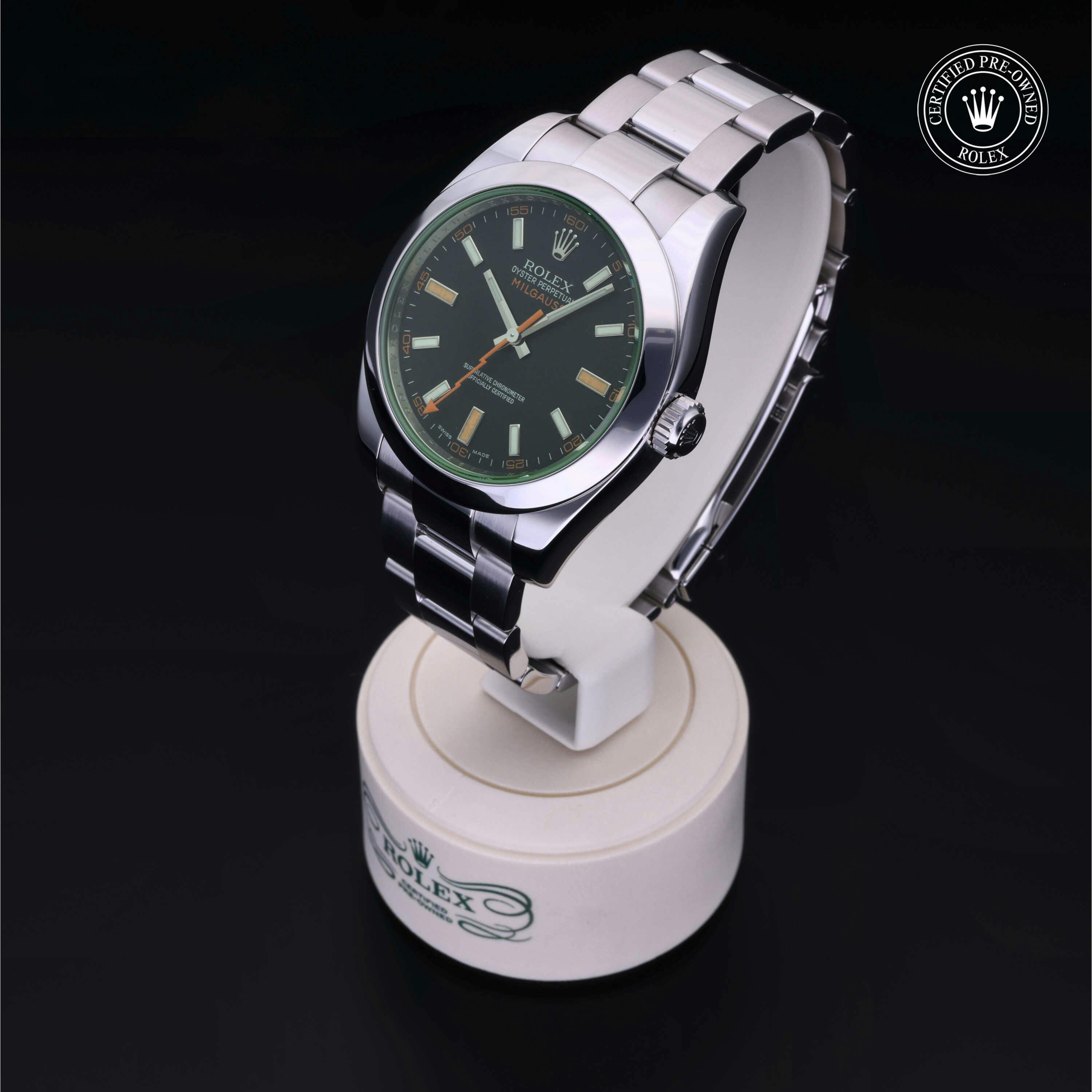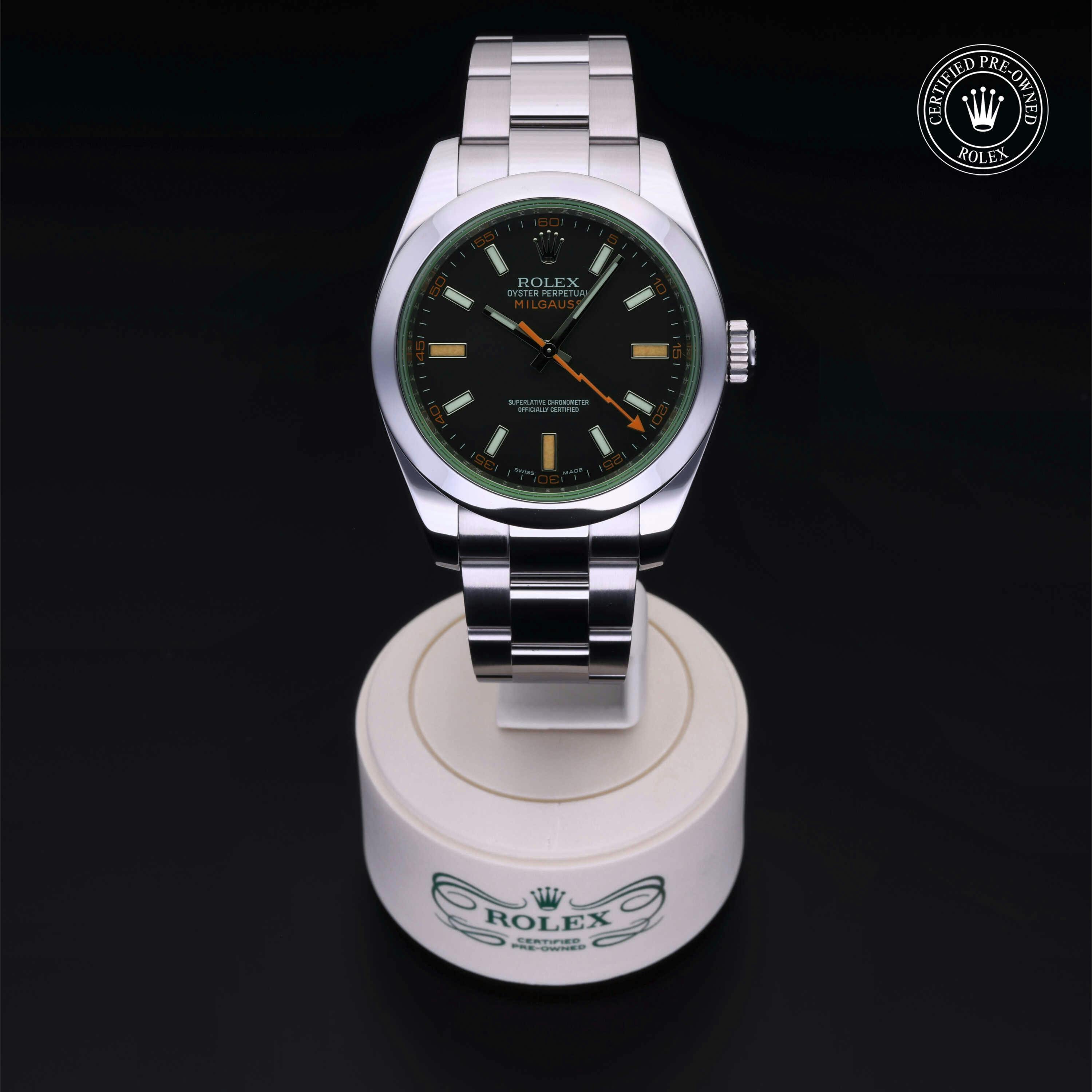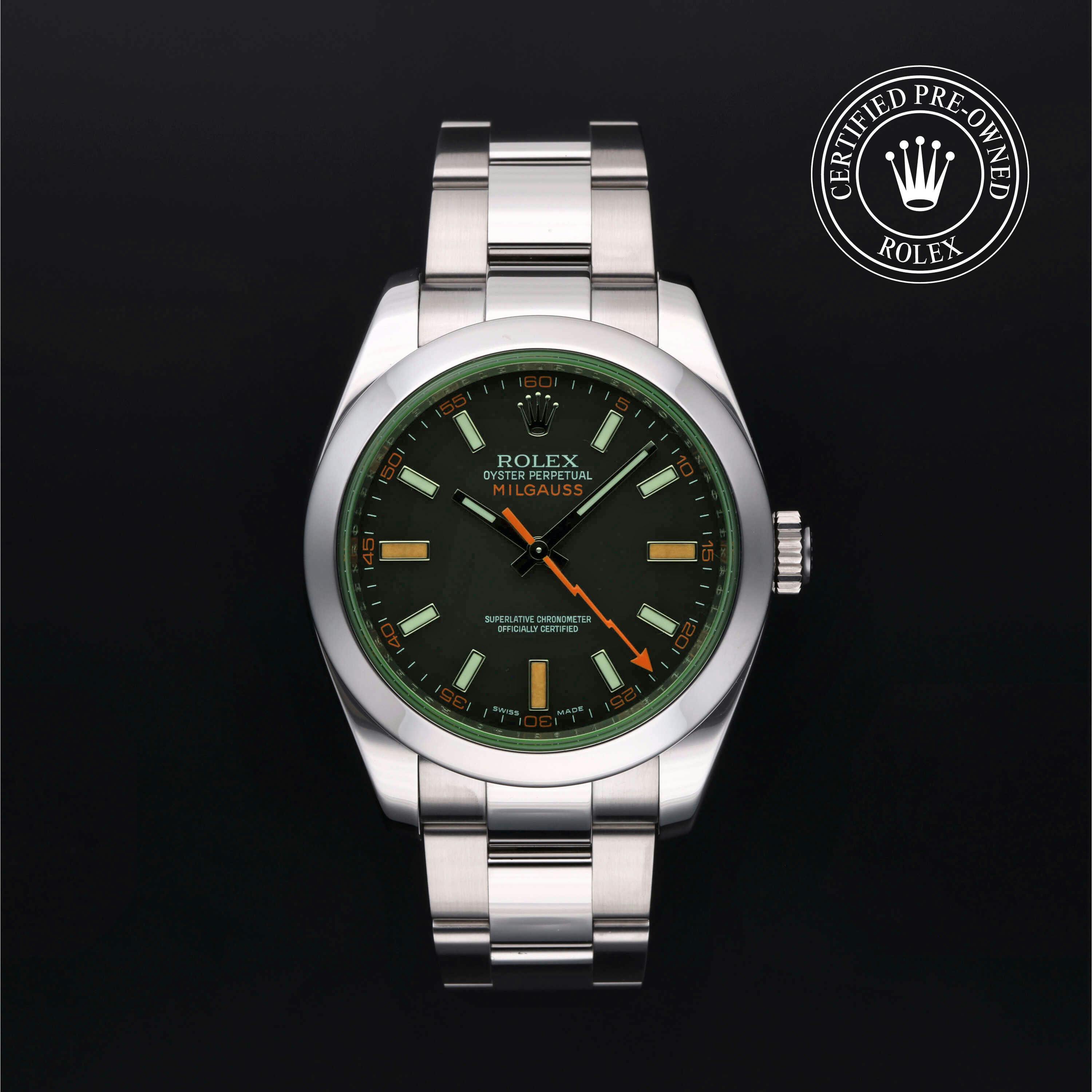 Rolex Certified Pre-Owned Milgauss (116400GV) self - winding automatic watch, features a 40mm stainless steel case and smooth bezel with a green sapphire crystal surrounding an intense black dial on a stainless steel oyster bracelet. Functions include hours, minutes, seconds and anti-magnetic. This watch has received Rolex-authorized service and certification. It does not come with the original box or papers, but includes a custom Rolex Certified Pre-Owned hang tang, travel pouch and RCPO international warranty card.