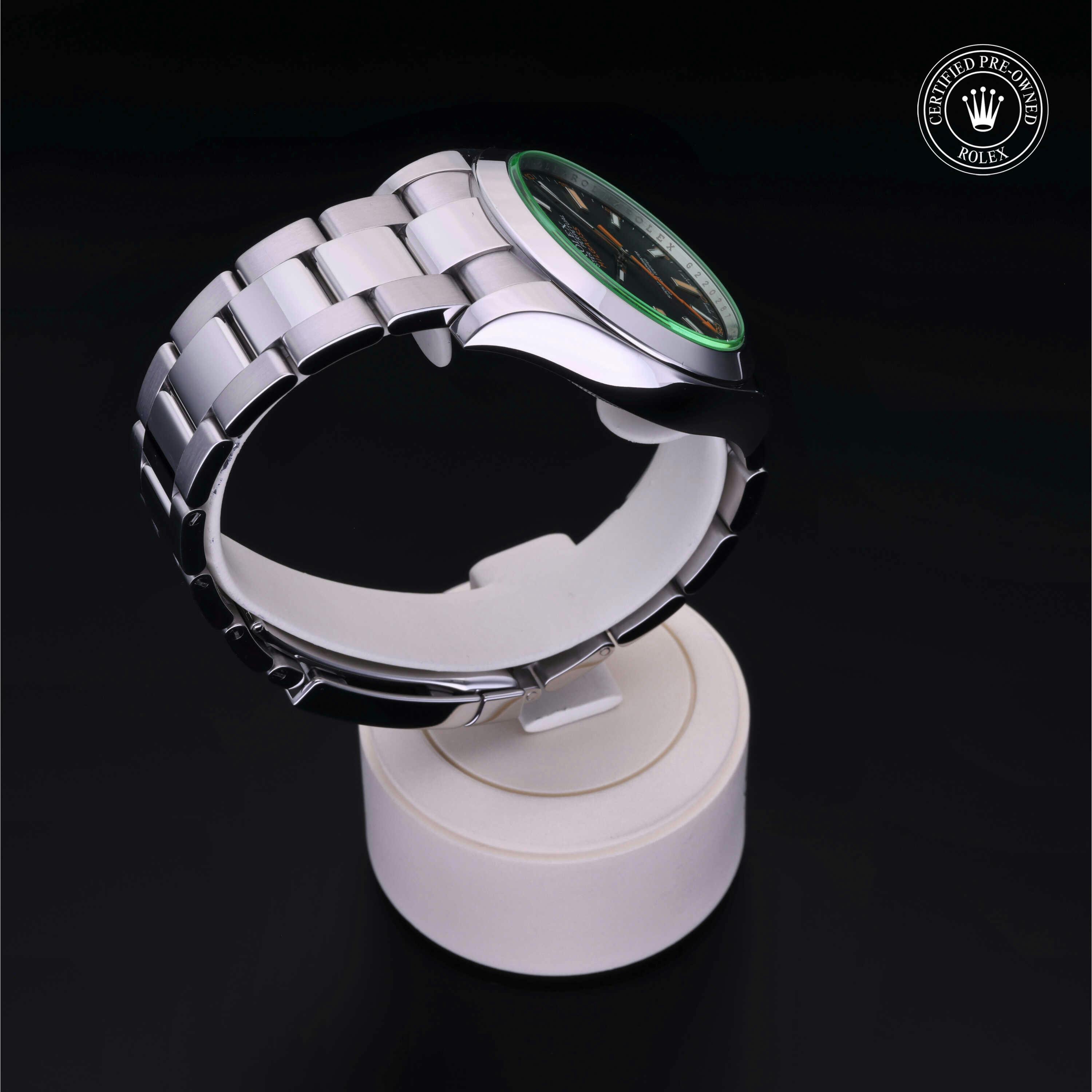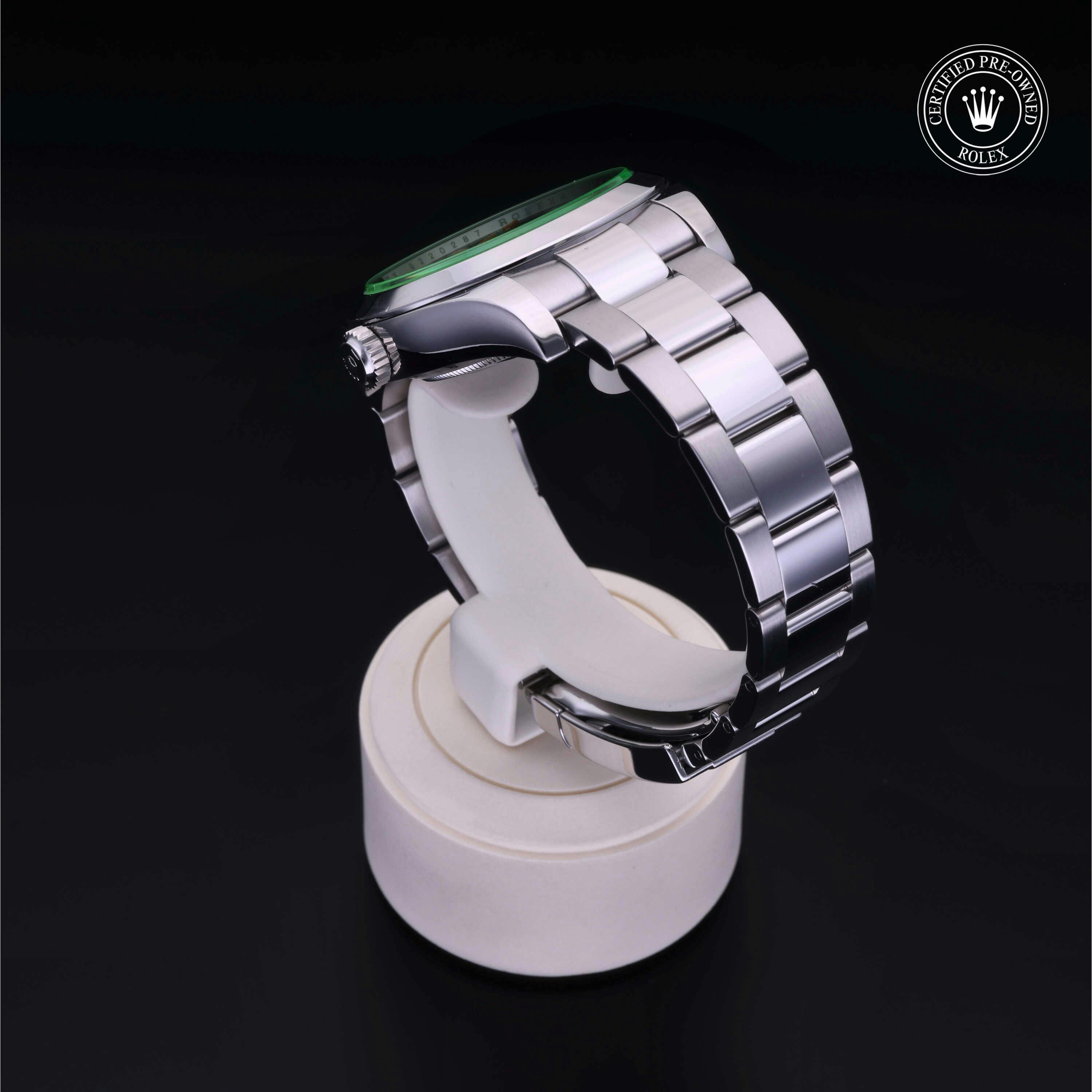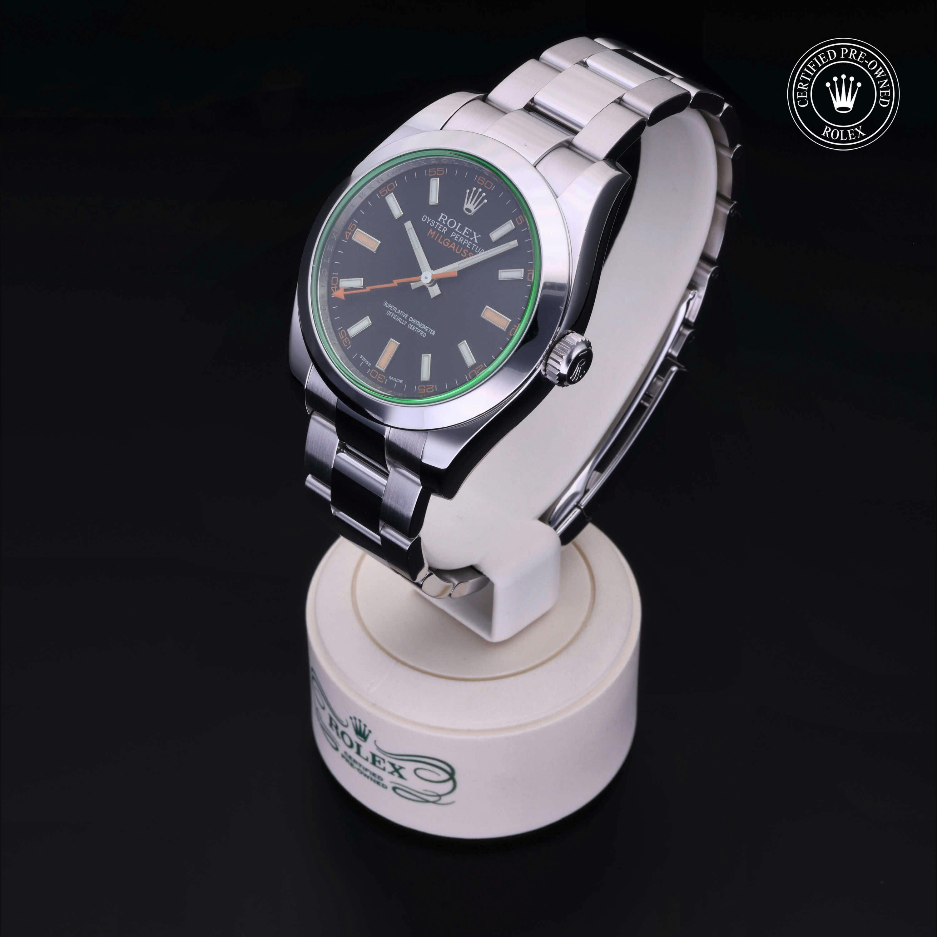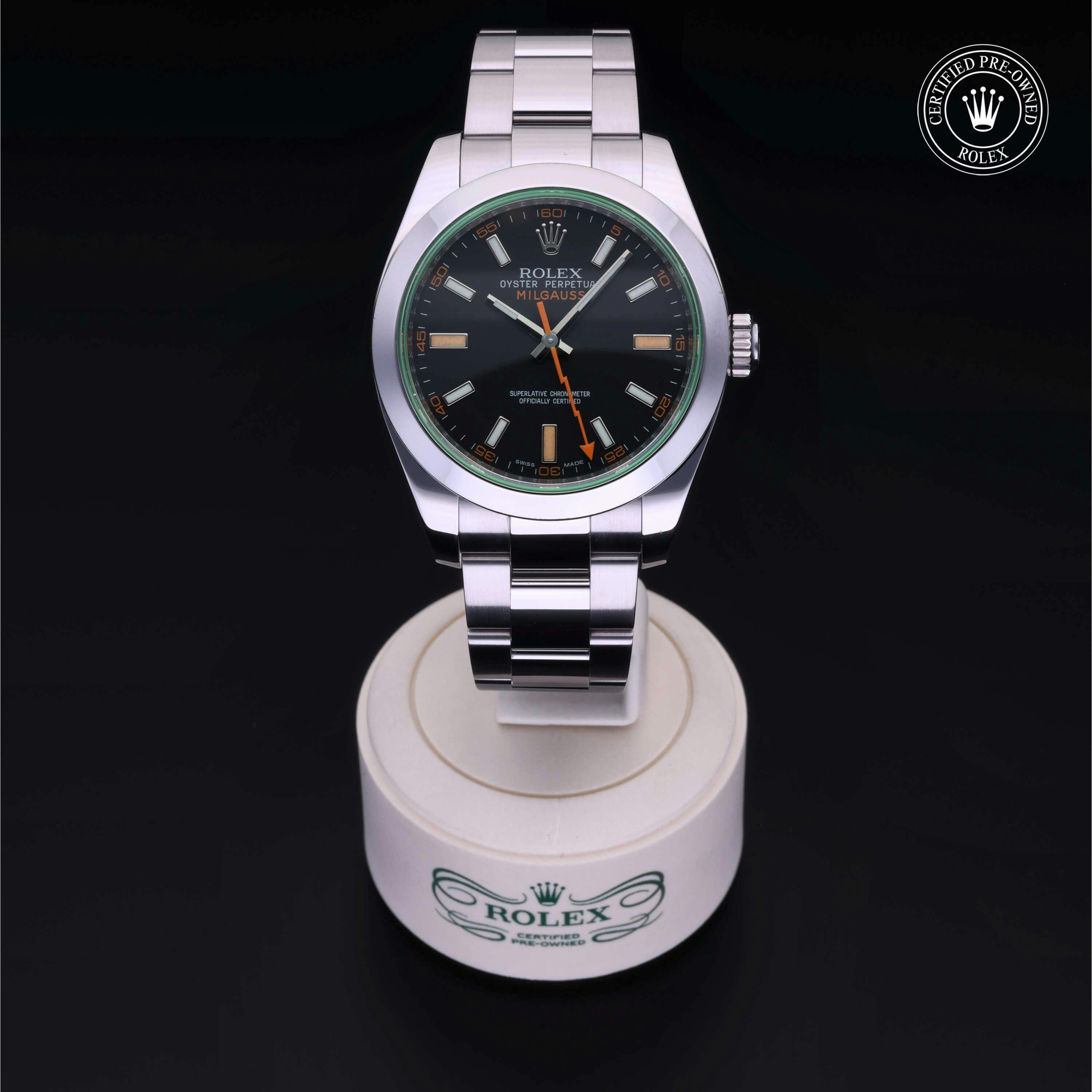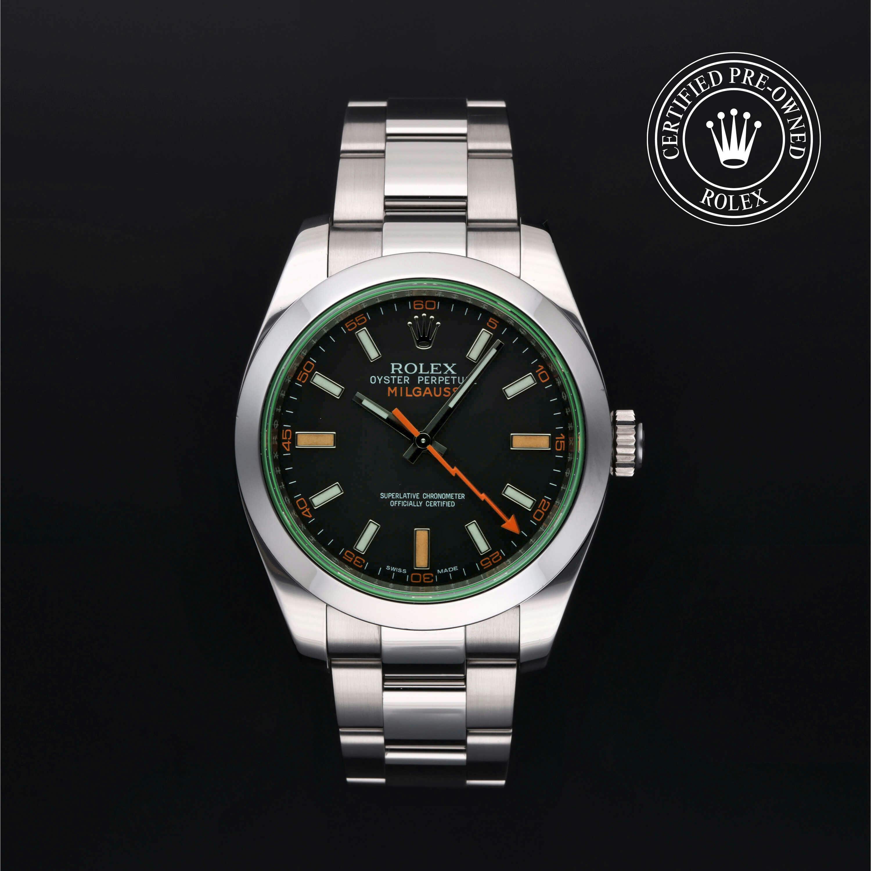 Rolex Certified Pre-Owned Milgauss (116400GV) self - winding automatic watch, features a 40mm stainless steel case and smooth bezel surrounding an intense black dial with a green sapphire crystal on a stainless steel oyster bracelet. Functions include hours, minutes, seconds and anti-magnetic. This watch has received Rolex-authorized service and certification. It does not come with the original box or papers, but includes a custom Rolex Certified Pre-Owned hang tag, travel pouch and RCPO international warranty card.