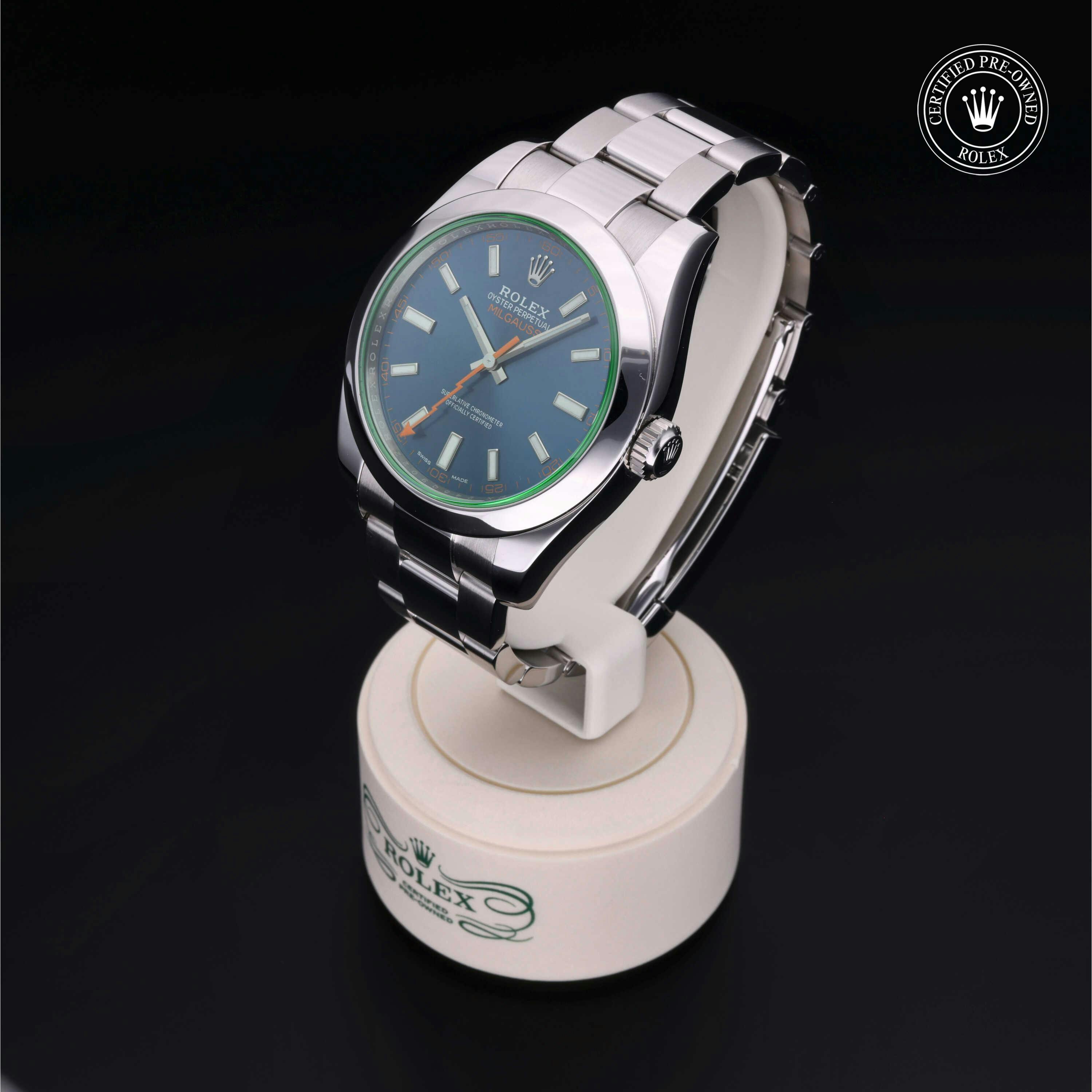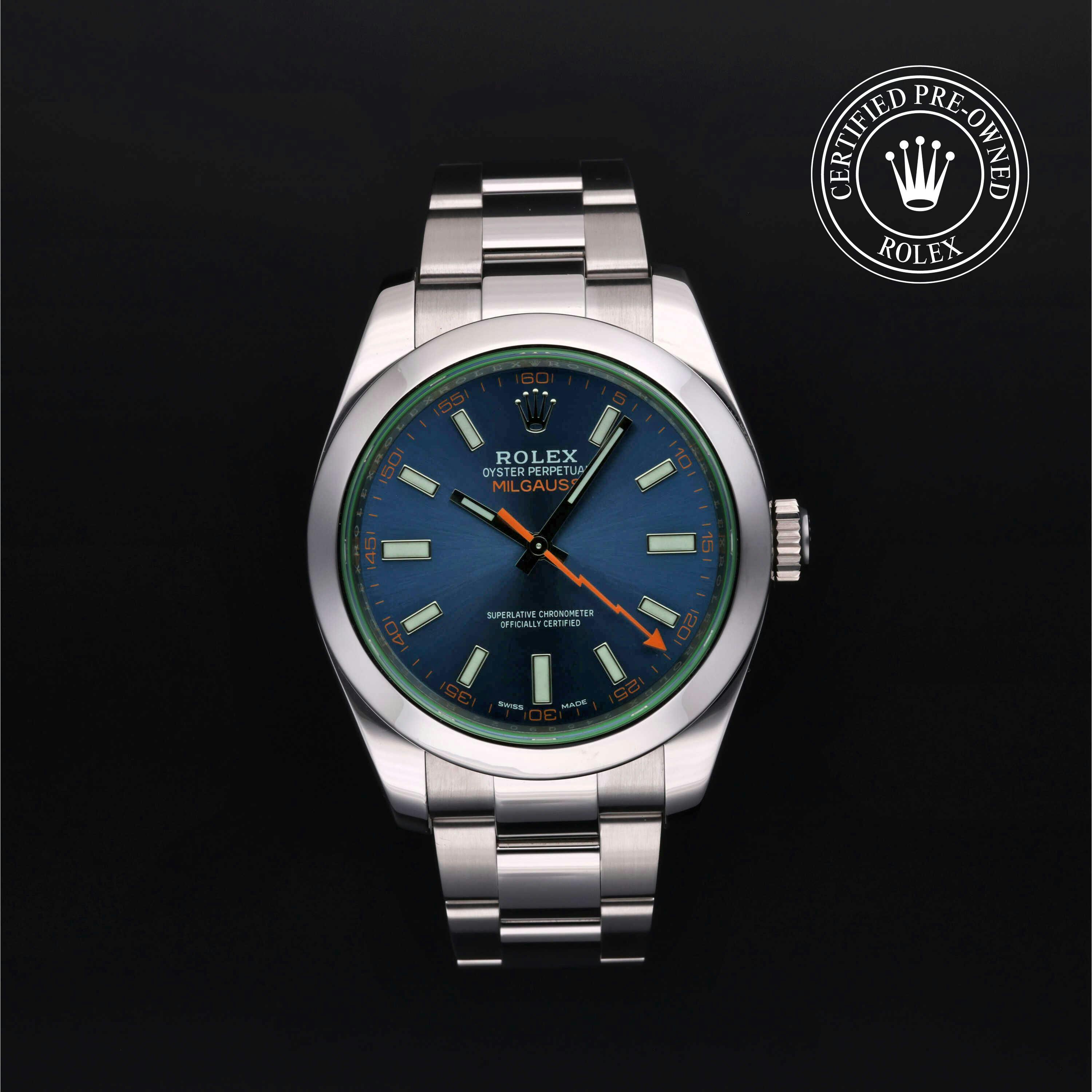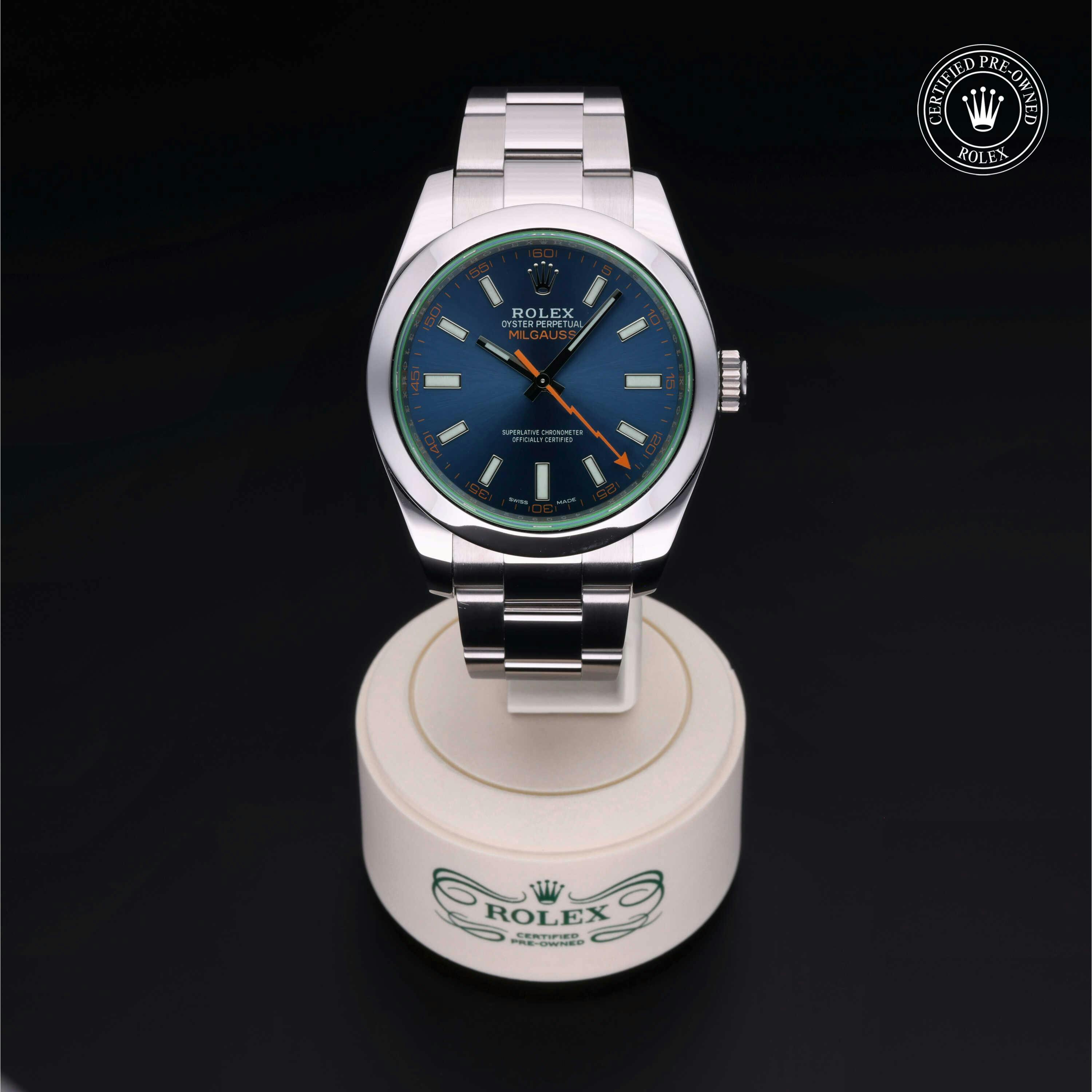 Rolex Certified Pre-Owned Milgauss (116400GV) self - winding automatic watch, features a 40mm stainless steel case and smooth bezel surrounding a Z-blue dial with a green sapphire crystal on a stainless steel oyster bracelet. Functions include hours, minutes, seconds and anti-magnetic. This watch has received Rolex-authorized service and certification. It does not come with the original box or papers, but includes a custom Rolex Certified Pre-Owned hang tag, travel pouch and RCPO international warranty card.