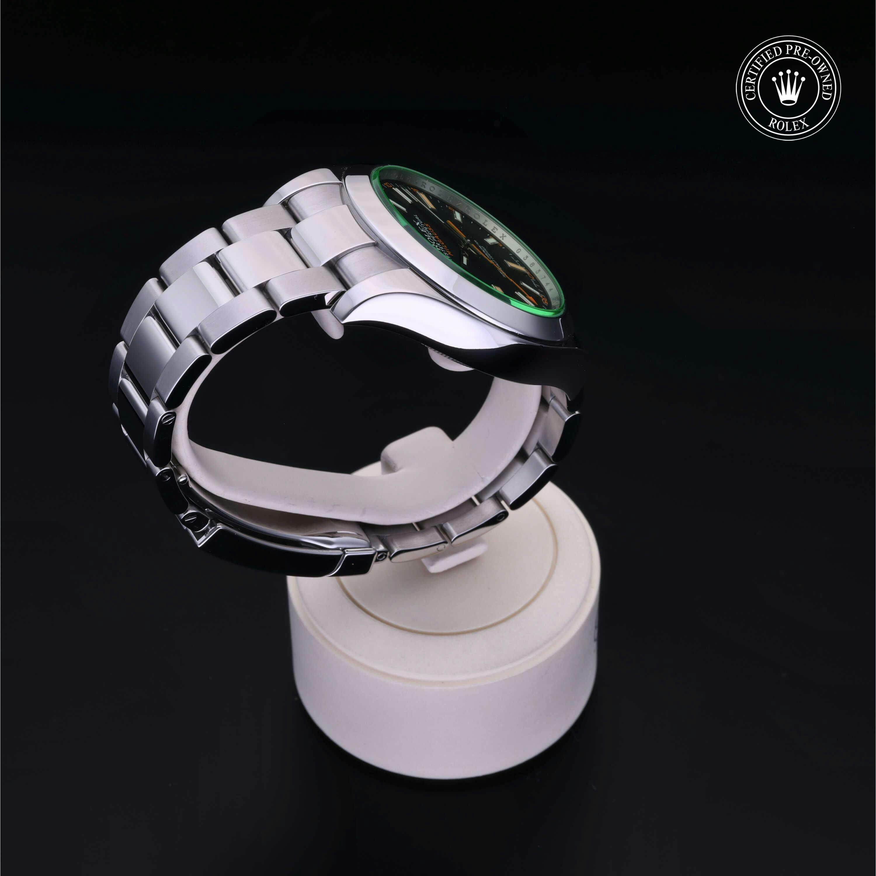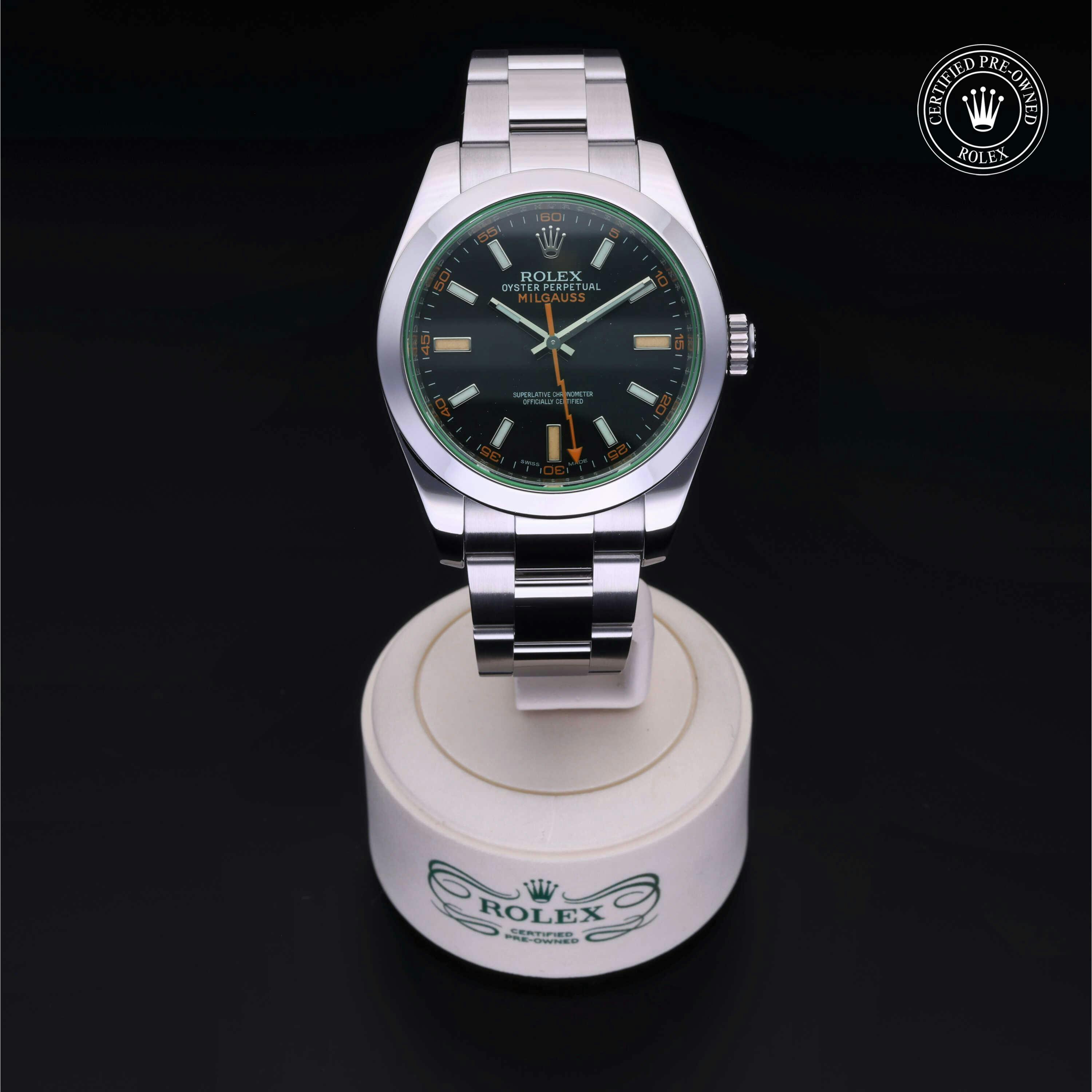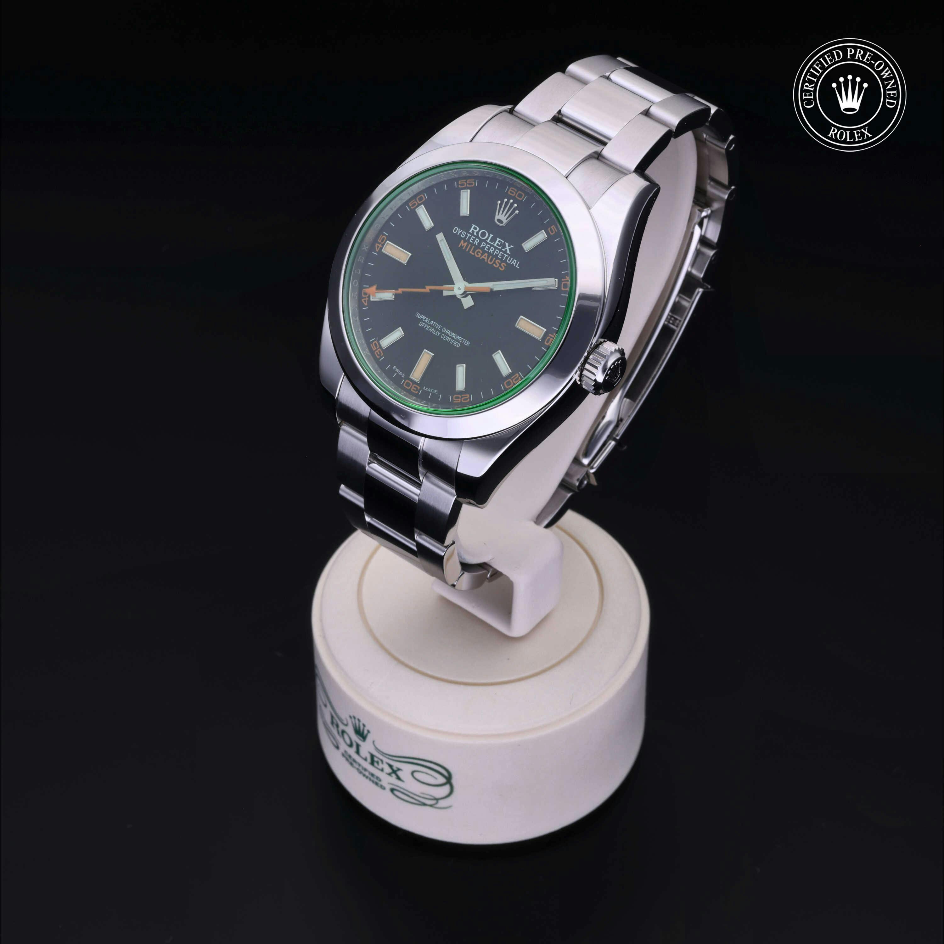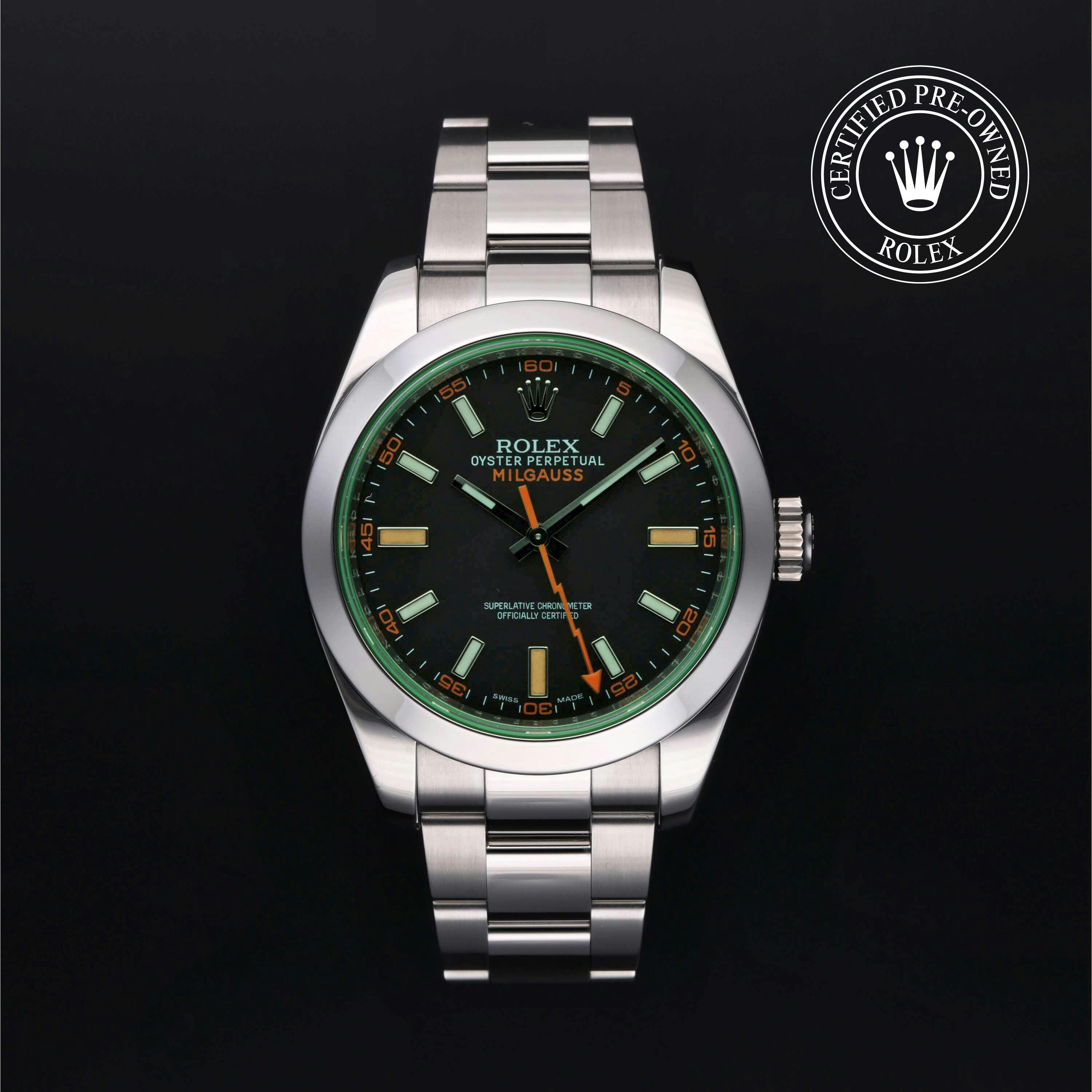Rolex Certified Pre-Owned Milgauss (116400GV) self - winding automatic watch, features a 40mm stainless steel case an smooth bezel surrounding an intense black dial with a green sapphire crystal on a stainless steel oyster bracelet. Functions include hours, minutes, seconds and anti-magnetic. This watch has received Rolex-authorized service and certification. It comes with the original papers, and includes a custom Rolex Certified Pre-Owned hang tag, travel pouch and RCPO international warranty card.