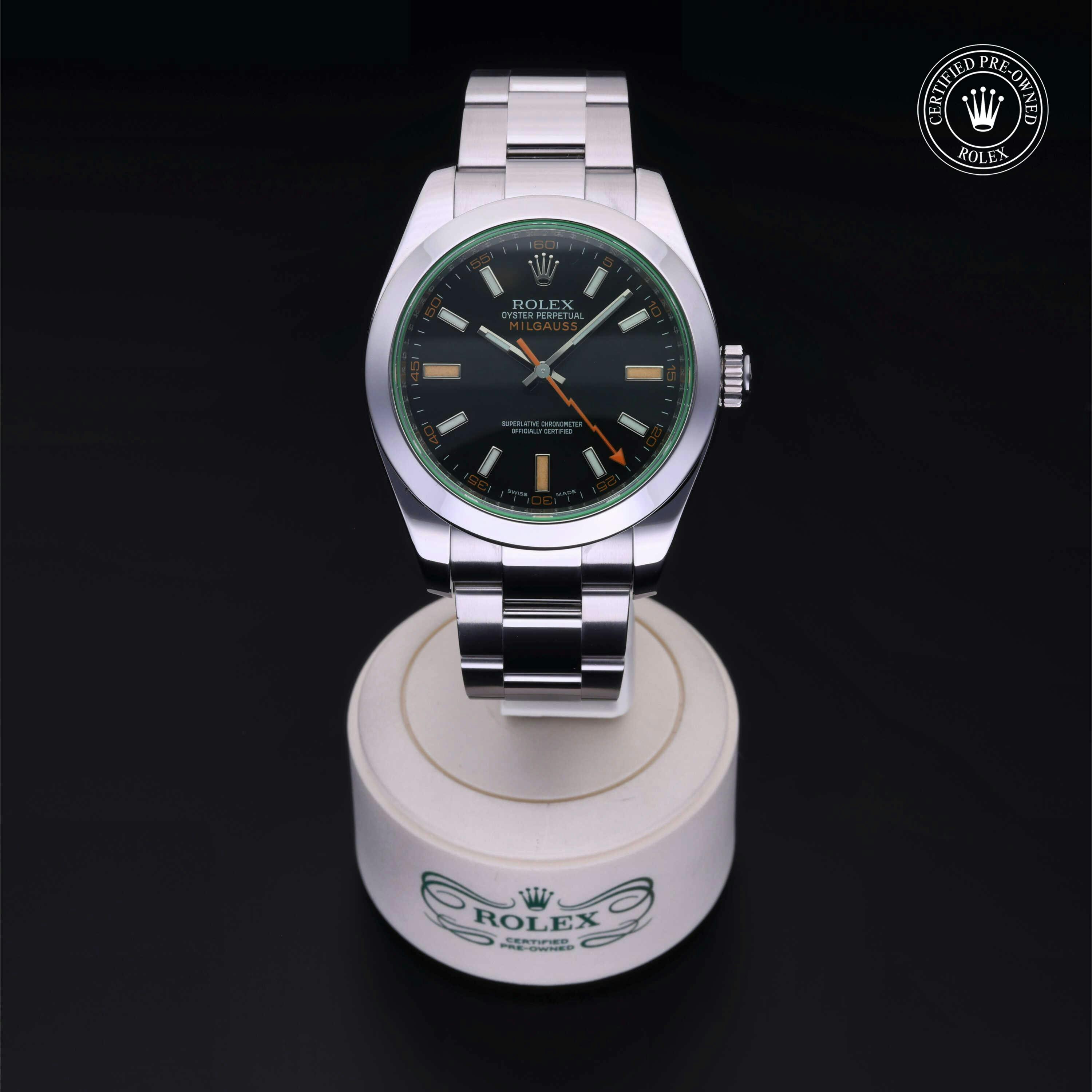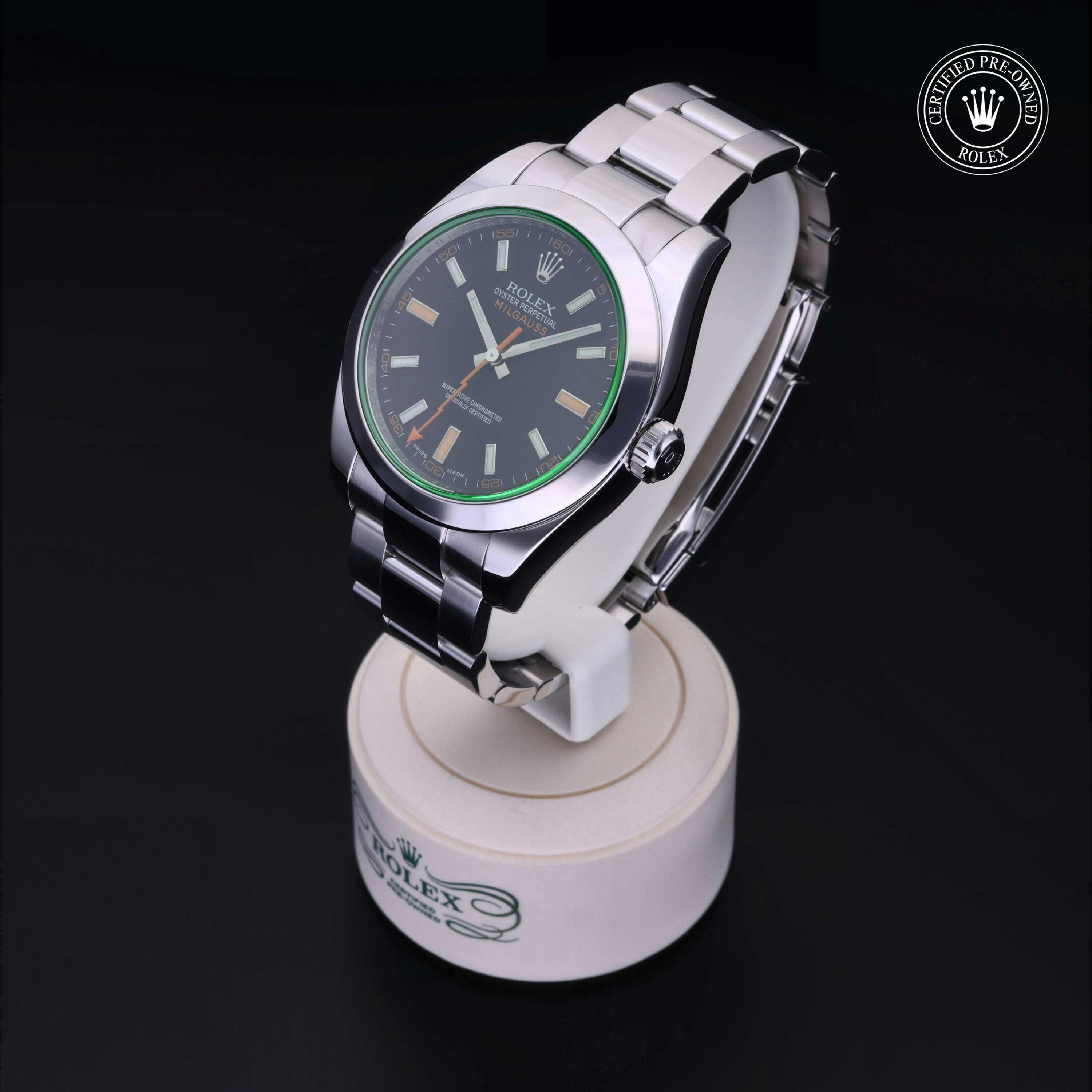 Rolex Certified Pre-Owned Milgauss (116400GV) self - winding automatic watch, features a 40mm stainless steel case surrounding a black dial with a green sapphire crystal. The watch is secured on a stainless steel Oyster bracelet complete with a folding buckle. Functions include hours, minutes, secondss and is anti-magnetic. This watch has been serviced by an authorized service center and certified by Rolex. It does not come with the original box or papers, but includes a custom Rolex Certified Pre-Owned hang tag, travel pouch and international warranty card.