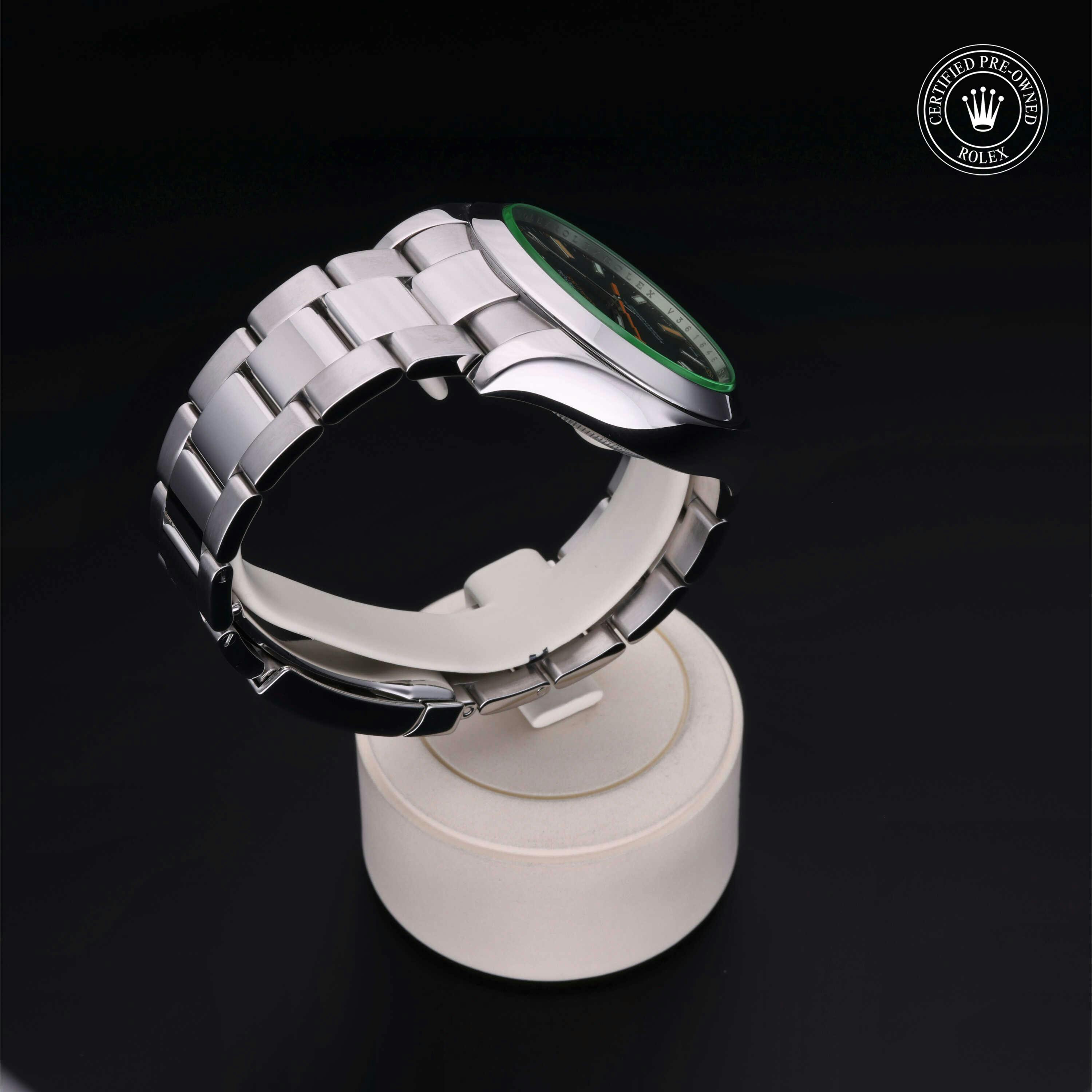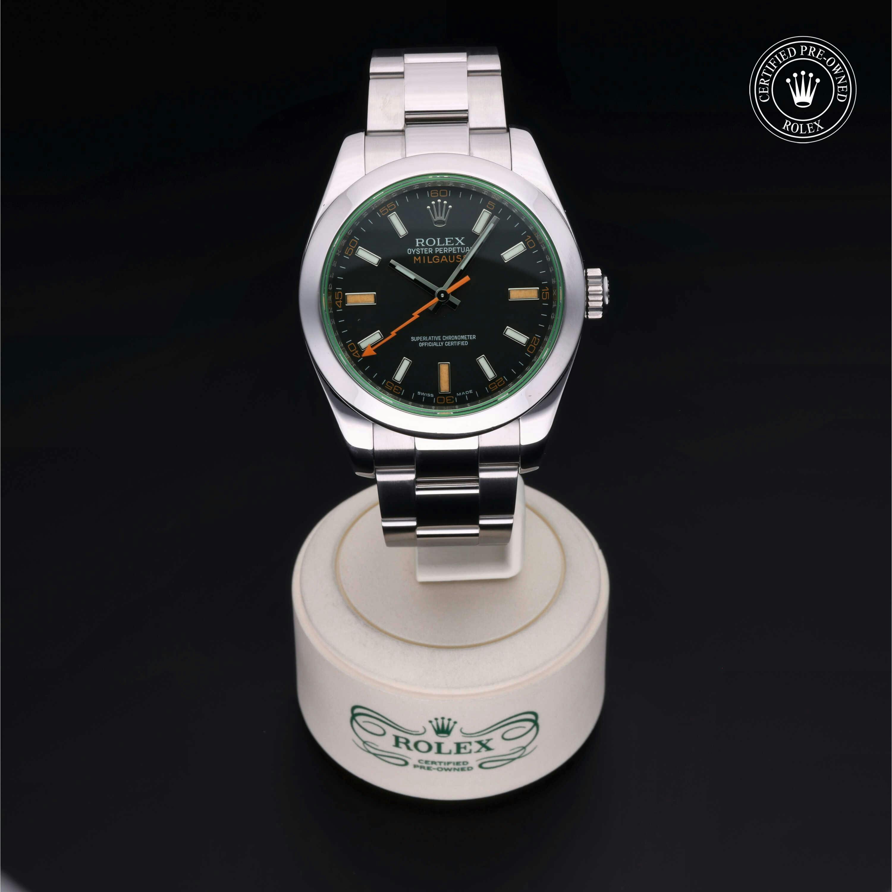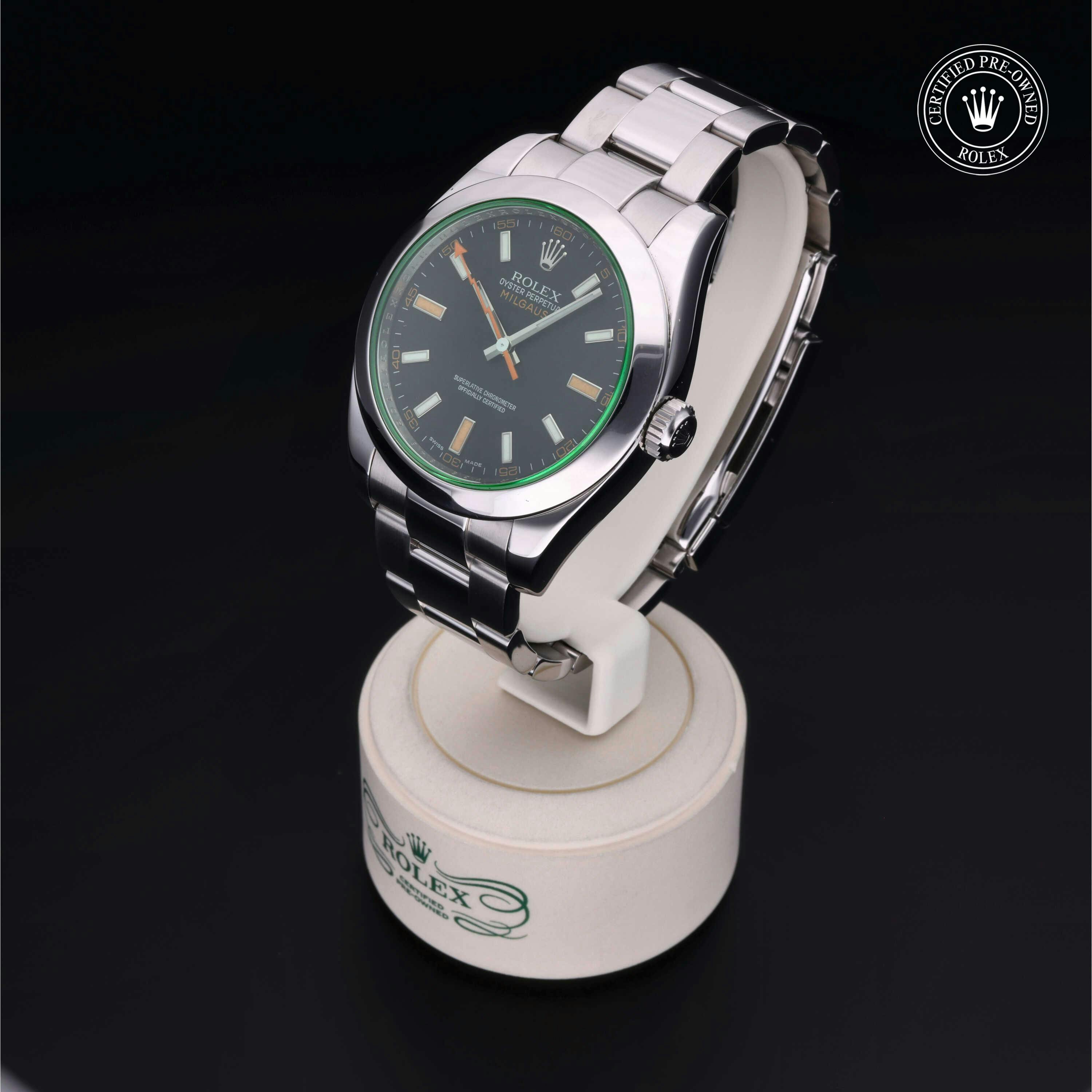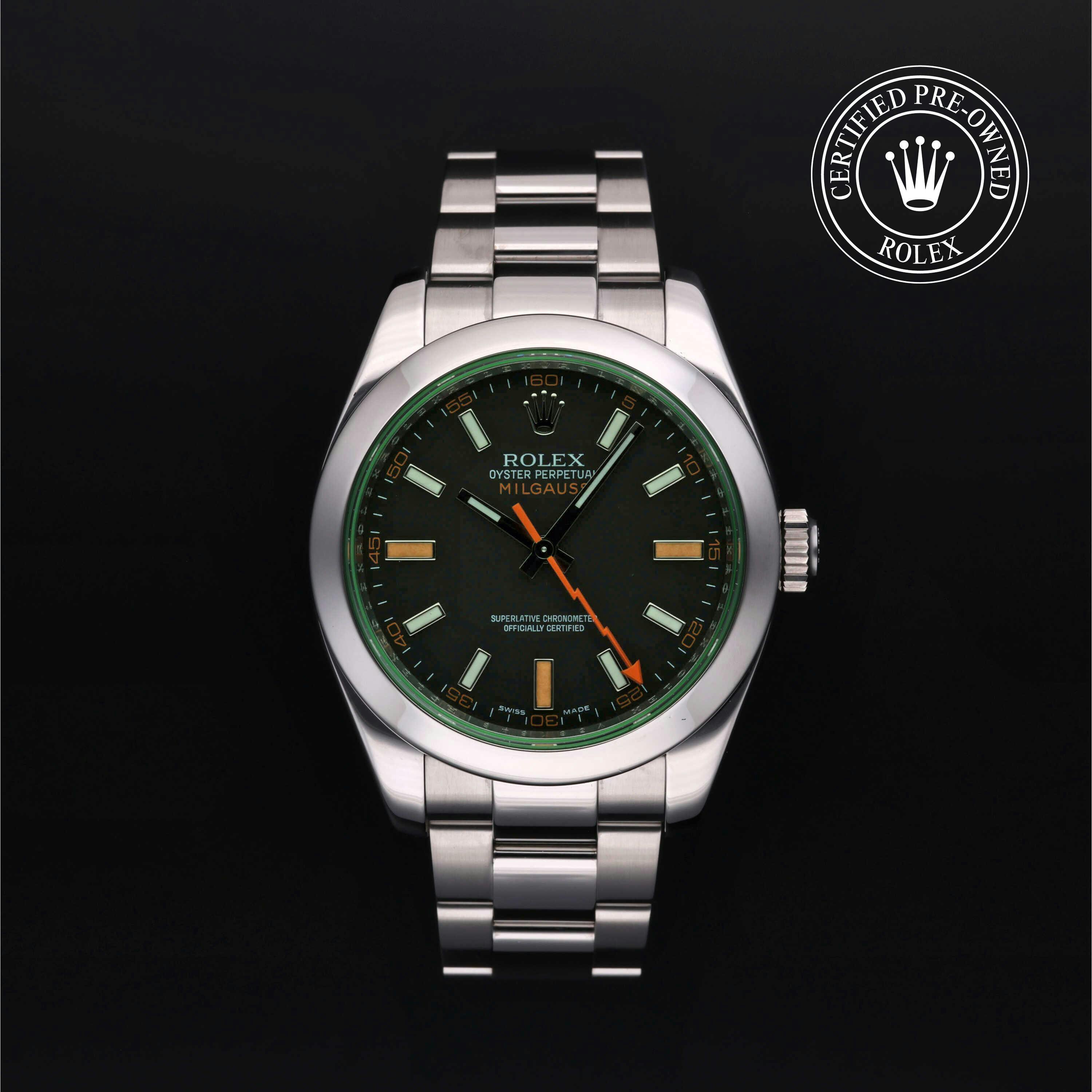 Rolex Certified Pre-Owned Milgauss (116400GV) self - winding automatic watch, features a 40mm stainless steel case and smooth bezel surrounding an intense black dial with a green sapphire crystal. The watch is secured on a stainless steel Oyster bracelet complete with a folding buckle. Functions include hours, minutes, seconds and anti-magnetic. This watch has received Rolex-authorized service and certification. It does not come with the original box or papers, but includes a custom Rolex Certified Pre-Owned hang tag, travel pouch and RCPO international warranty card.