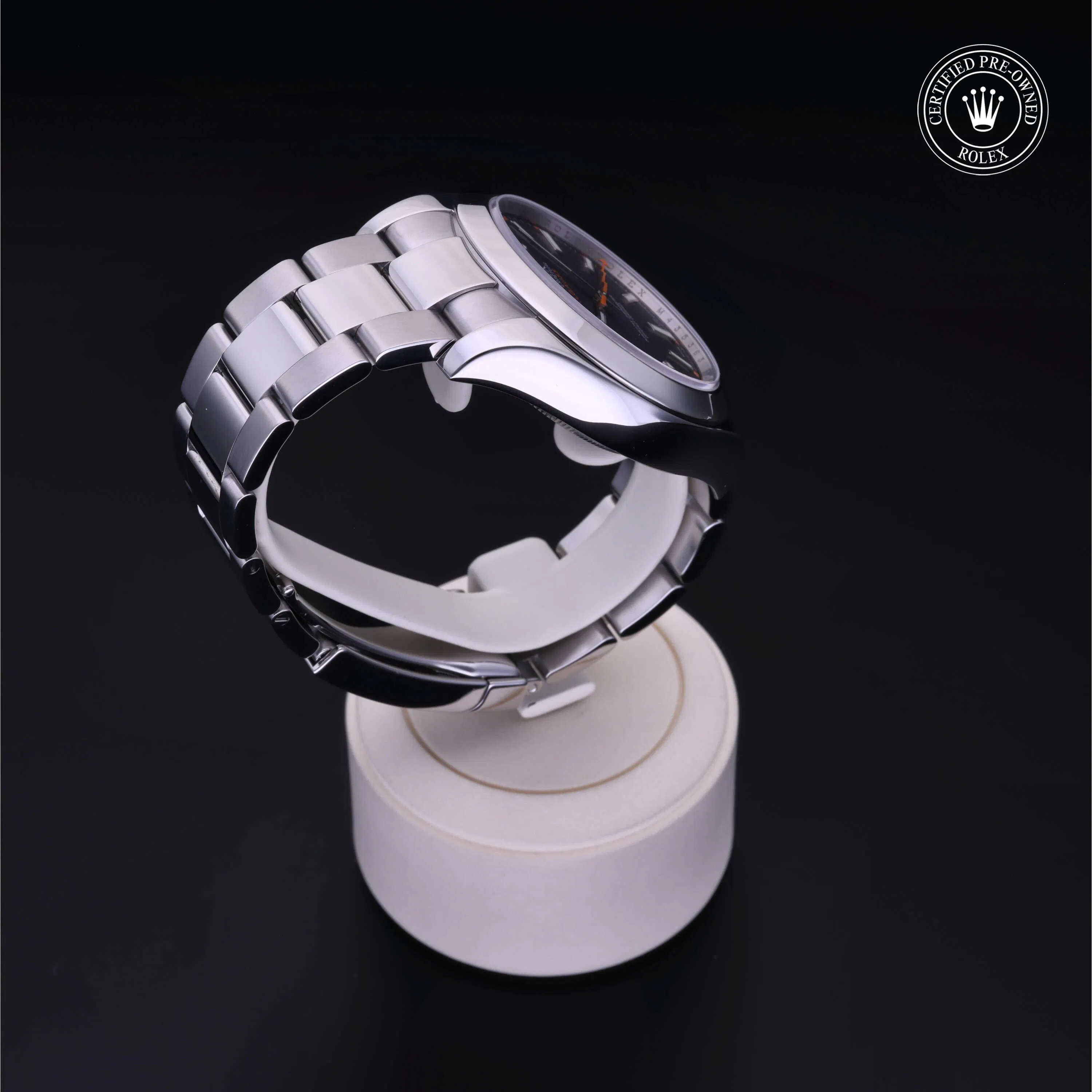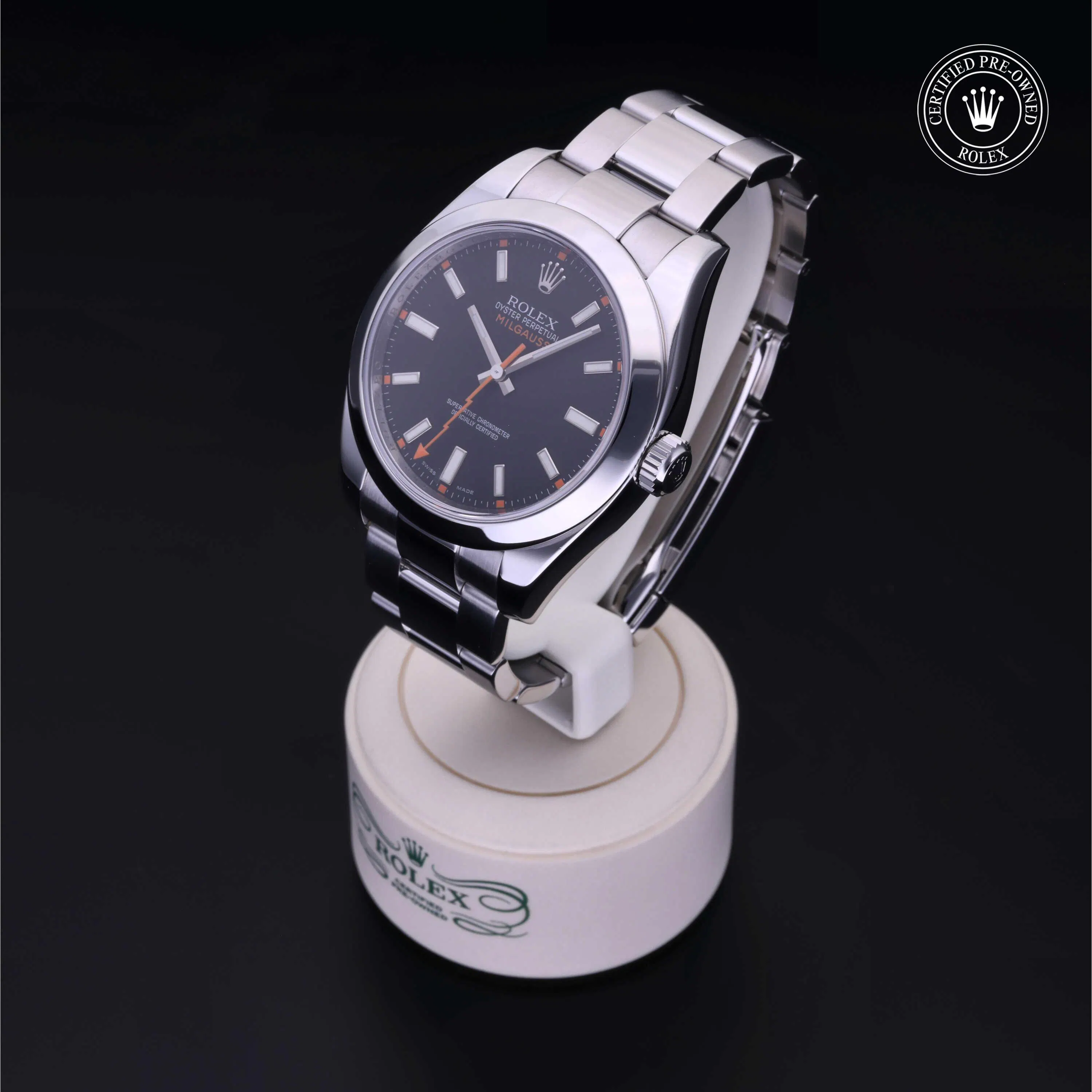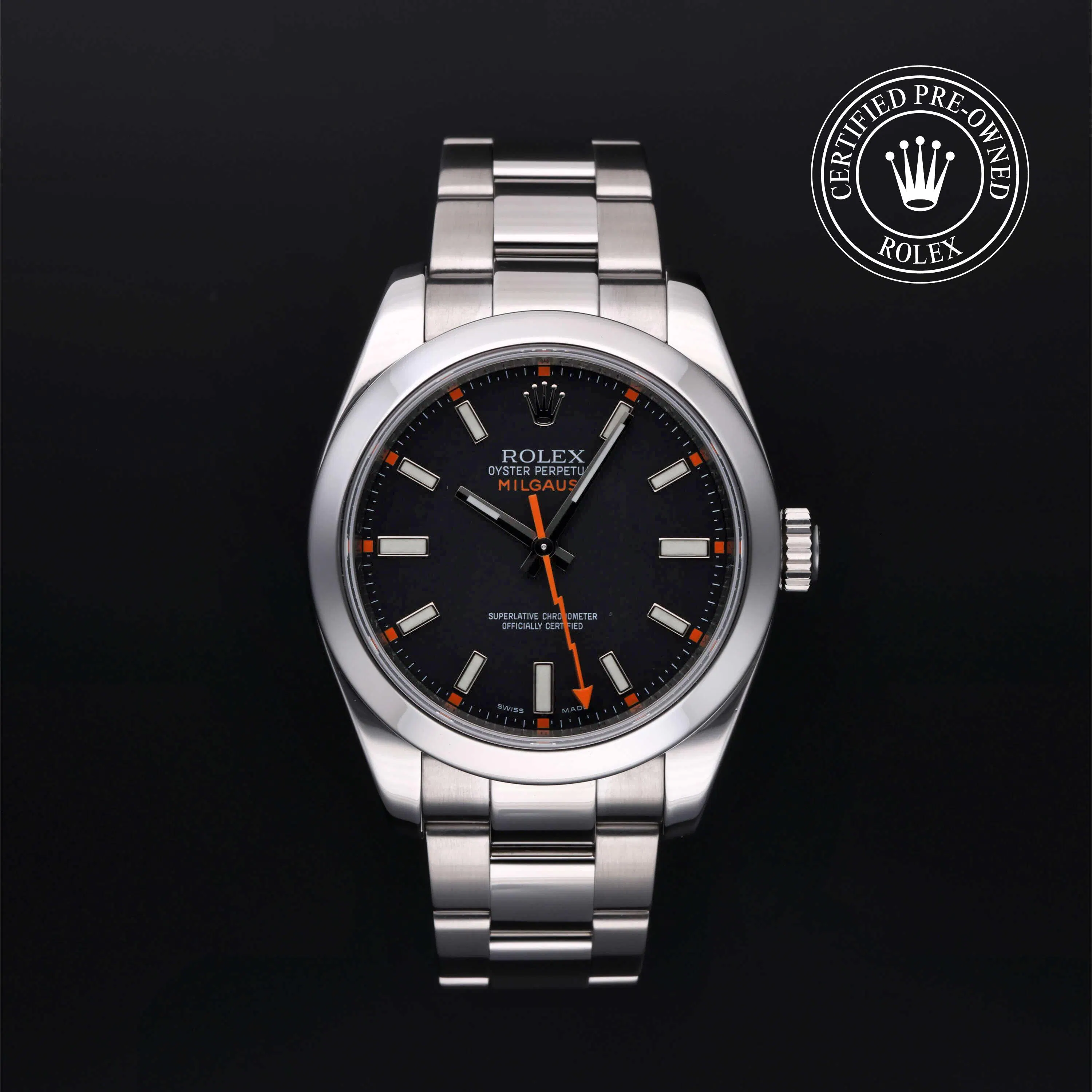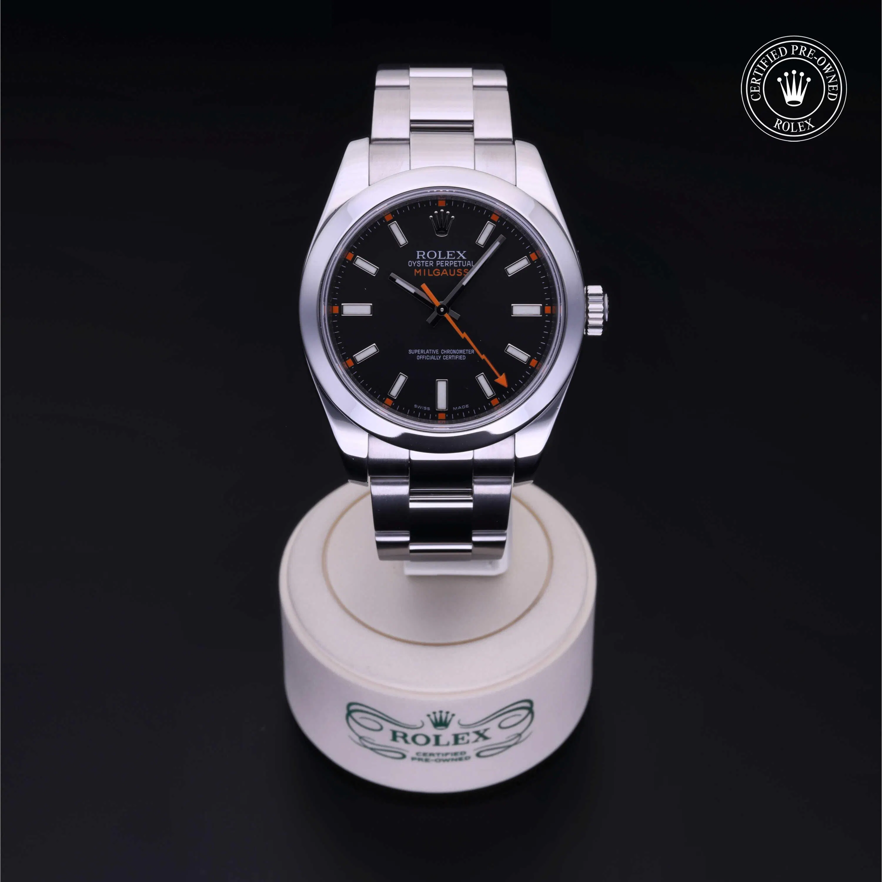 Rolex Certified Pre-Owned Milgauss (116400) self - winding automatic watch, features a 40mm stainless steel case and smooth bezel surrounding a black dial on a stainless steel oyster bracelet. Functions include hours, minutes, seconds and anti-magnetic. This watch has received Rolex-authorized service and certification. It does not come with the original box or papers, but includes a custom Rolex Certified Pre-Owned hang tag, travel pouch and RCPO international.