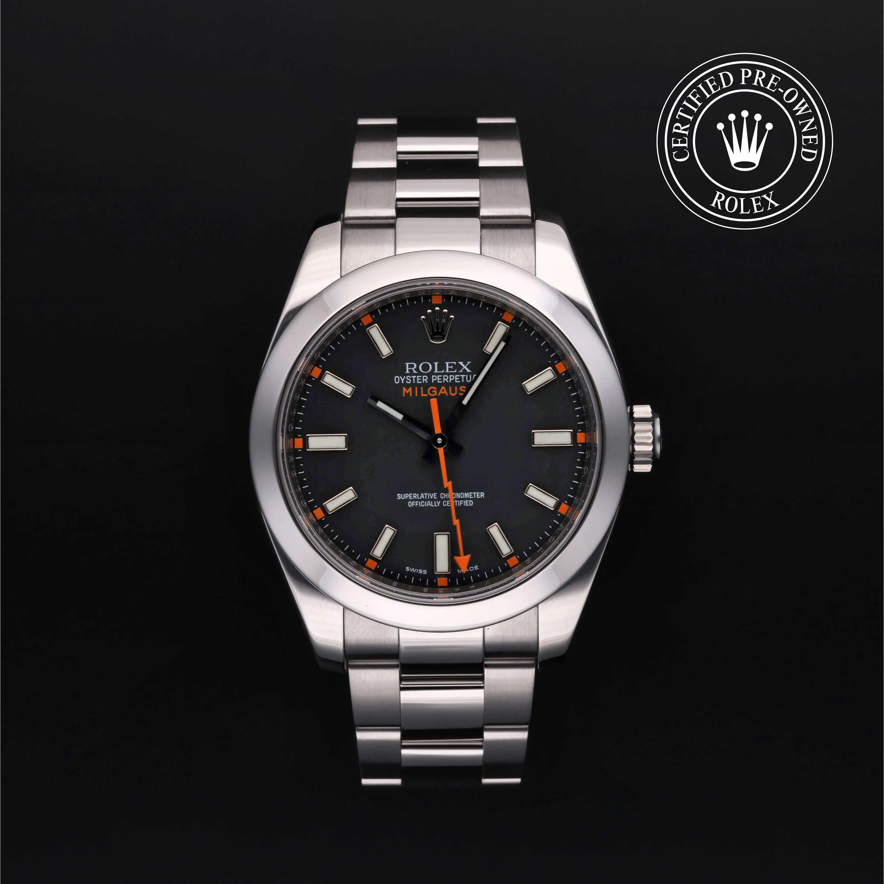 Rolex Certified Pre-Owned Milgauss (116400) self - winding automatic watch, features a 40mm stainless steel case surrounding a black dial with a clear sapphire crystal. The watch is secured on a stainless steel Oyster bracelet complete with a folding buckle. Functions include hours, minutes, seconds and is anti-magnetic. This watch has been serviced by an authorized service center and certified by Rolex. It comes with the original papers and includes a custom Rolex Certified Pre-Owned hang tag, travel pouch and international warranty card.