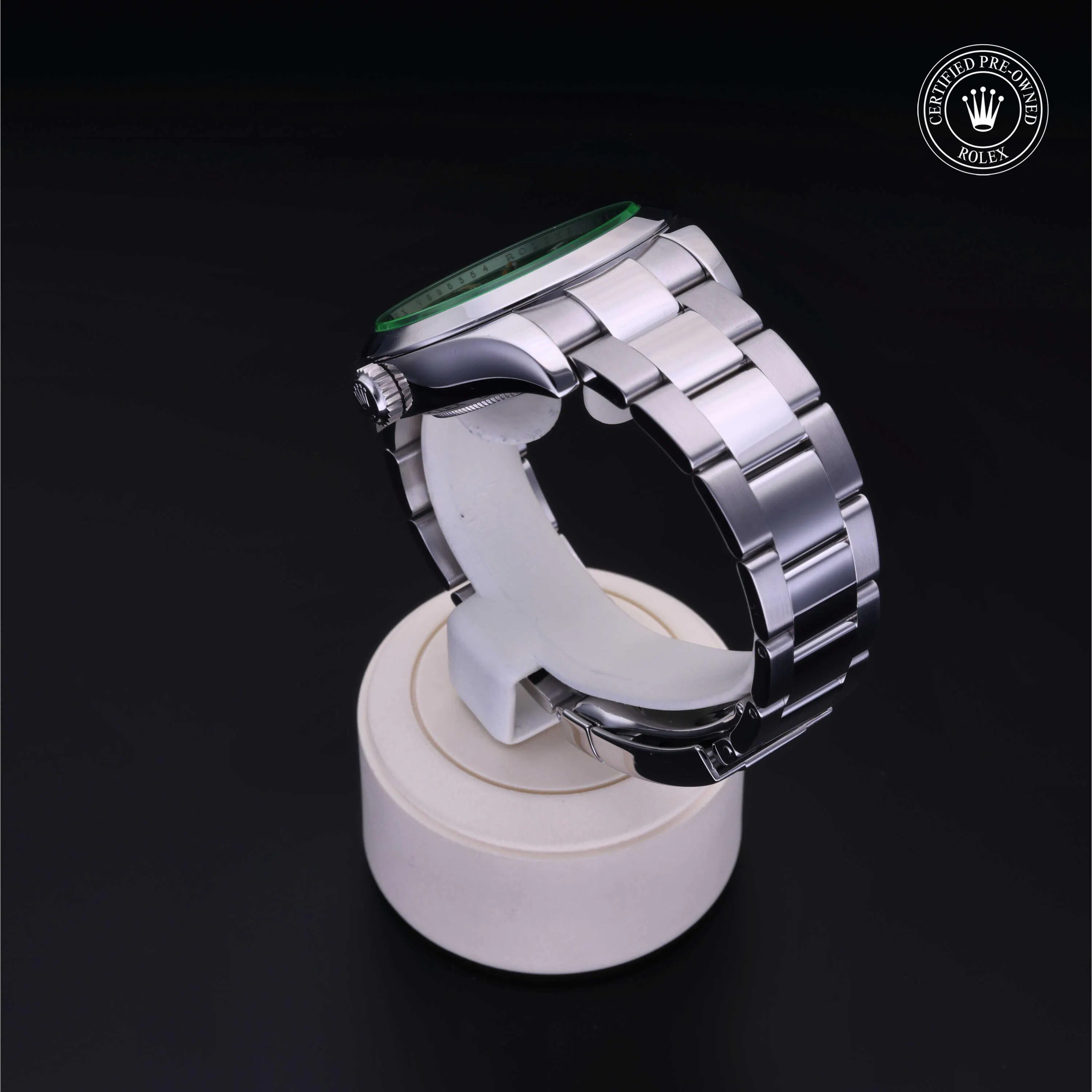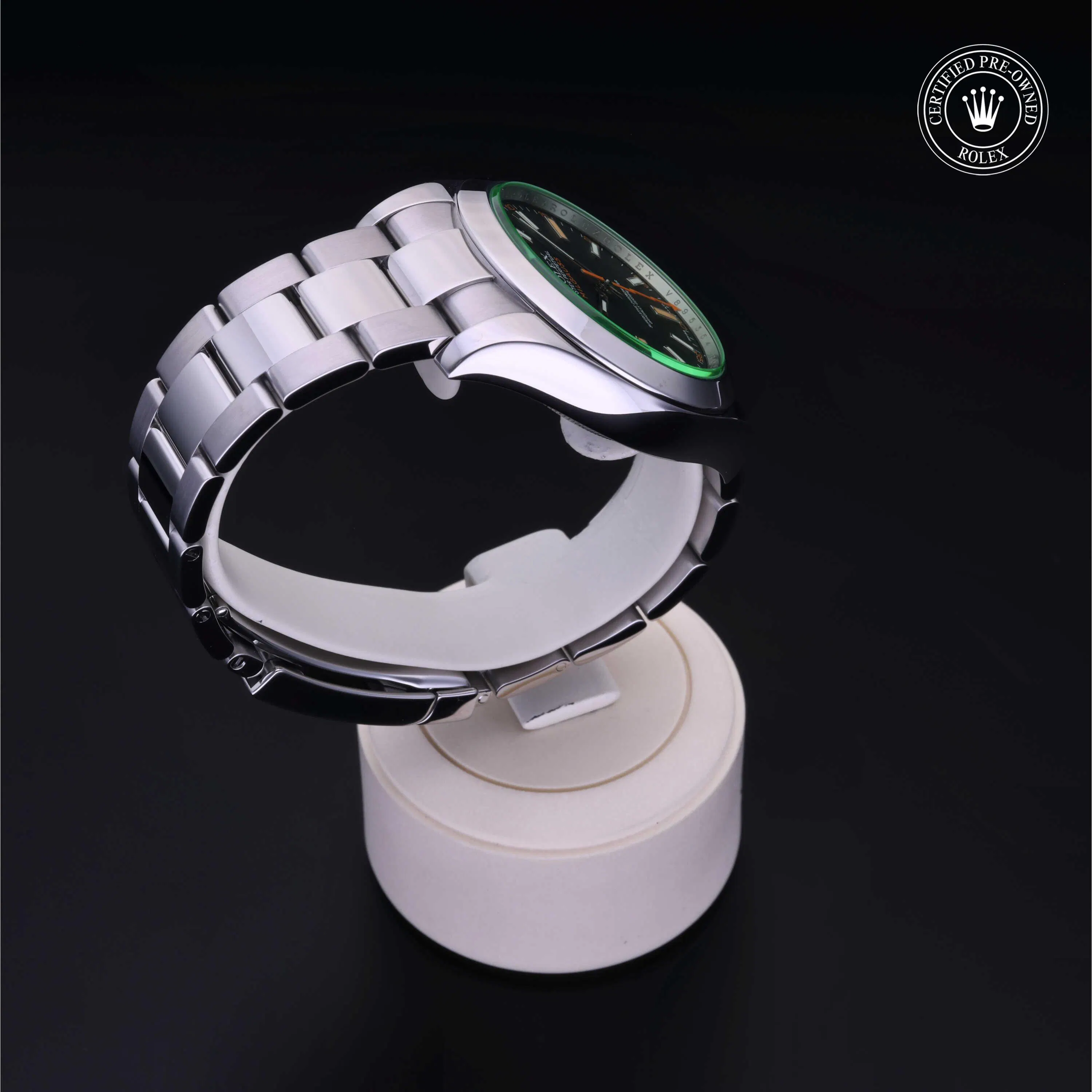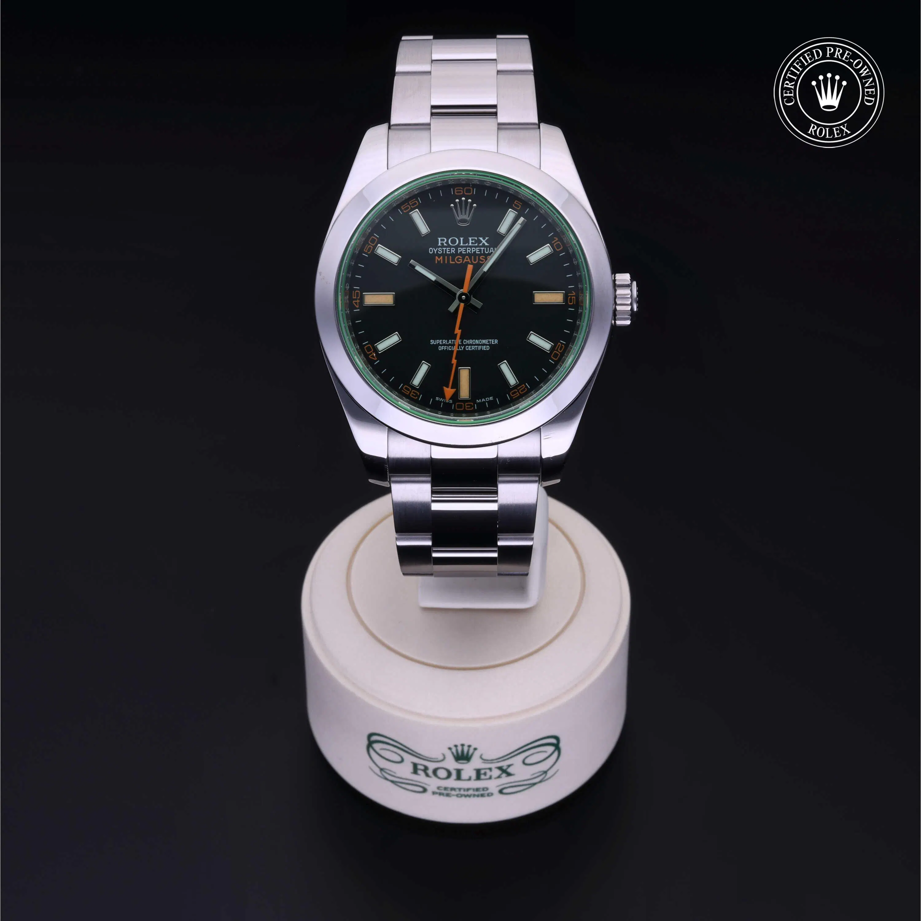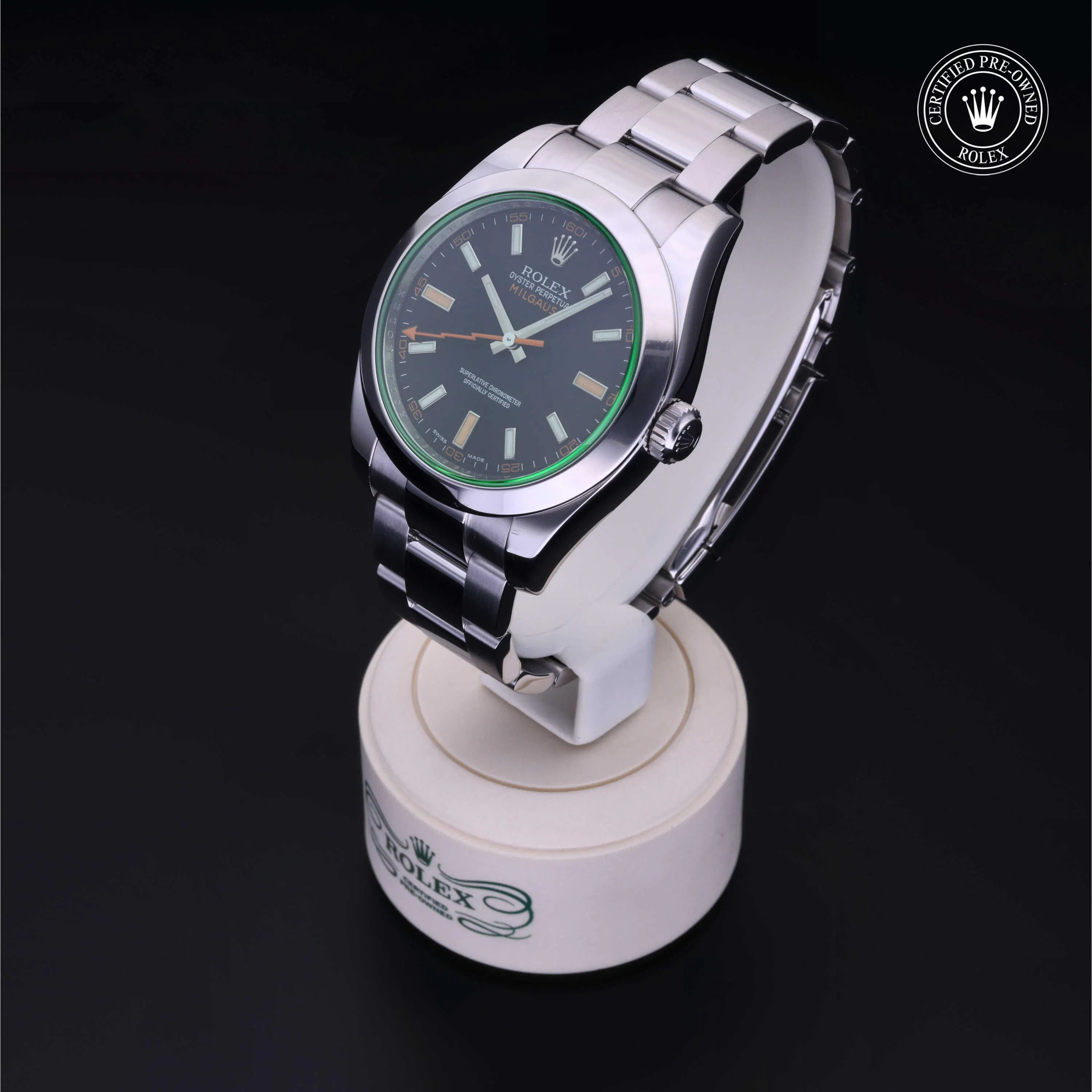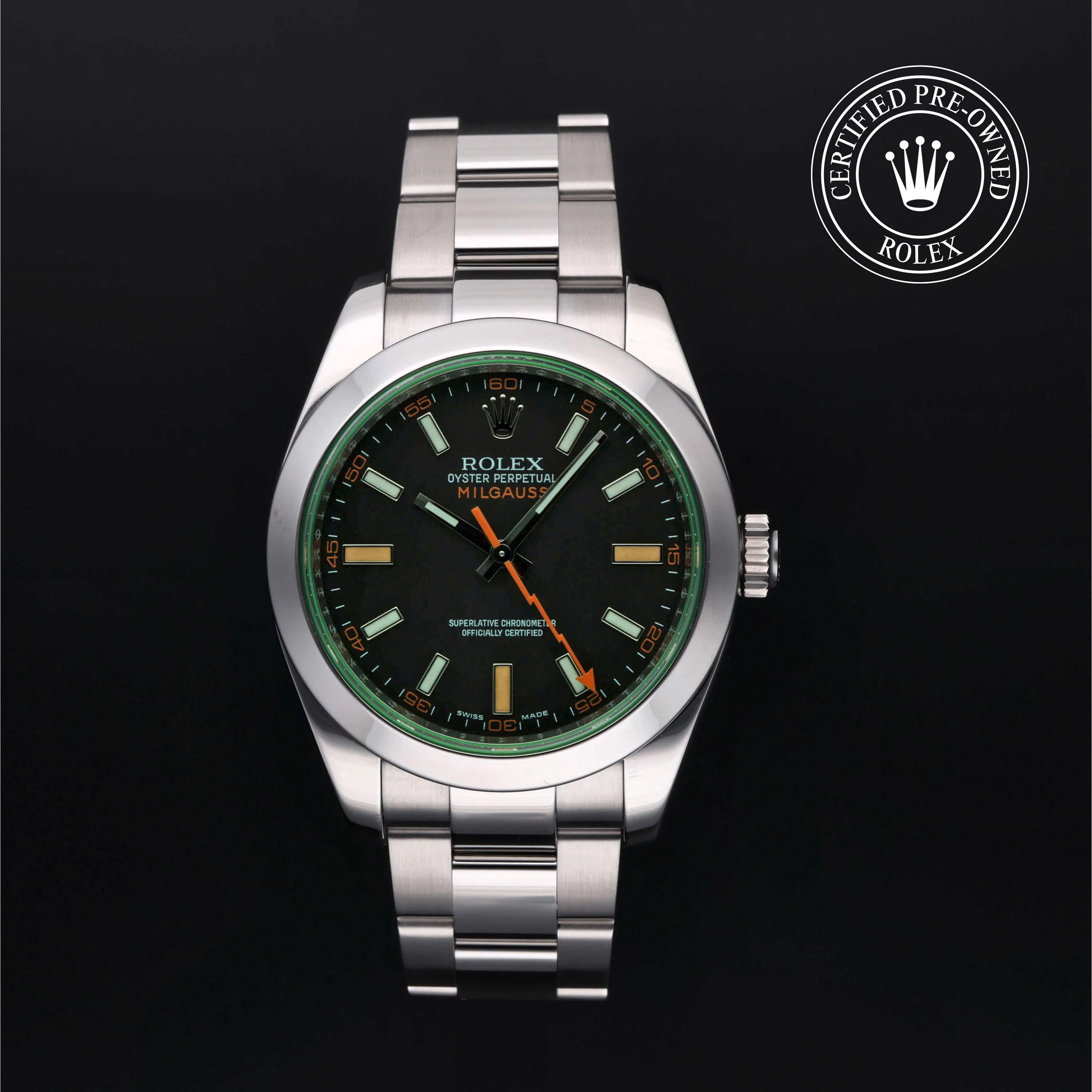 Rolex Certified Pre-Owned Milgauss (116400GV) self - winding automatic watch, features a 40mm stainless steel case and smooth bezel surrounding an intense black dial with a green sapphire crystal on a stainless steel oyster bracelet. Functions include hours, minutes, seconds and anti-magnetic. This watch has received Rolex-authorized service and certification. It does not come with the original box or papers, but includes a custom Rolex Certified Pre-Owned hang tag, travel pouch and RCPO international warranty card.