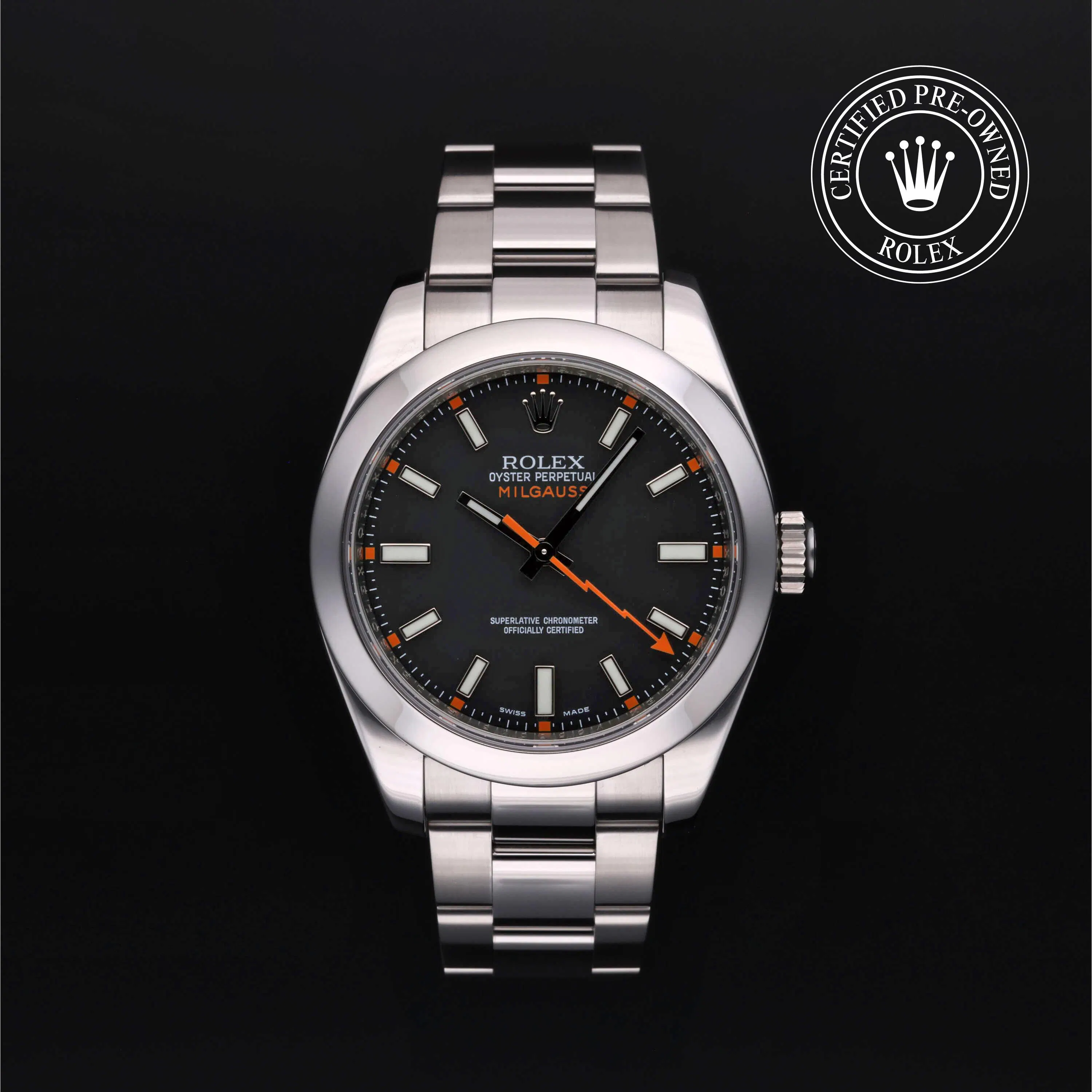 Rolex Certified Pre-Owned Milgauss (116400) self - winding automatic watch, features a 40mm stainless steel case and smooth bezel surrounding a black dial on a stainless steel Oyster bracelet. Functions include hours, minutes, seconds and anti-magnetic. This watch has received Rolex-authorized service and certification. It does not come with the original box or papers, but includes a custom Rolex Certified Pre-Owned hang tag, travel pouch and RCPO international warranty card.