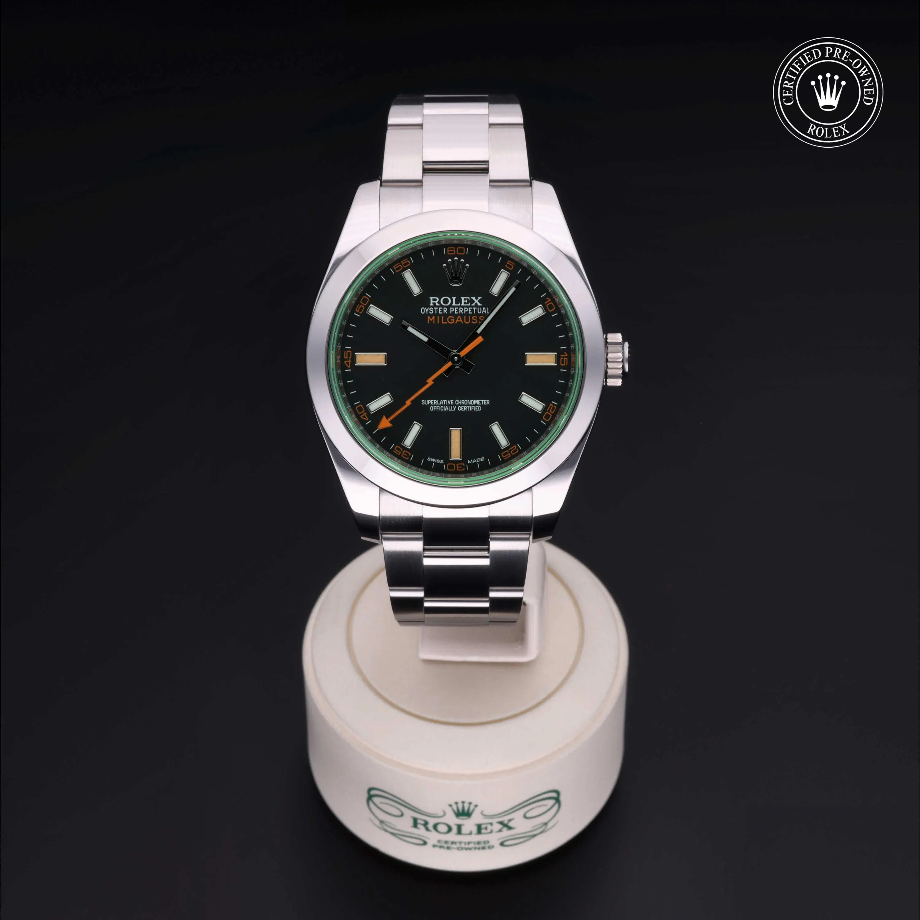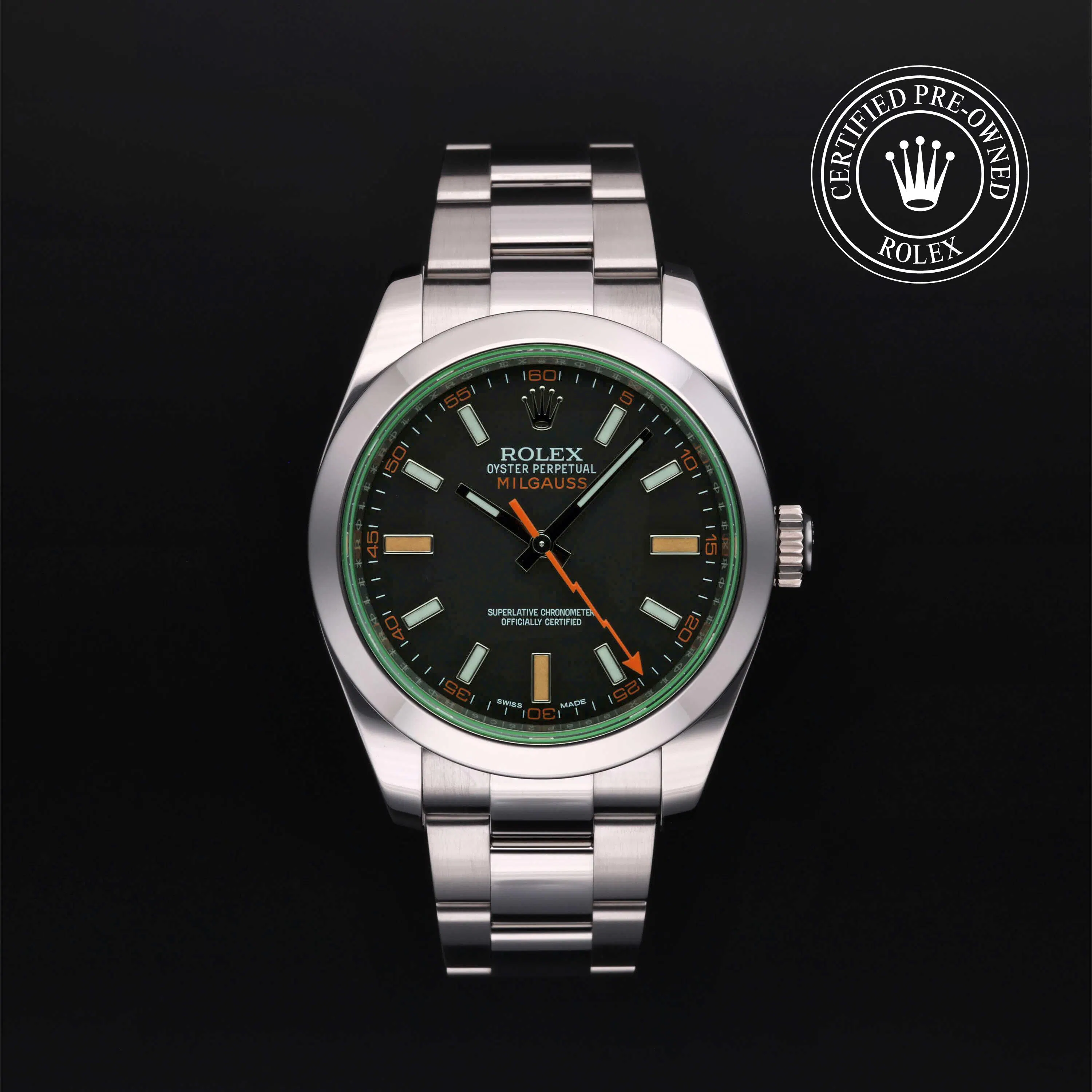 Rolex Certified Pre-Owned Milgauss (116400GV) self - winding automatic watch, features a 40mm stainless steel case and smooth bezel surrounding an intense black dial with a green sapphire crystal on a stainless steel Oyster bracelet. Functions include hours, minutes, seconds and anti-magnetic. This watch has received Rolex-authorized service and certification. It comes with the original papers, and includes a custom Rolex Certified Pre-Owned hang tag, travel pouch and RCPO international warranty card.