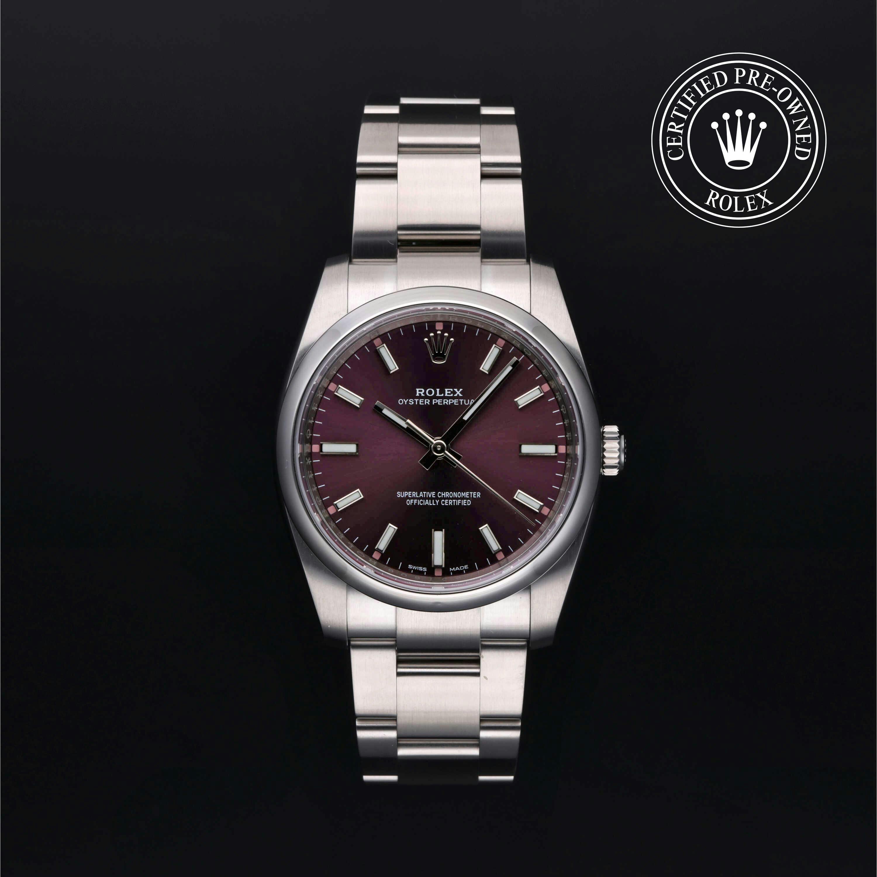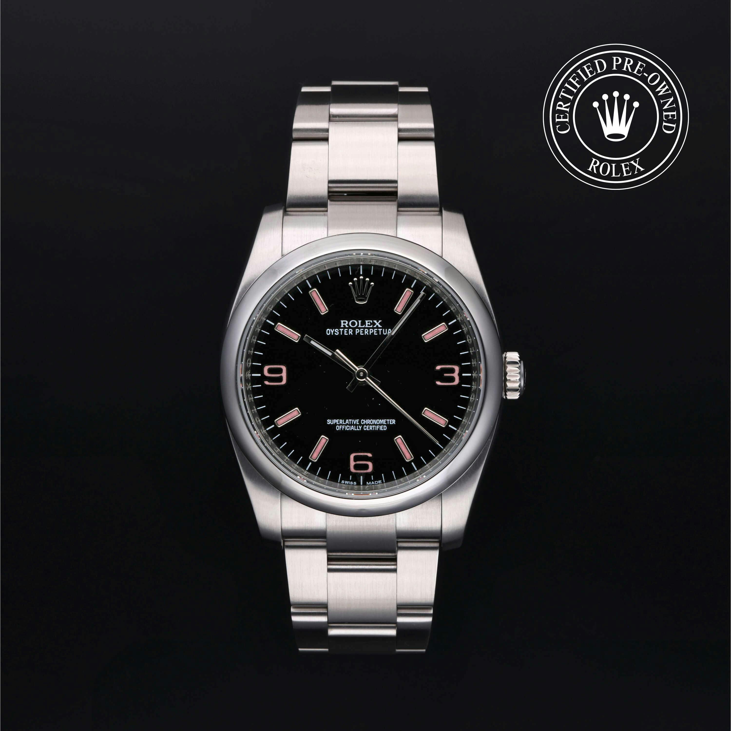 This 39mm stainless steel Oyster Perpetual features a clean white dial and 100m waterproofness. It appeals to collectors looking for a discontinued size with modern proportions and understated elegance in a used Rolex Oyster Perpetual.
