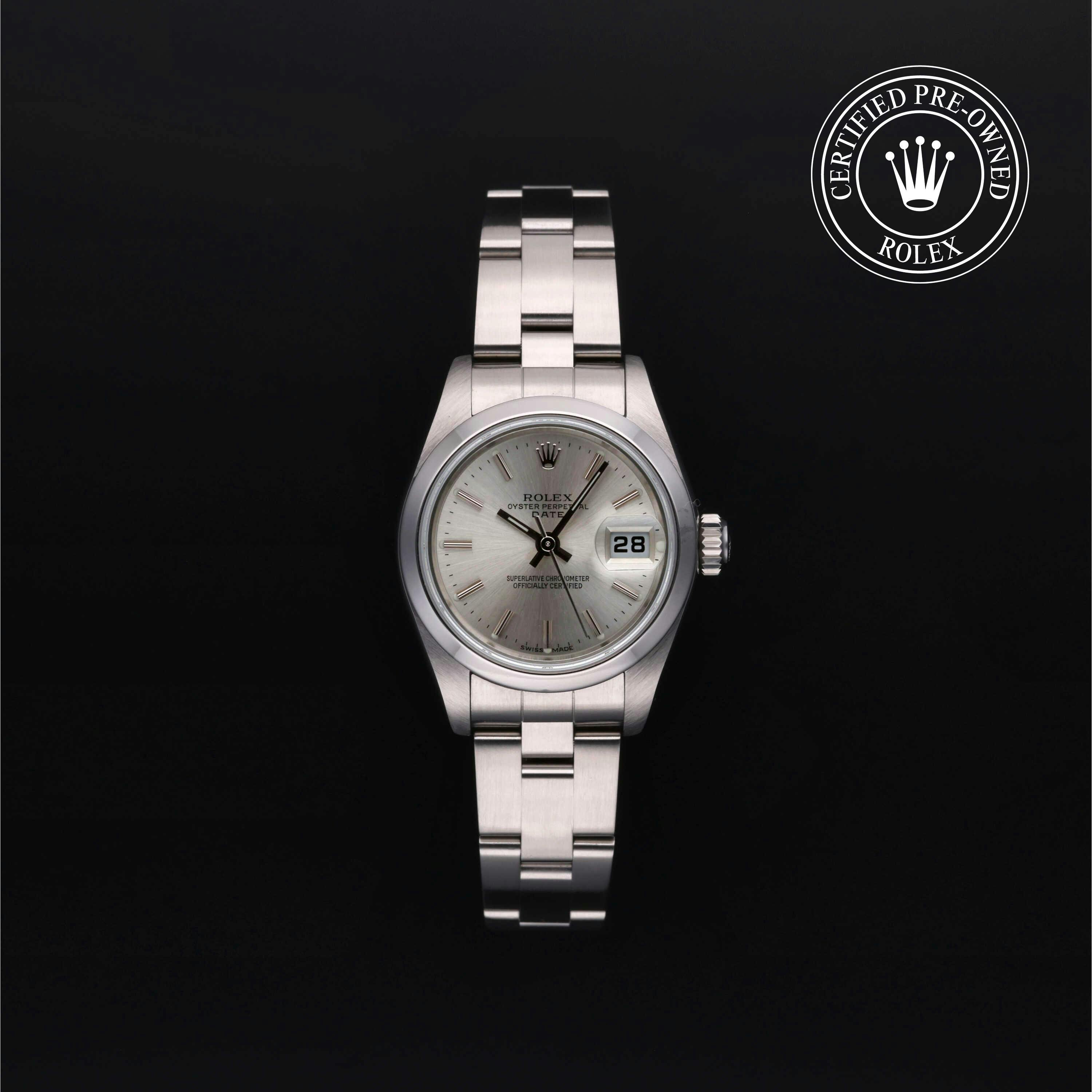 Sleek and striking, this silver dial Oyster Perpetual features a 34mm stainless steel case and the iconic 3-6-9 Explorer-style hour markers. It remains a favorite for those seeking used mid-size Rolex watches.