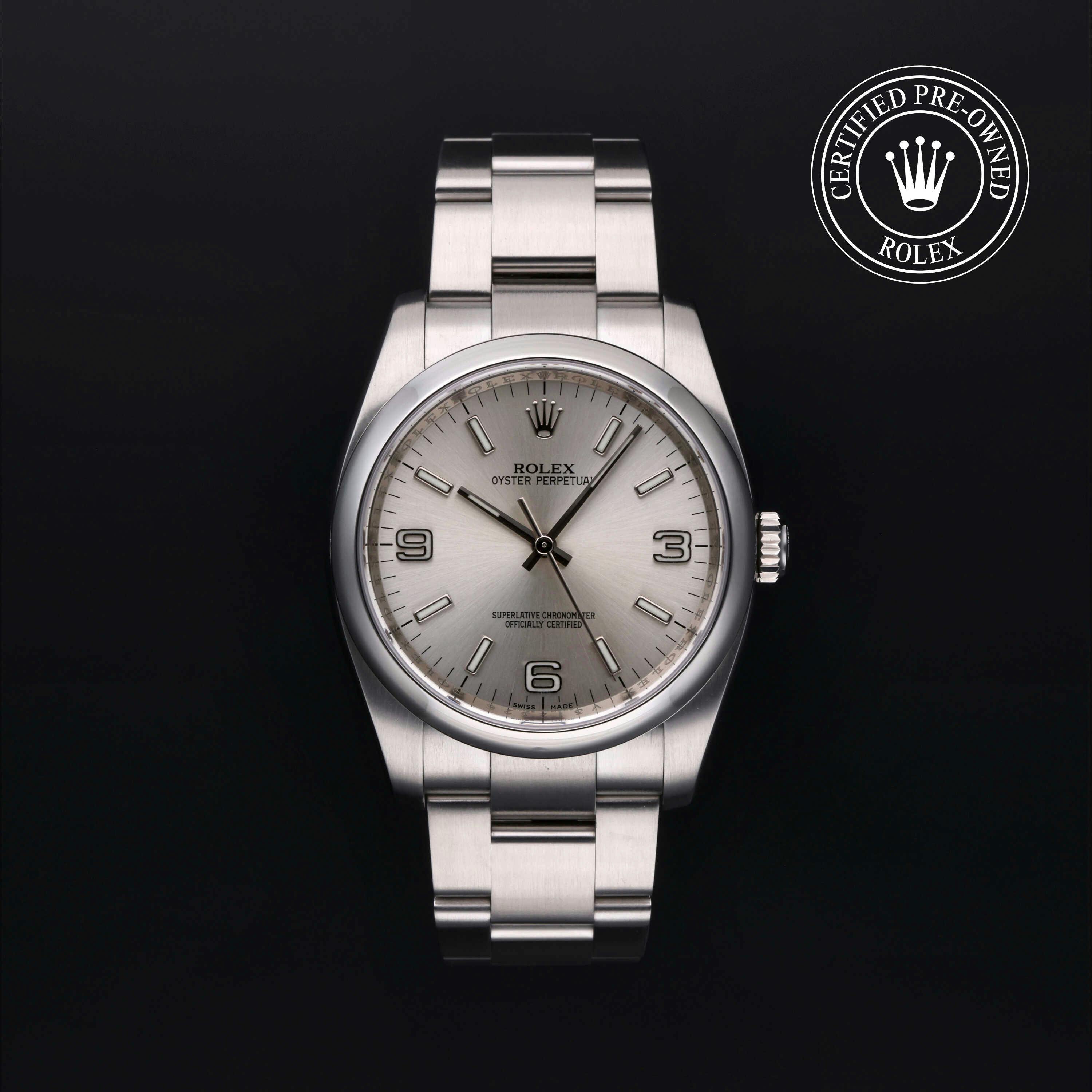 Sleek and striking, this silver dial Oyster Perpetual features a 34mm stainless steel case and the iconic 3-6-9 Explorer-style hour markers. It remains a favorite for those seeking used mid-size Rolex watches.