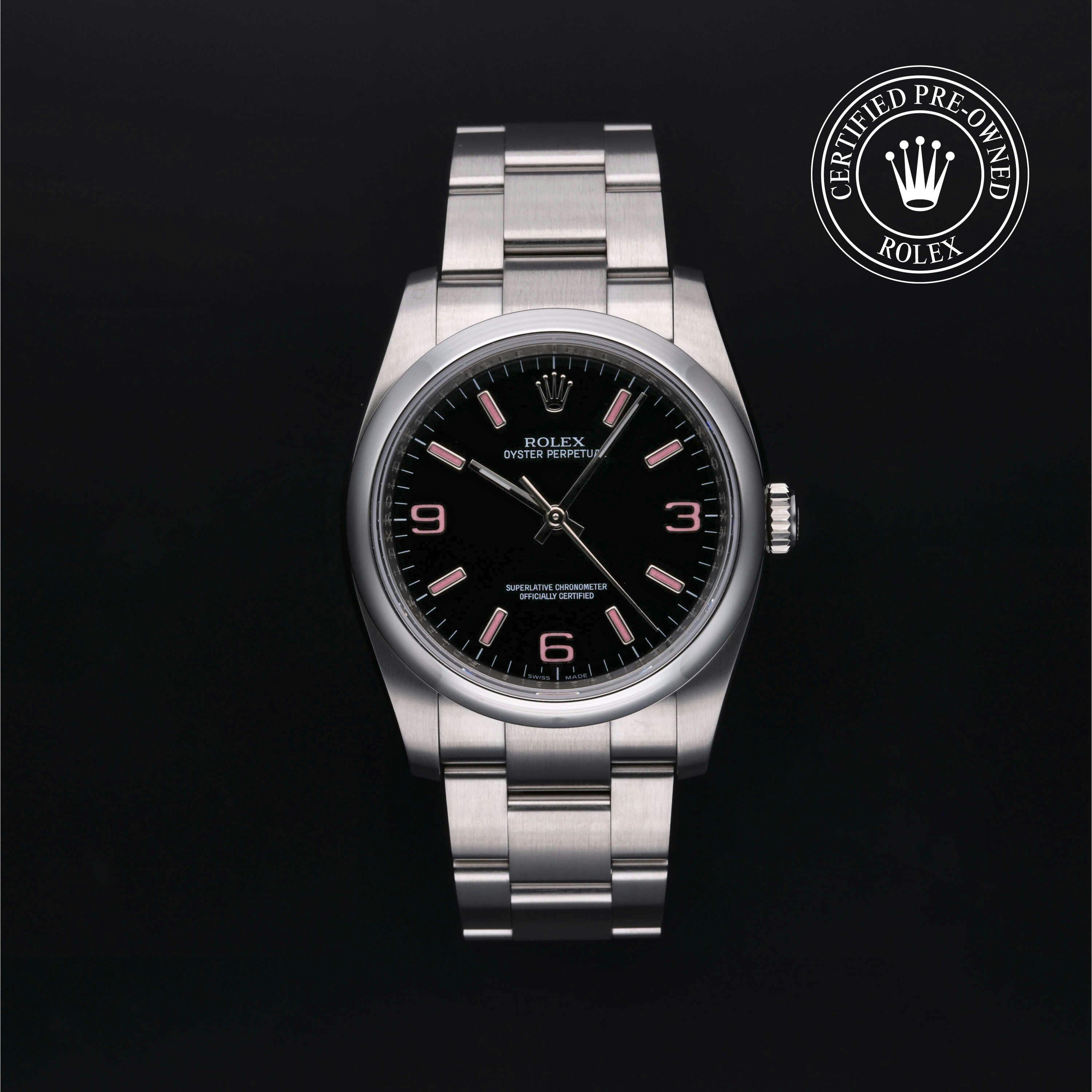 This 39mm stainless steel Oyster Perpetual features a clean white dial and 100m waterproofness. It appeals to collectors looking for a discontinued size with modern proportions and understated elegance in a used Rolex Oyster Perpetual.