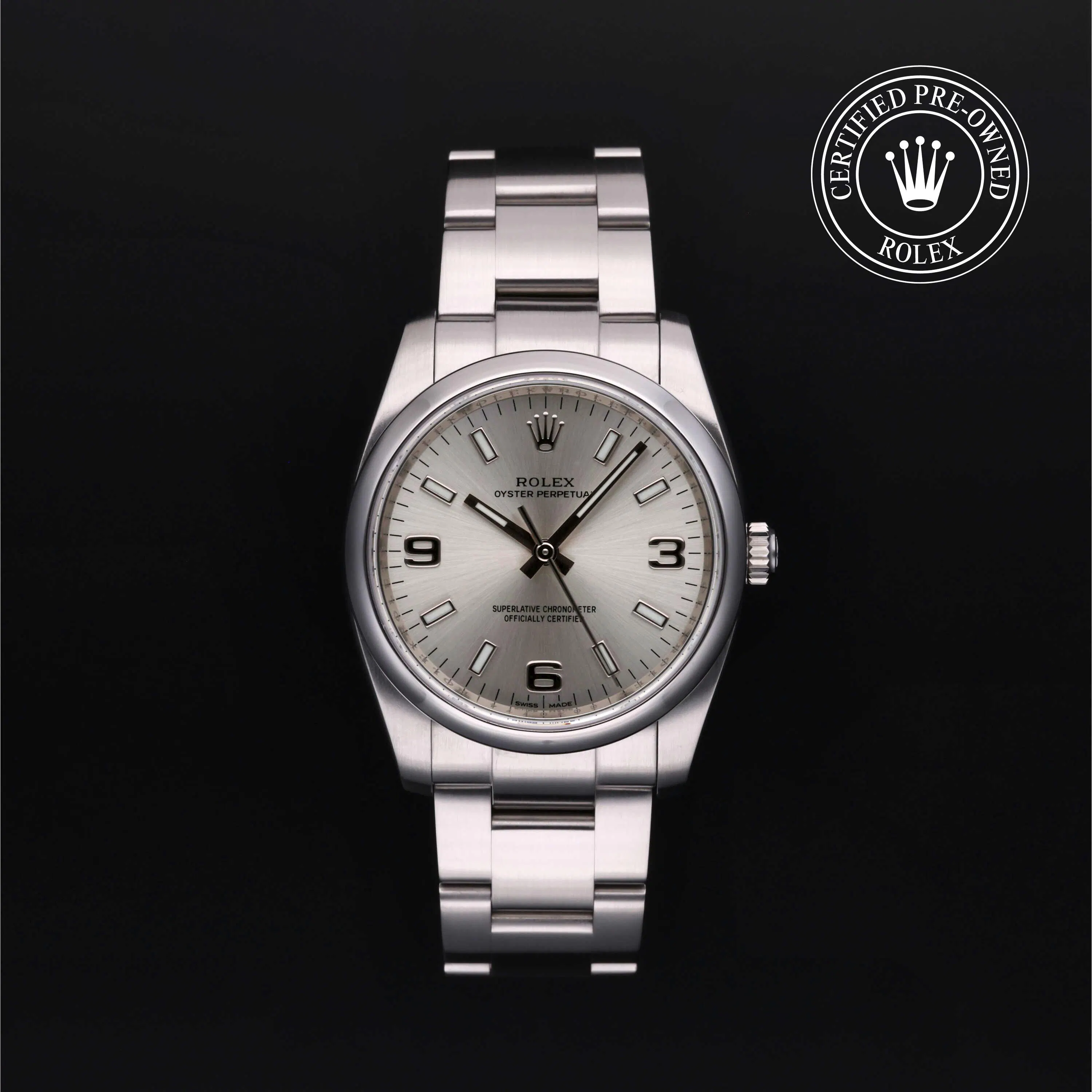 Sleek and striking, this silver dial Oyster Perpetual features a 34mm stainless steel case and the iconic 3-6-9 Explorer-style hour markers. It remains a favorite for those seeking used mid-size Rolex watches.