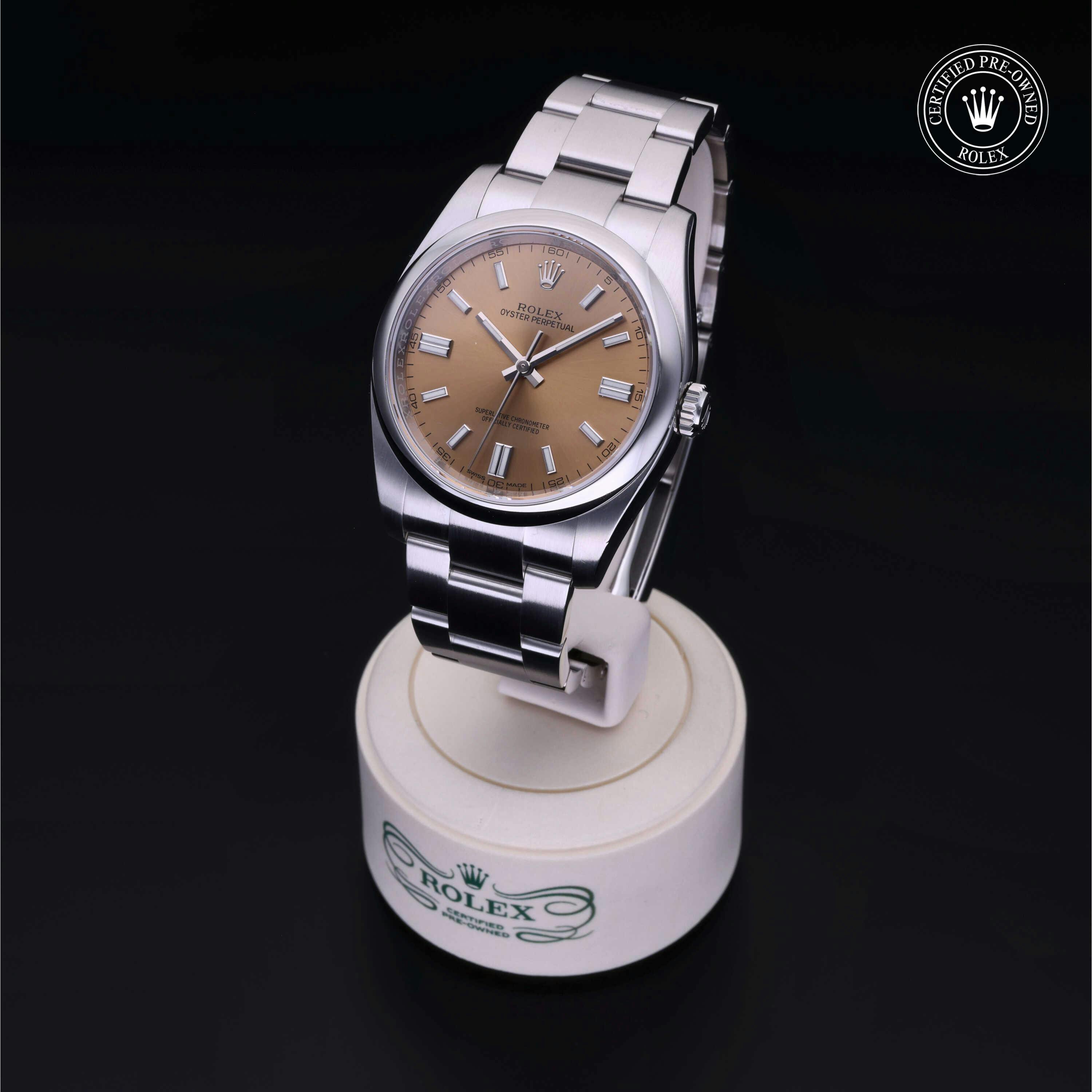 This 39mm stainless steel Oyster Perpetual features a clean white dial and 100m waterproofness. It appeals to collectors looking for a discontinued size with modern proportions and understated elegance in a used Rolex Oyster Perpetual.