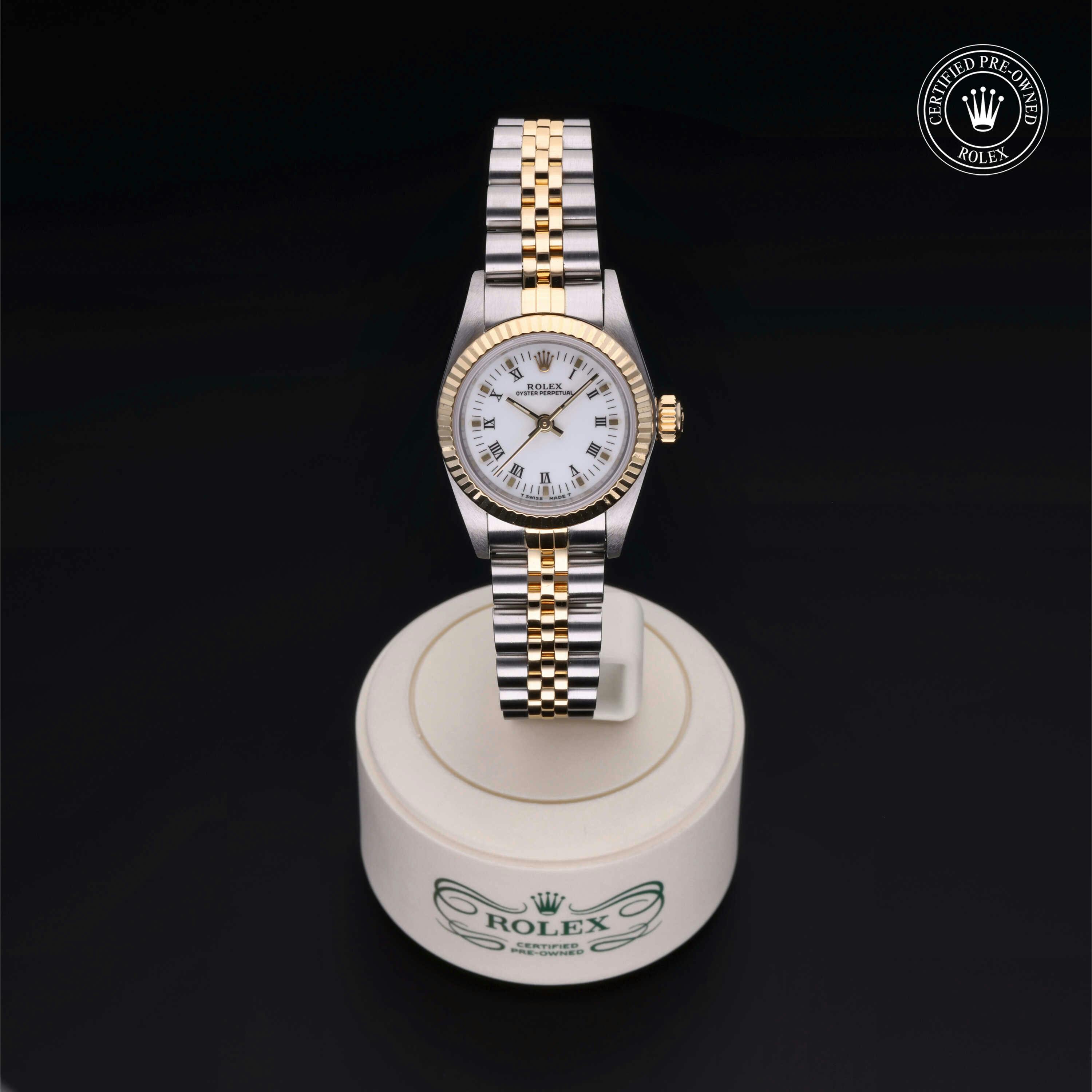 Rolex Certified Pre-Owned Oyster Perpetual (67193) self - winding automatic watch, features a 24mm stainless steel case with an 18k yellow gold fluted bezel surrounding a white dial on a stainless steel and 18k yellow gold jubilee bracelet. Functions include hours, minutes and seconds. This watch has received Rolex-authorized service and certification. It does not come with the original box or papers, but includes a custom Rolex Certified Pre-Owned hang tag, travel pouch and RCPO international warranty card.