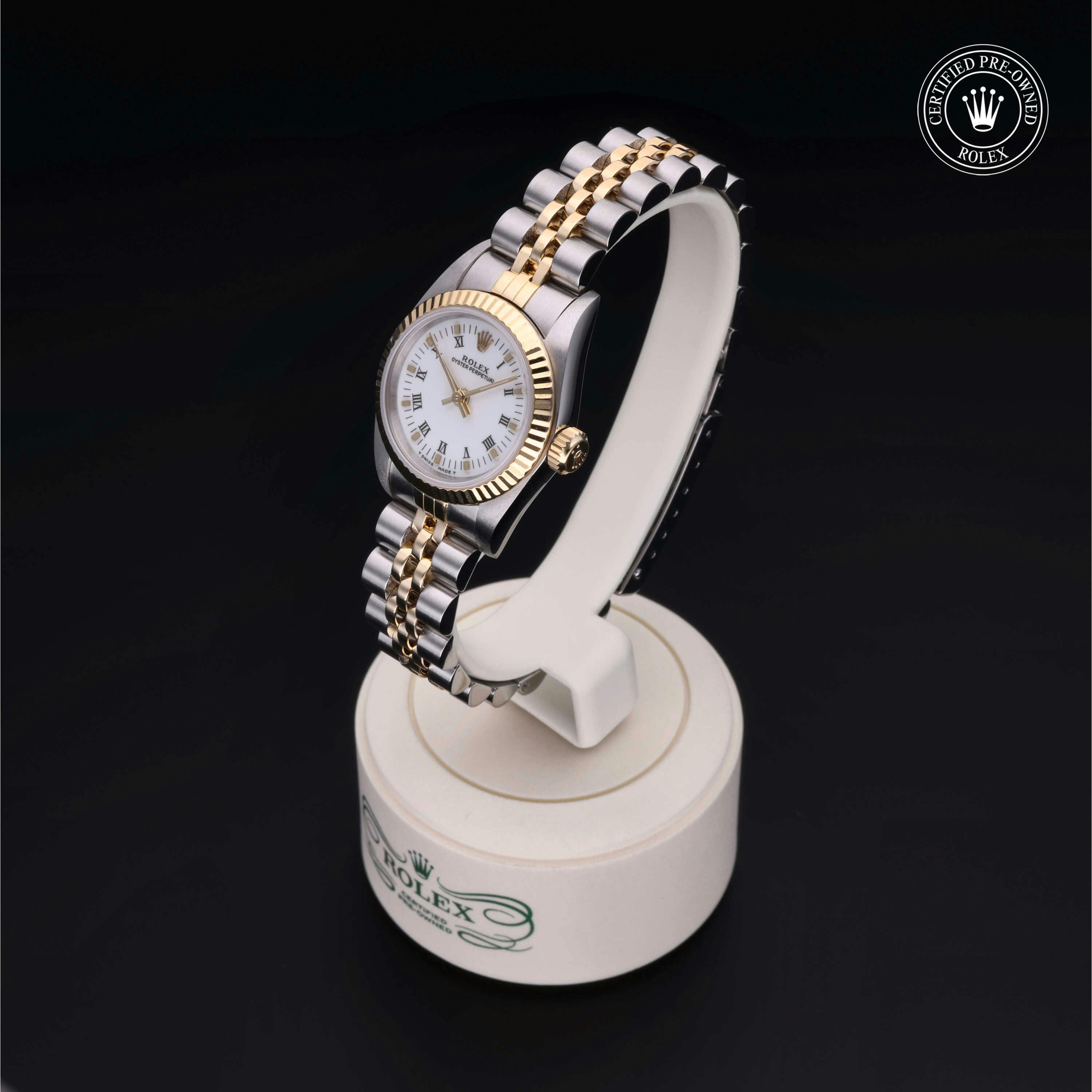 Rolex Certified Pre-Owned Oyster Perpetual (67193) self - winding automatic watch, features a 24mm stainless steel case with an 18k yellow gold fluted bezel surrounding a white dial on a stainless steel and 18k yellow gold jubilee bracelet. Functions include hours, minutes and seconds. This watch has received Rolex-authorized service and certification. It does not come with the original box or papers, but includes a custom Rolex Certified Pre-Owned hang tag, travel pouch and RCPO international warranty card.