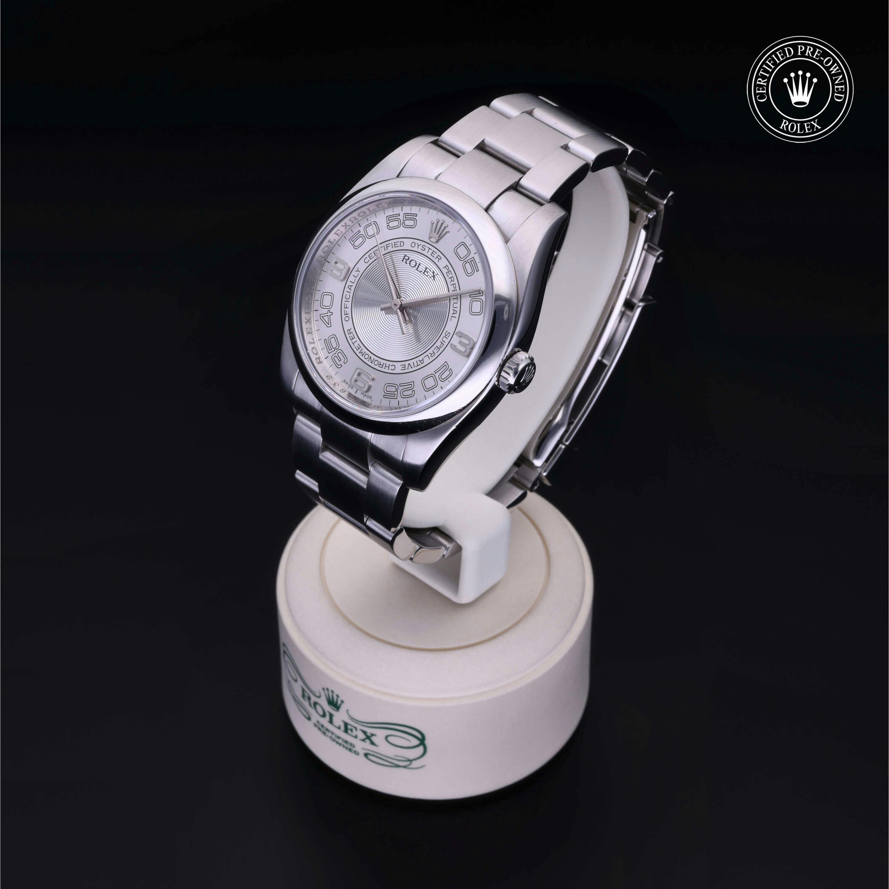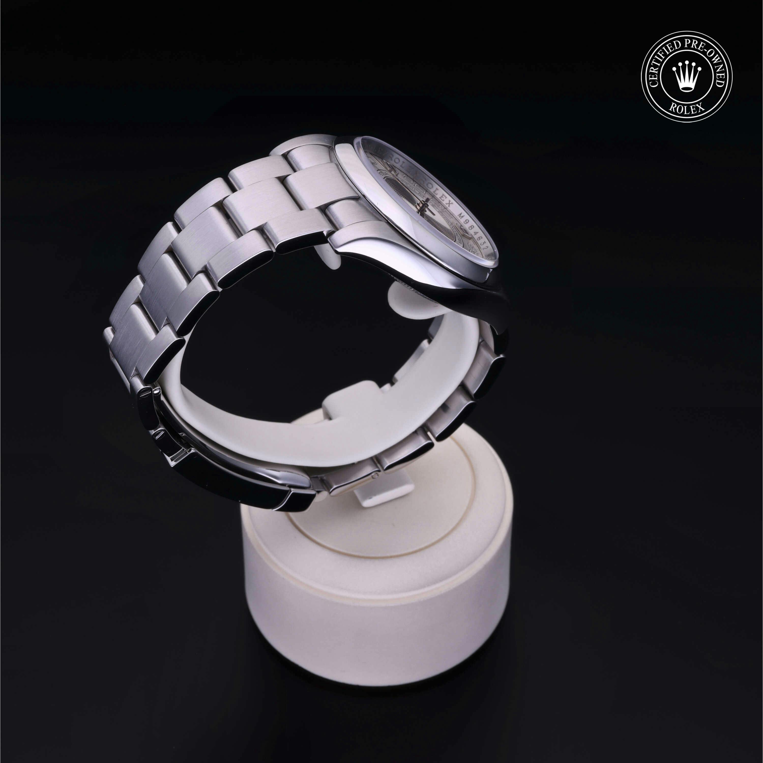Rolex Certified Pre-Owned Oyster Perpetual (116000) self - winding automatic watch, features a 36mm stainless steel case and domed bezel surrounding a silver concentric dial on a stainless steel oyster bracelet. Functions include hours, minutes and seconds. This watch has received Rolex-authorized service and certification. It does not come with the original box or papers, but includes a custom Rolex Certified Pre-Owned hang tag, travel pouch and RCPO international warranty card.