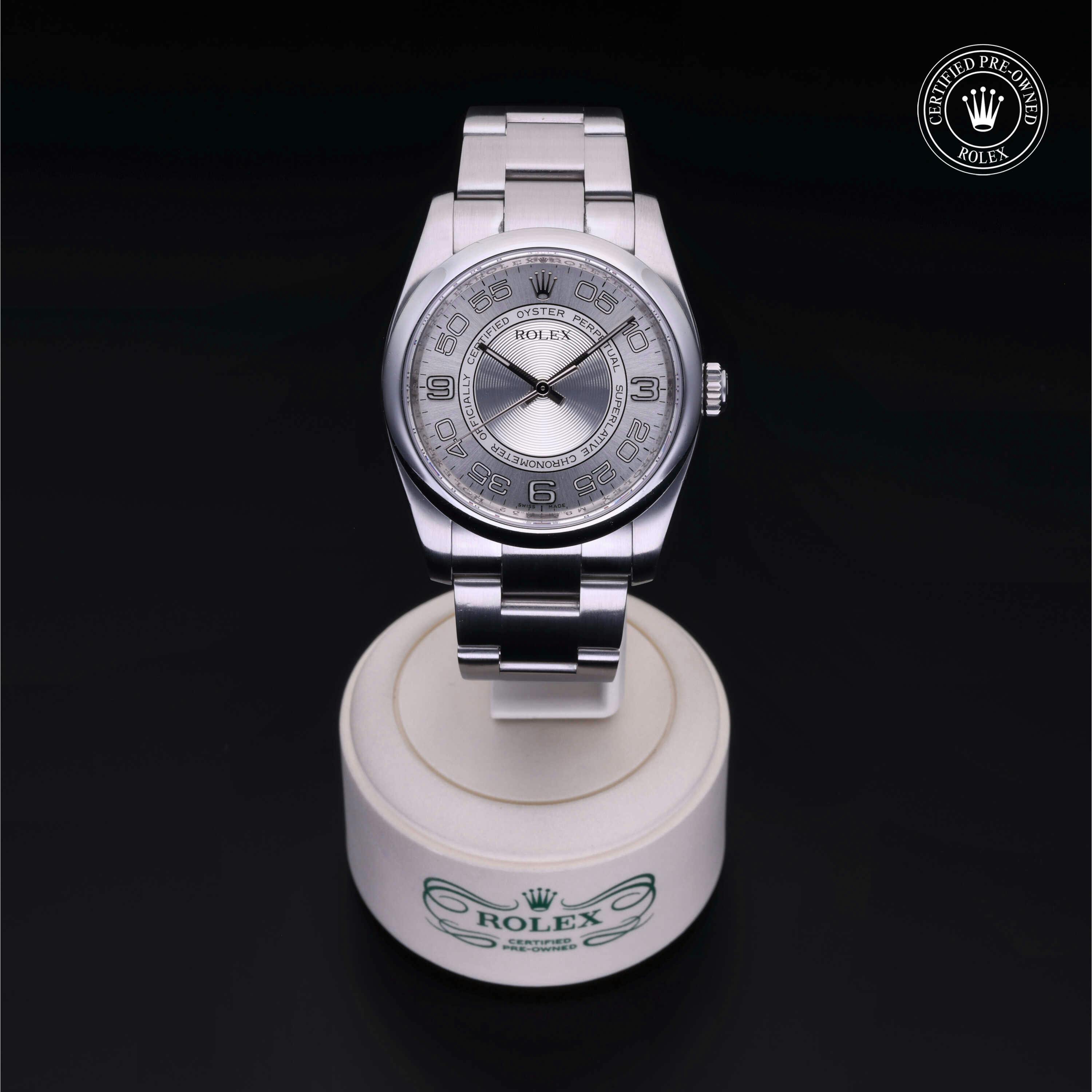 Rolex Certified Pre-Owned Oyster Perpetual (116000) self - winding automatic watch, features a 36mm stainless steel case and domed bezel surrounding a silver concentric dial on a stainless steel oyster bracelet. Functions include hours, minutes and seconds. This watch has received Rolex-authorized service and certification. It does not come with the original box or papers, but includes a custom Rolex Certified Pre-Owned hang tag, travel pouch and RCPO international warranty card.