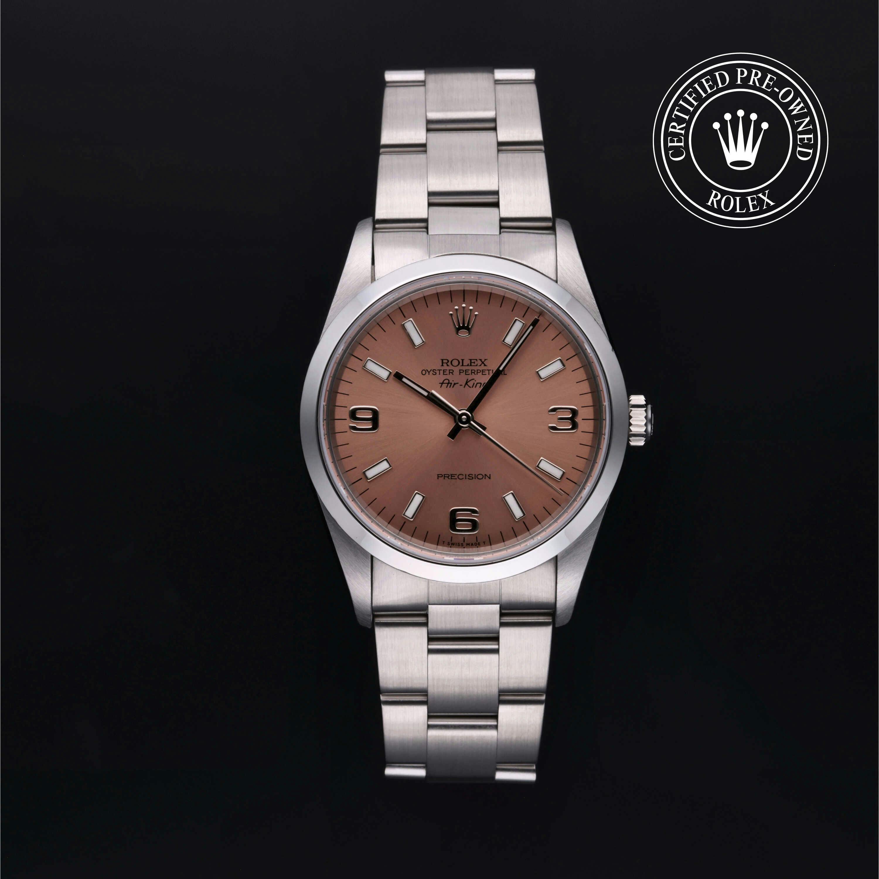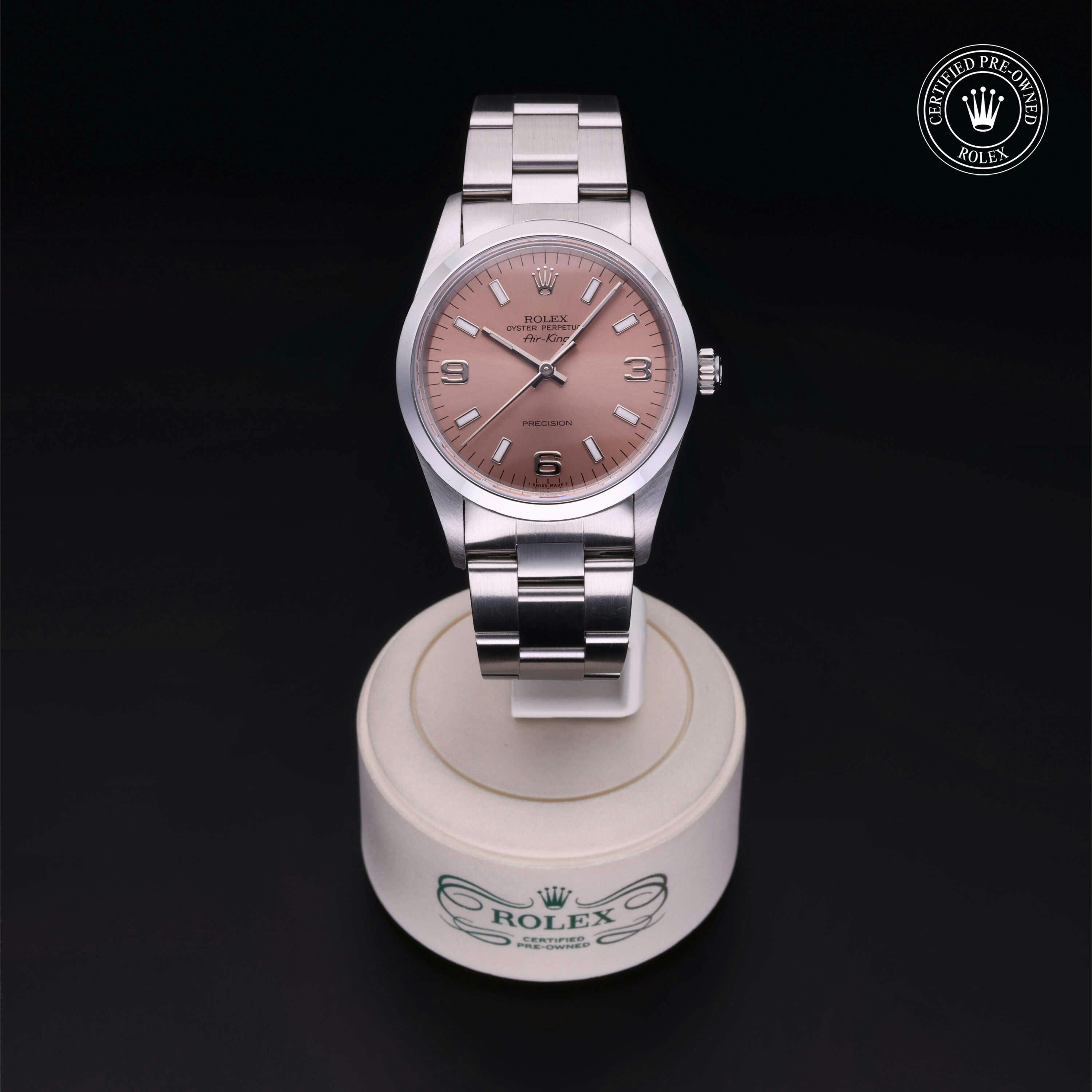 Rolex Certified Pre-Owned Oyster Perpetual Air-King (14000) self - winding automatic watch, features a 34mm stainless steel case and smooth bezel surrounding a pink dial on a stainless steel oyster bracelet. Functions include hours, minutes and seconds. This watch has received Rolex-authorized service and certification. It does not come with the original box or papers, but includes a custom Rolex Certified Pre-Owned hang tag, travel pouch and RCPO international warranty card.