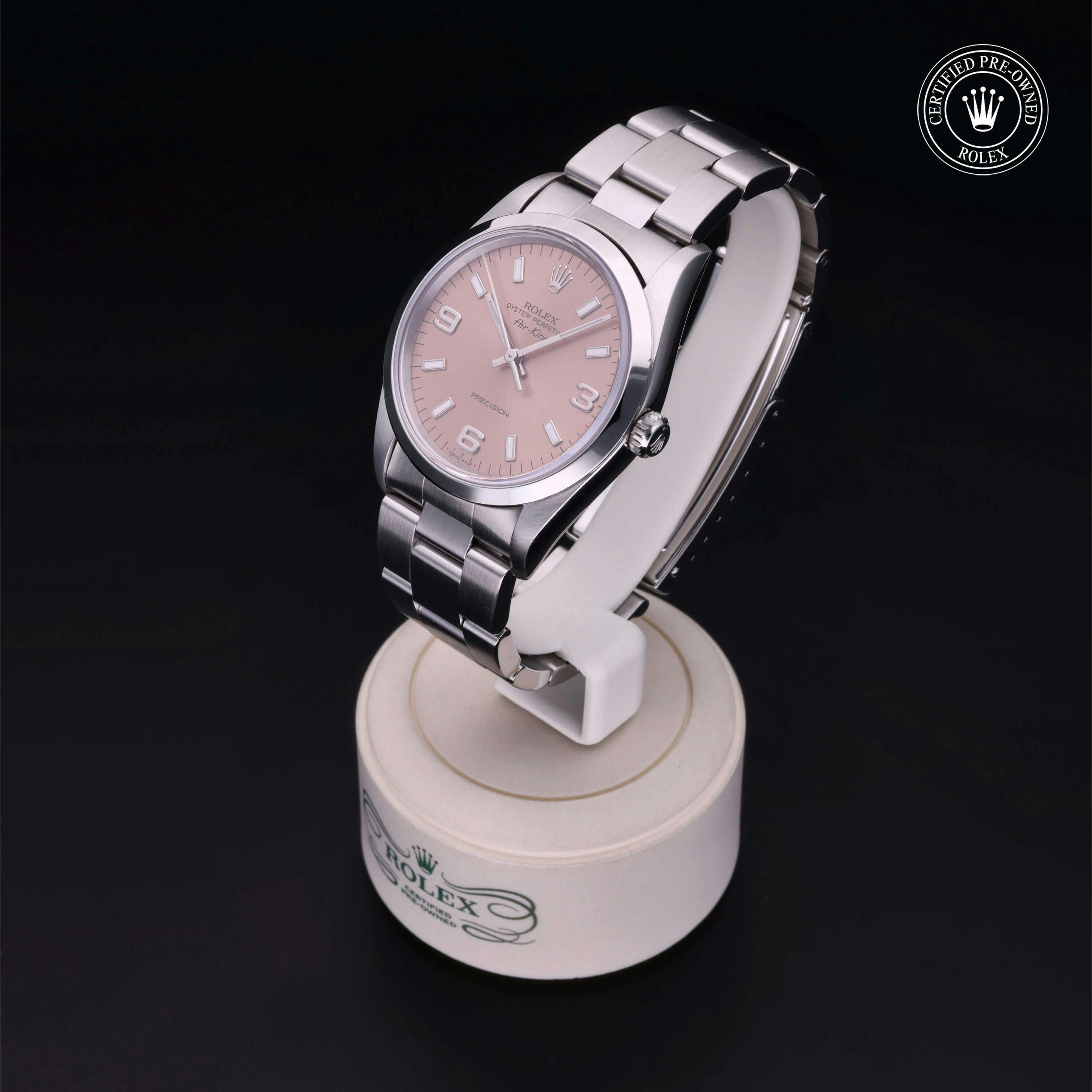 Rolex Certified Pre-Owned Oyster Perpetual Air-King (14000) self - winding automatic watch, features a 34mm stainless steel case and smooth bezel surrounding a pink dial on a stainless steel oyster bracelet. Functions include hours, minutes and seconds. This watch has received Rolex-authorized service and certification. It does not come with the original box or papers, but includes a custom Rolex Certified Pre-Owned hang tag, travel pouch and RCPO international warranty card.