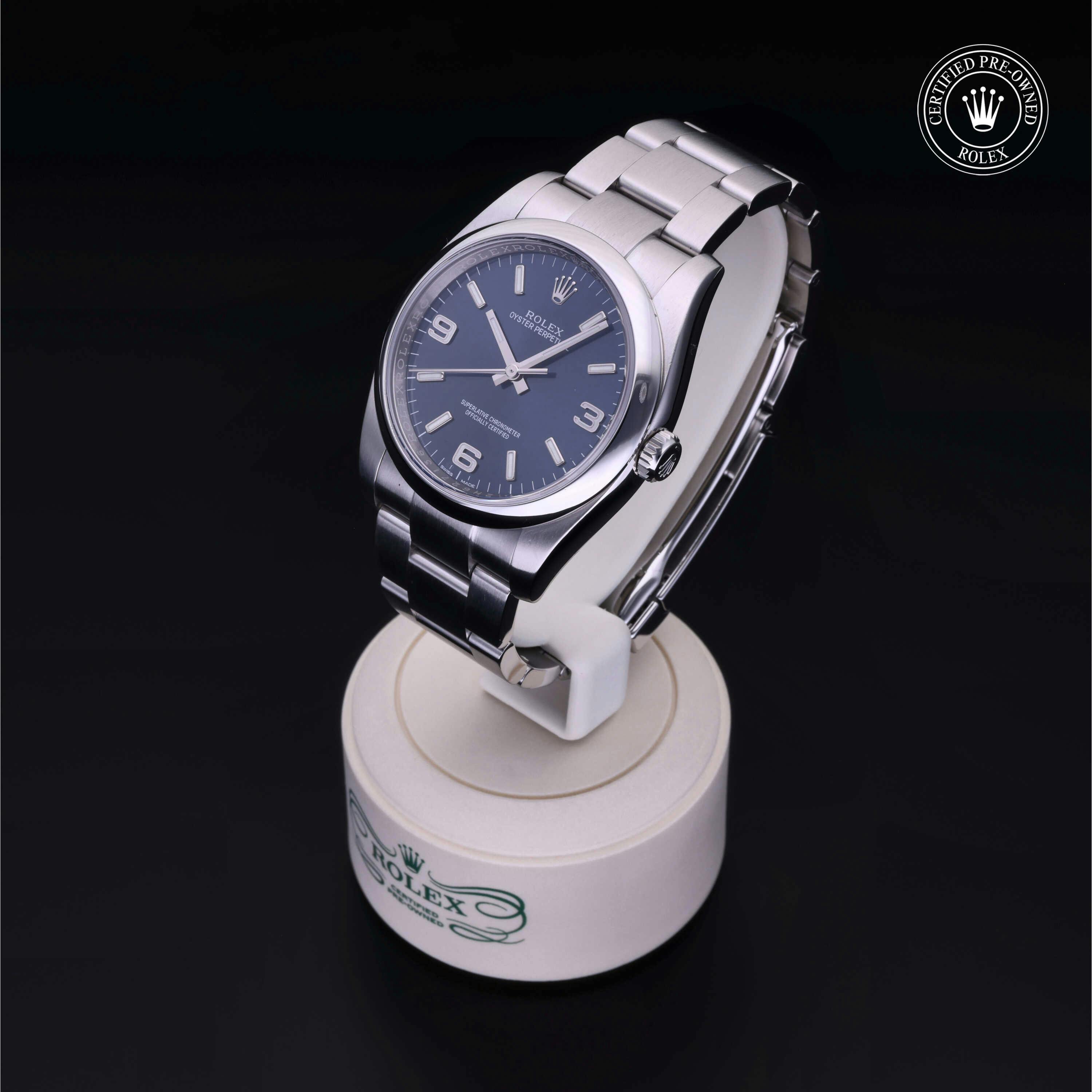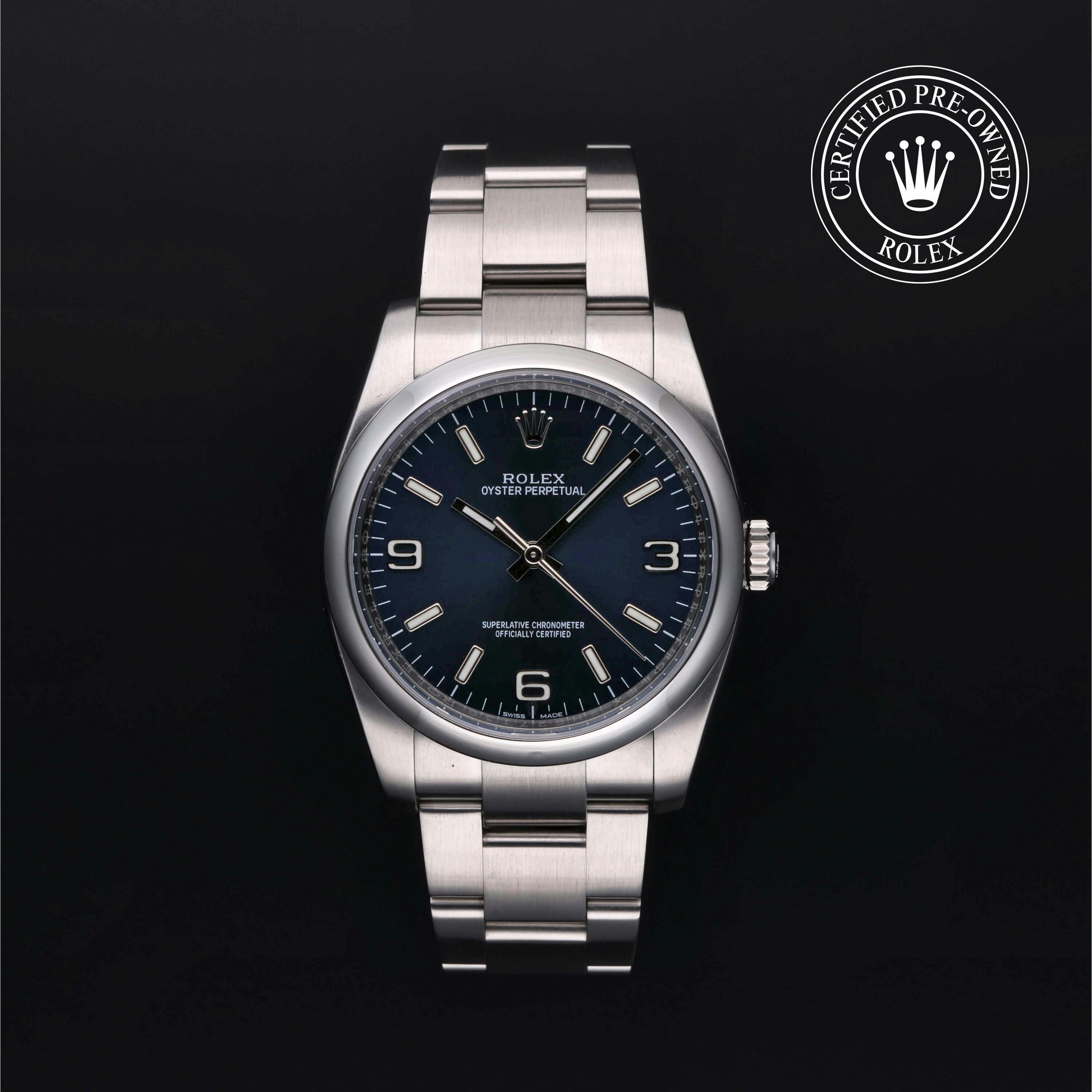Rolex Certified Pre-Owned Oyster Perpetual (116000) self - winding automatic watch, features a 36mm stainless steel case and domed bezel surrounding a blue dial on a stainless steel oyster bracelet. Functions include hours, minutes and seconds. This watch has received Rolex-authorized service and certification. It does not come with the original box or papers, but includes a custom Rolex Certified Pre-Owned hang tag, travel pouch and RCPO international warranty card.