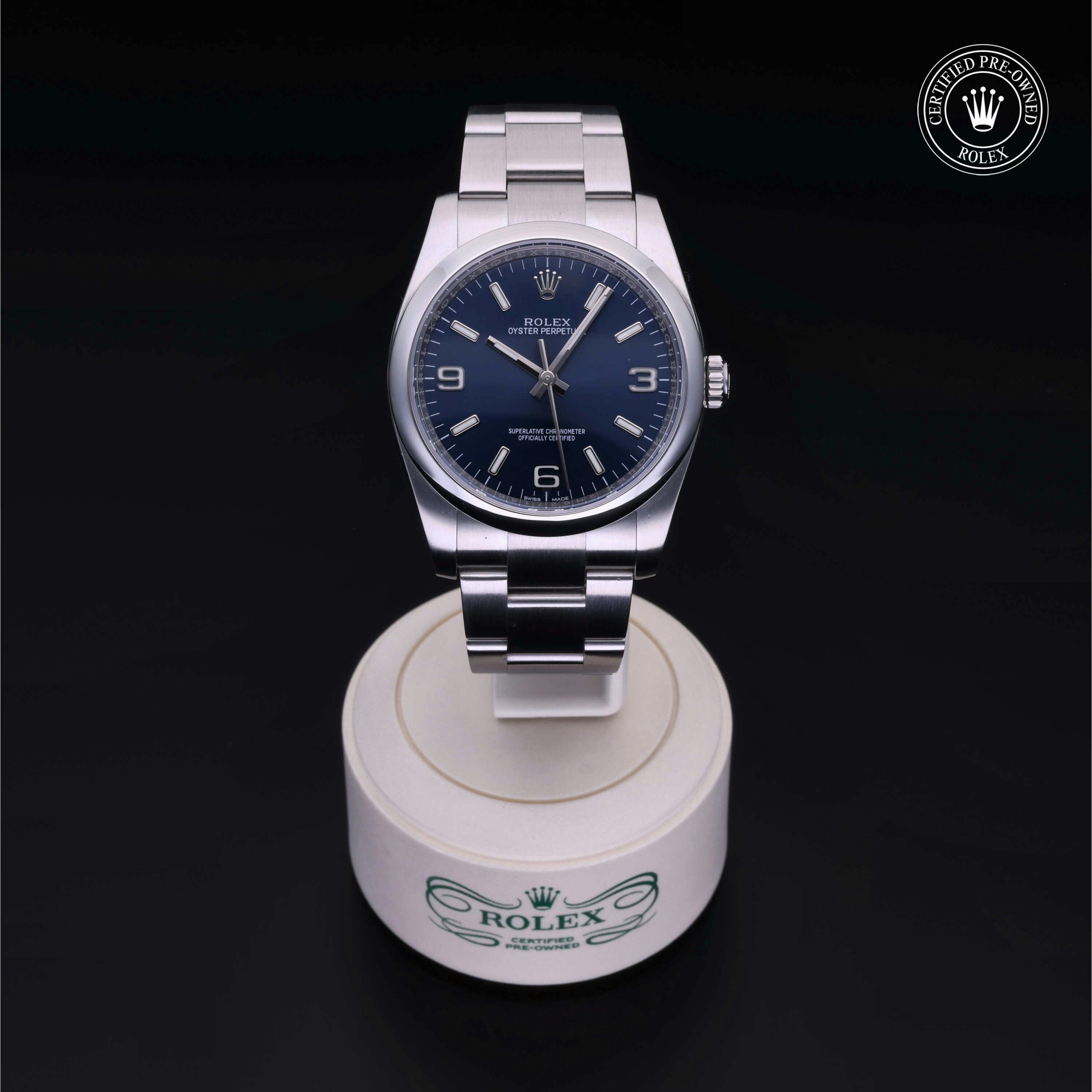 Rolex Certified Pre-Owned Oyster Perpetual (116000) self - winding automatic watch, features a 36mm stainless steel case and domed bezel surrounding a blue dial on a stainless steel oyster bracelet. Functions include hours, minutes and seconds. This watch has received Rolex-authorized service and certification. It does not come with the original box or papers, but includes a custom Rolex Certified Pre-Owned hang tag, travel pouch and RCPO international warranty card.