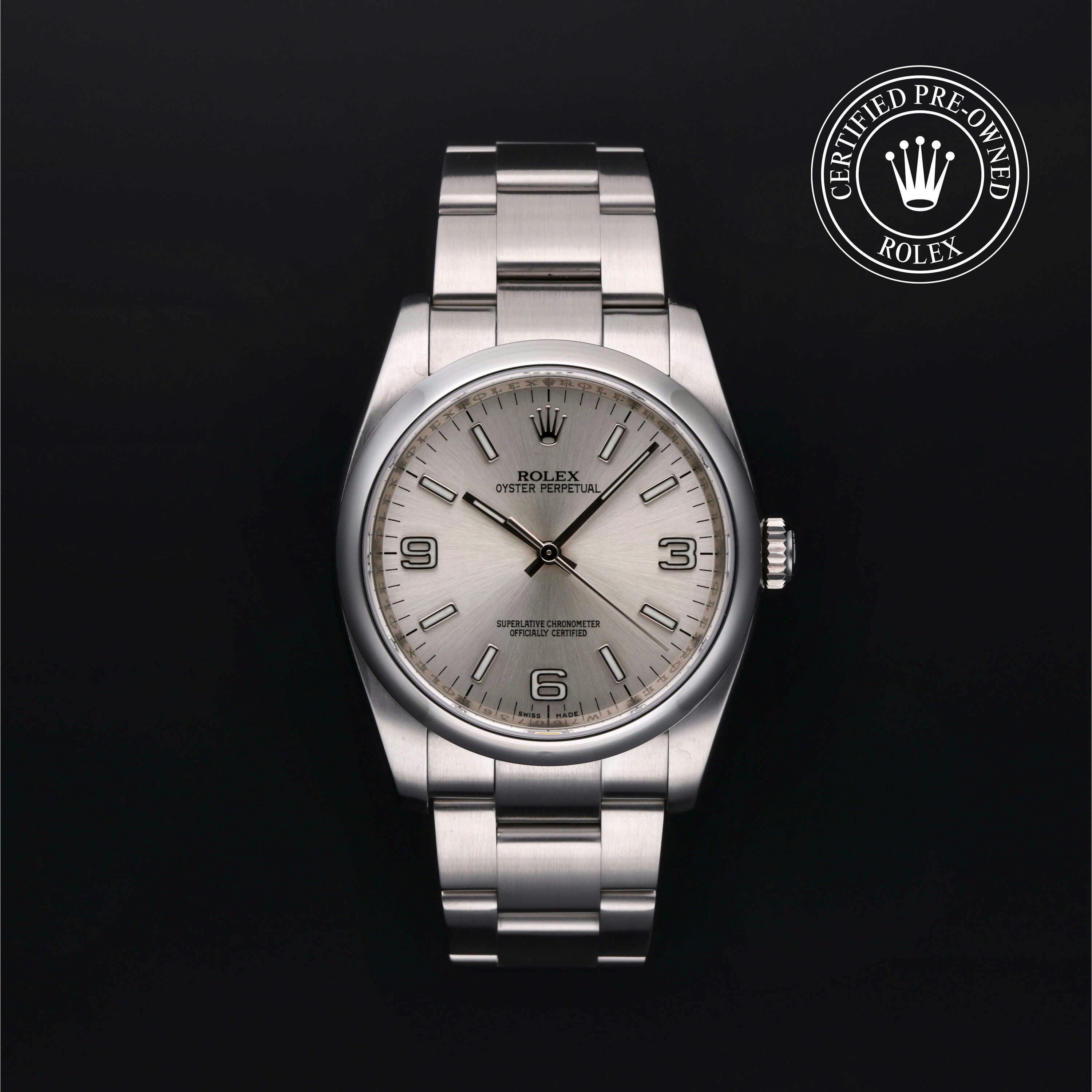 Rolex Certified Pre-Owned Oyster Perpetual (116000) self - winding automatic watch, features a 36mm stainless steel case and domed bezel surrounding a silver dial on a stainless steel oyster bracelet. Functions include hours, minutes and seconds. This watch has received Rolex-authorized service and certification. It does not come with the original box or papers, but includes a custom Rolex Certified Pre-Owned hang tag, travel pouch and RCPO international warranty card.