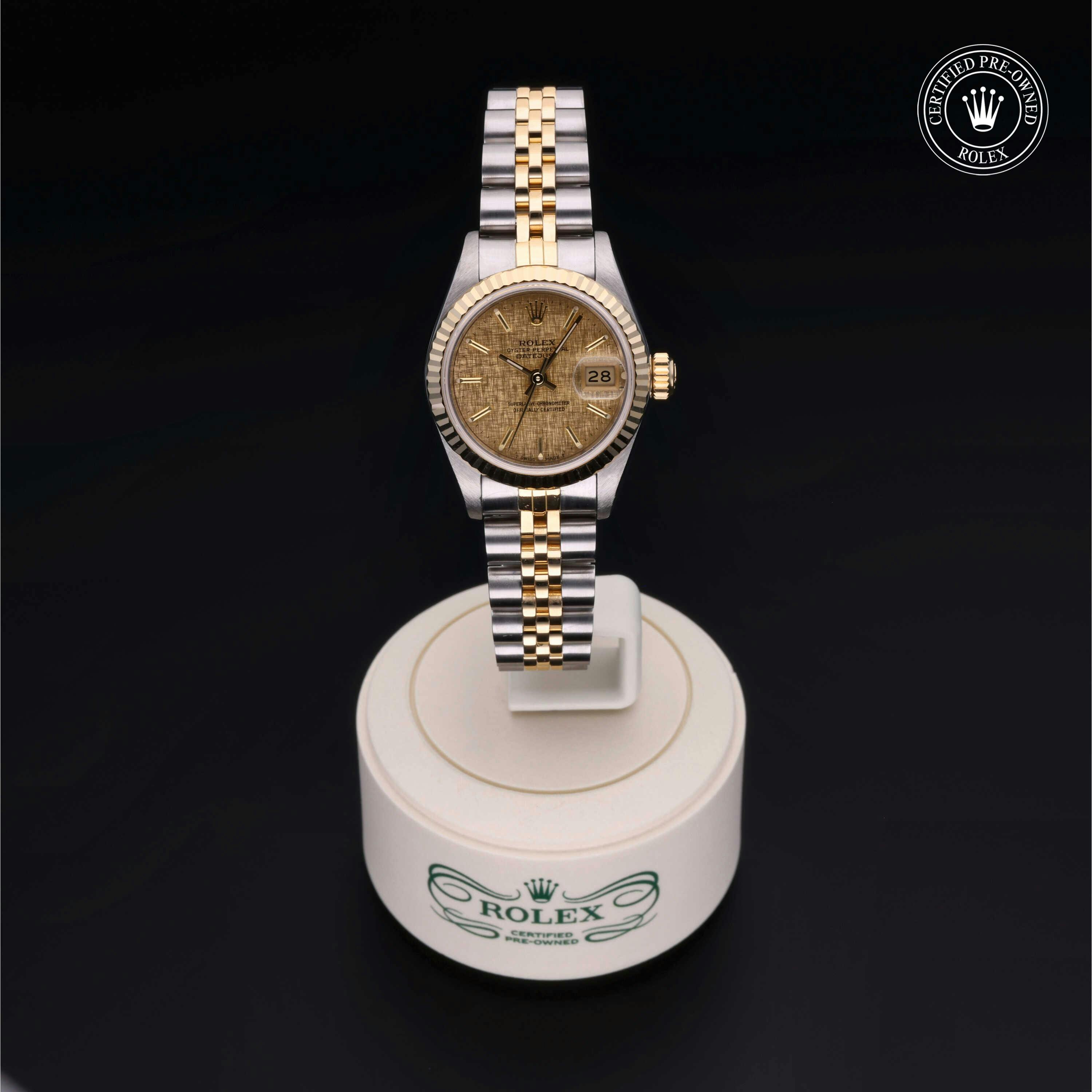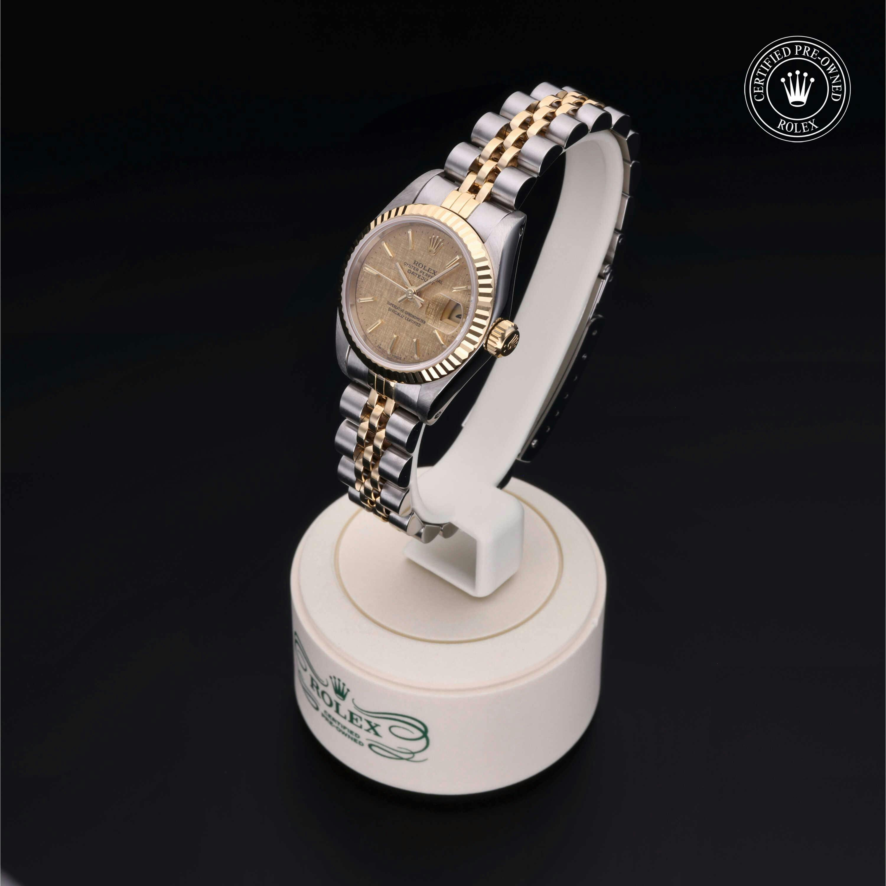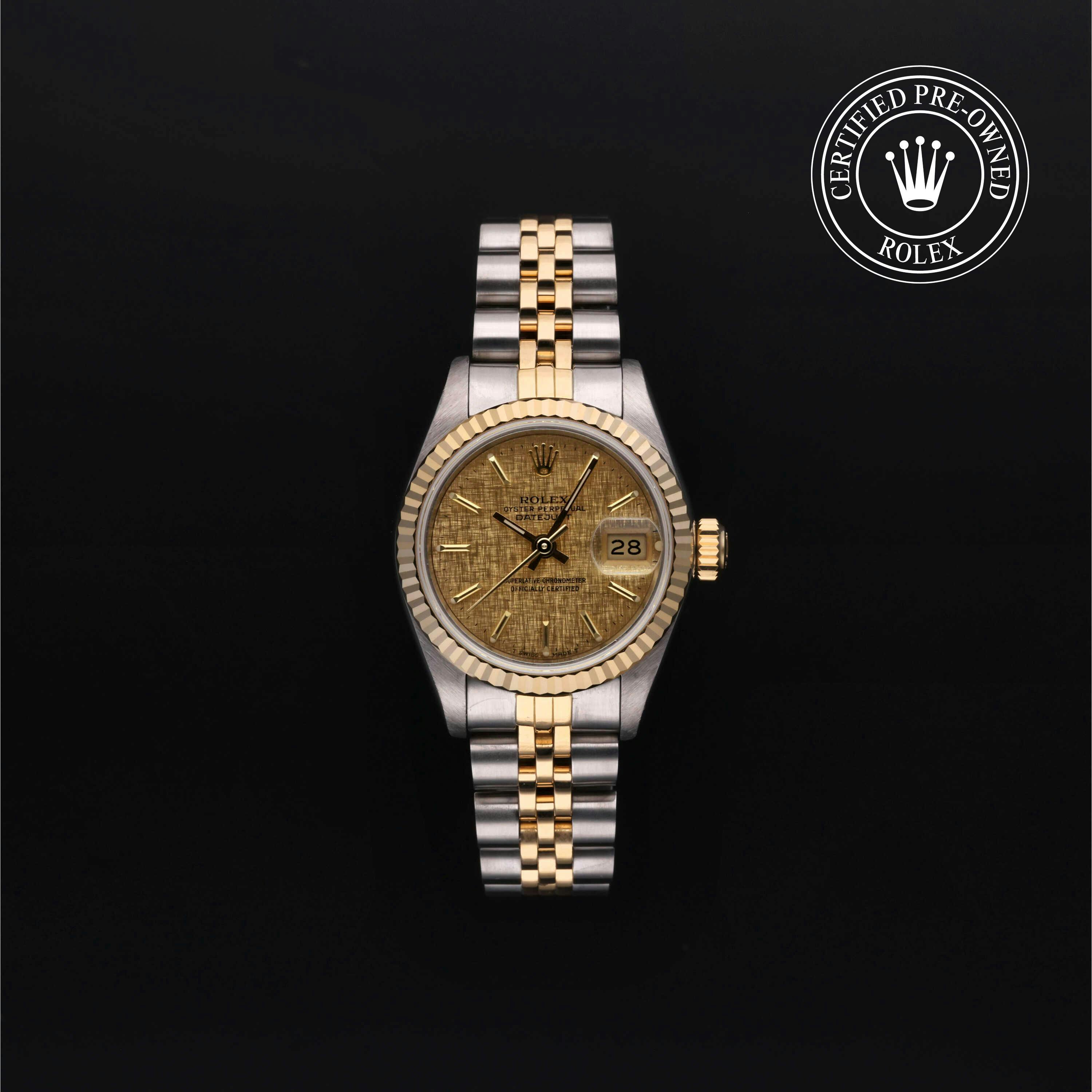 Rolex Certified Pre-Owned Datejust (69173) self - winding automatic watch, features a 26mm stainless case with an 18k yellow gold fluted bezel surrounding a champagne Mosaic dial on a stainless steel and 18k yellow gold jubilee bracelet. Functions include hours, minutes, seconds and date. This watch has received Rolex-authorized service and certification. It does not come with the original box or papers, but includes a custom Rolex Certified Pre-Owned hang tag, travel pouch and RCPO international warranty card.