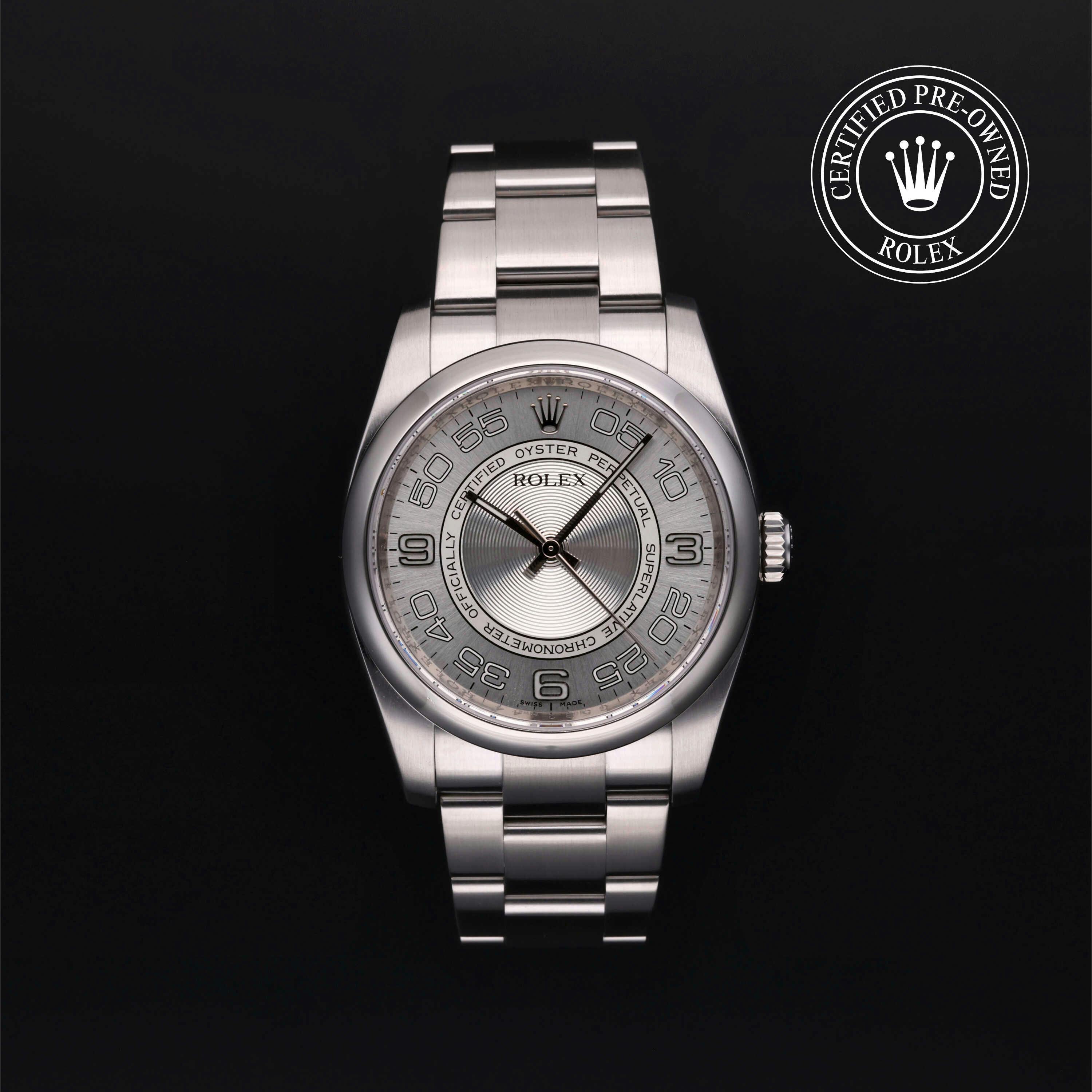 Rolex Certified Pre-Owned Oyster Perpetual (116000) self - winding automatic watch, features a 36mm stainless steel case and domed bezel surrounding a silver Concentric dial on a stainless steel oyster bracelet. Functions include hours, minutes and seconds. This watch has received Rolex-authorized service and certification. It does not come with the original box or papers, but includes a custom Rolex Certified Pre Owned hang tag, travel pouch and RCPO international warranty card.