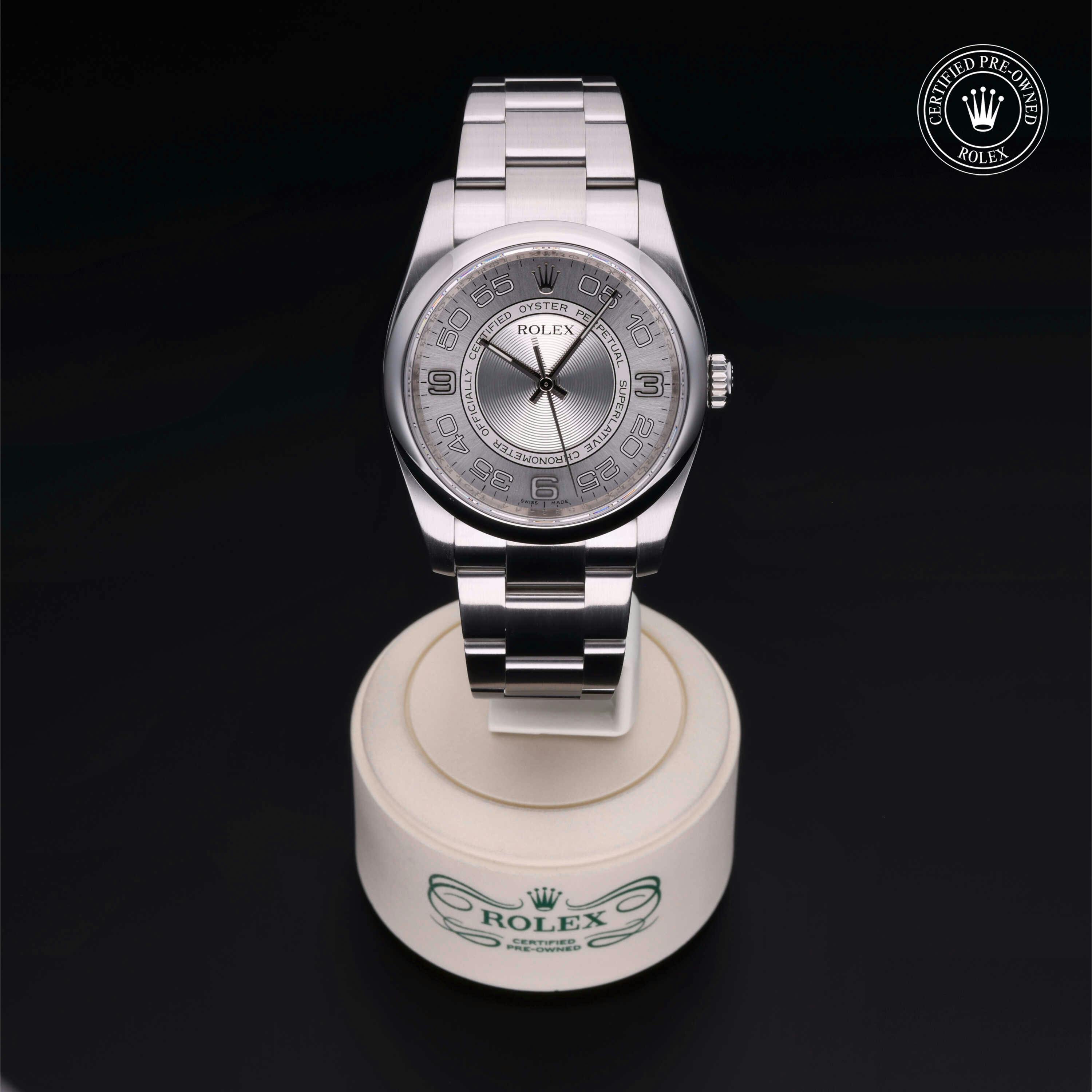 Rolex Certified Pre-Owned Oyster Perpetual (116000) self - winding automatic watch, features a 36mm stainless steel case and domed bezel surrounding a silver Concentric dial on a stainless steel oyster bracelet. Functions include hours, minutes and seconds. This watch has received Rolex-authorized service and certification. It does not come with the original box or papers, but includes a custom Rolex Certified Pre Owned hang tag, travel pouch and RCPO international warranty card.