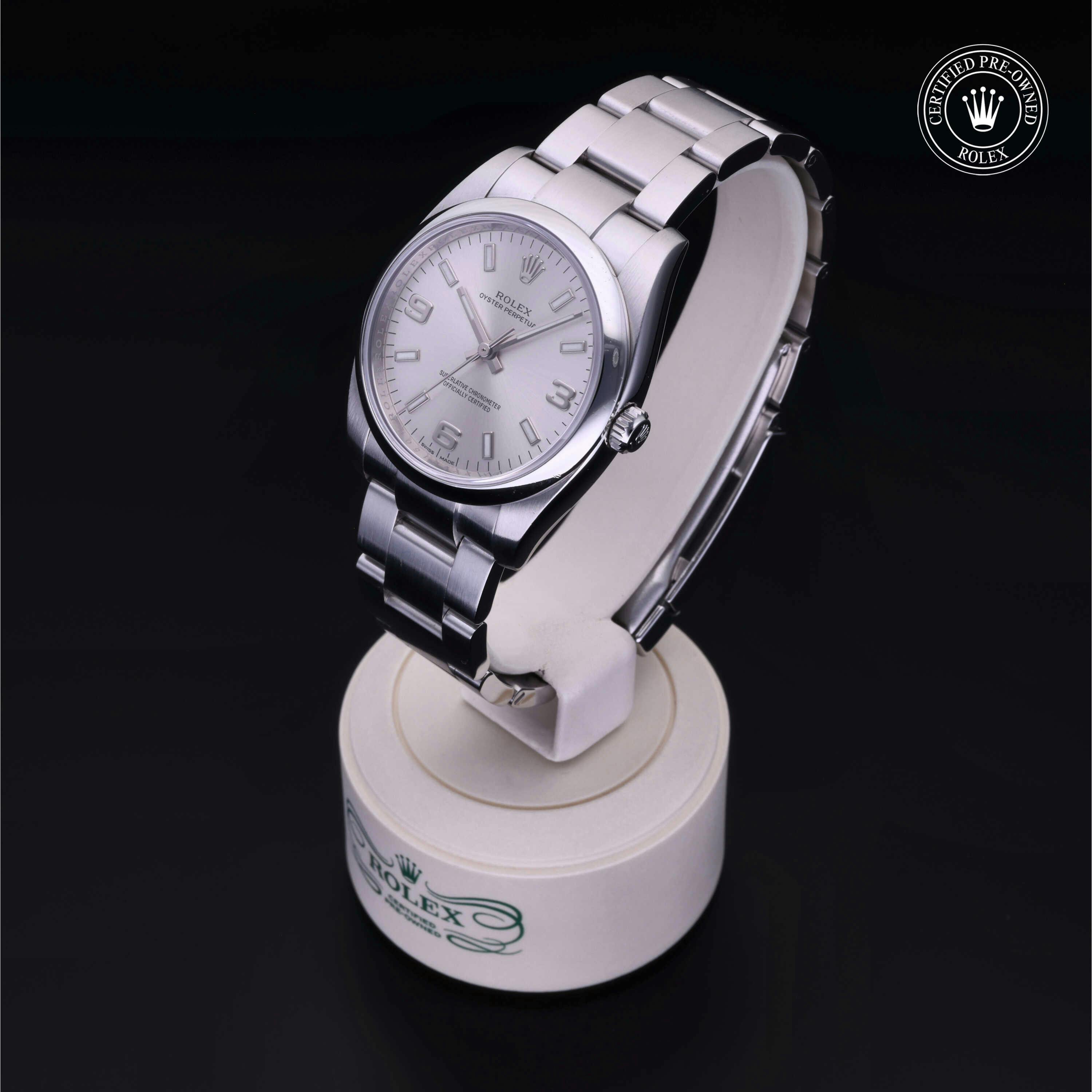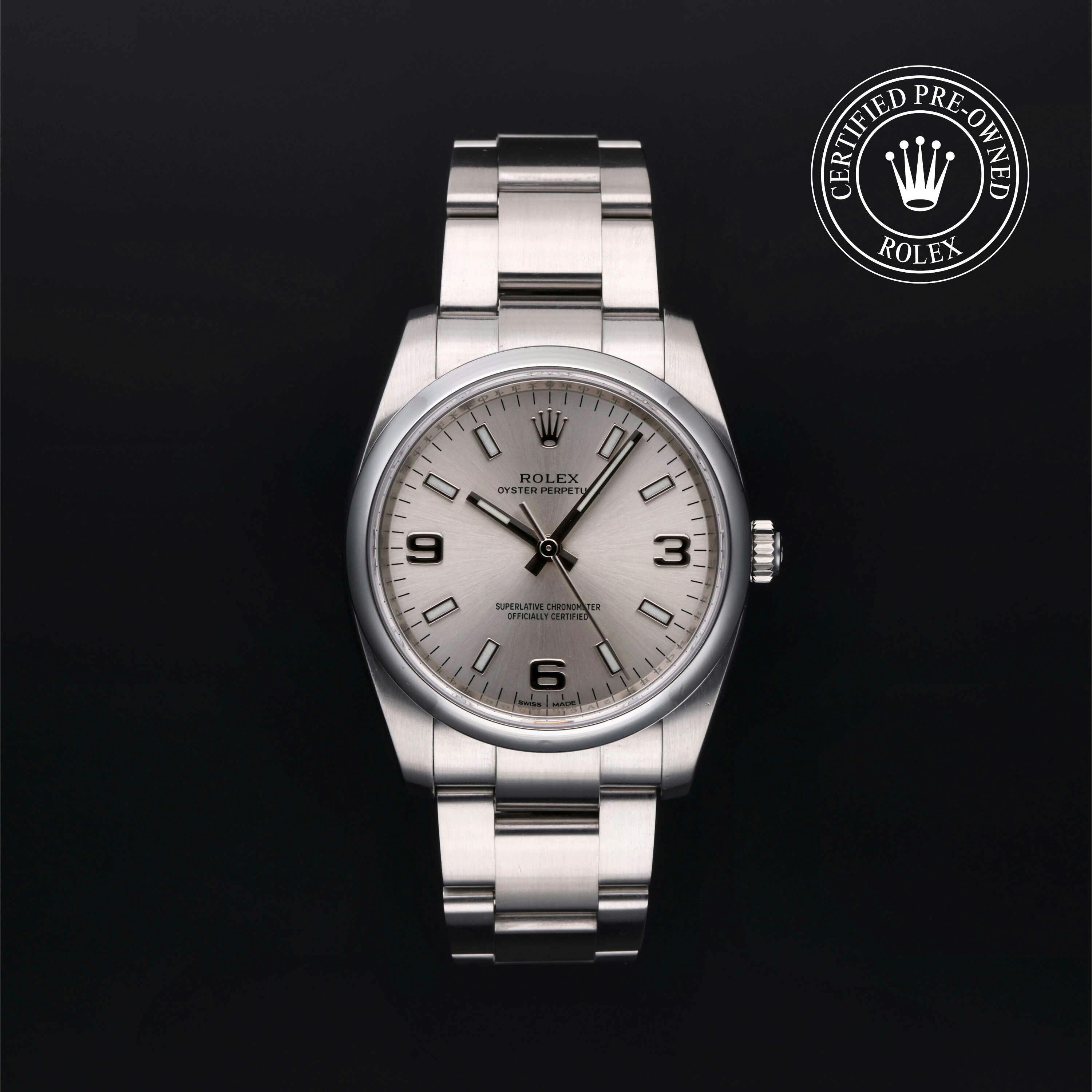 Rolex Certified Pre-Owned Oyster Perpetual (114200) self - winding automatic watch, features a 34mm stainless steel case and domed bezel surrounding a silver dial on a stainless steel oyster bracelet. Functions include hours, minutes and seconds. This watch has received Rolex-authorized service and certification. It does not come with the original box or papers, but includes a custom Rolex Certified Pre-Owned hang tag, travel pouch and RCPO international warranty card.