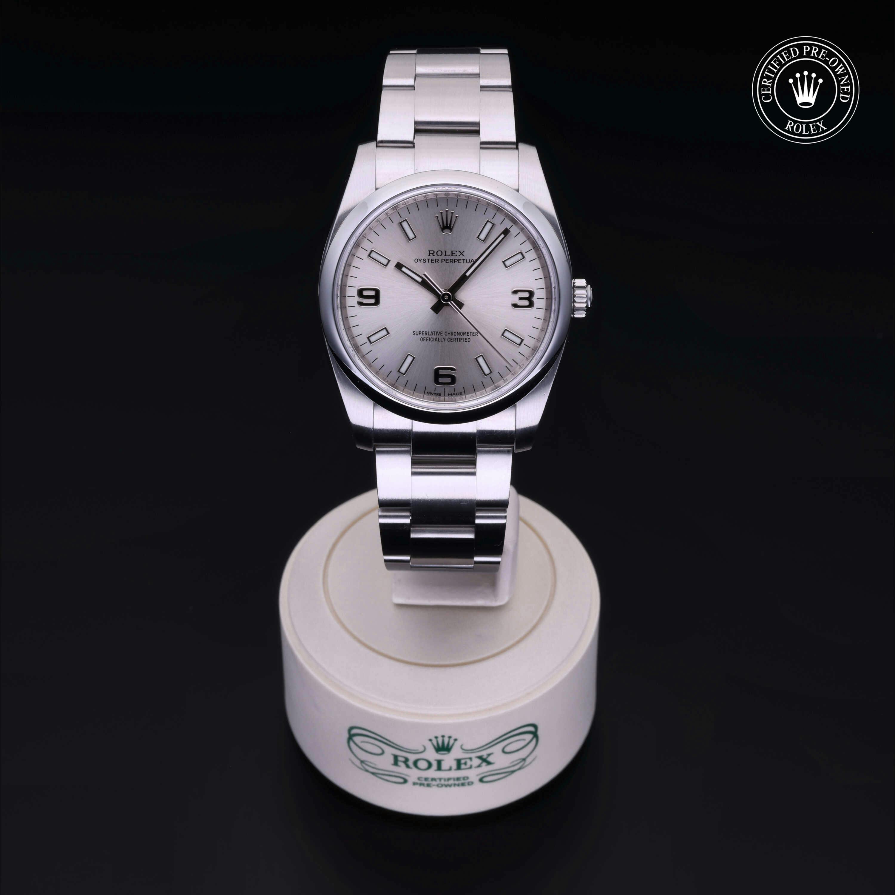 Rolex Certified Pre-Owned Oyster Perpetual (114200) self - winding automatic watch, features a 34mm stainless steel case and domed bezel surrounding a silver dial on a stainless steel oyster bracelet. Functions include hours, minutes and seconds. This watch has received Rolex-authorized service and certification. It does not come with the original box or papers, but includes a custom Rolex Certified Pre-Owned hang tag, travel pouch and RCPO international warranty card.
