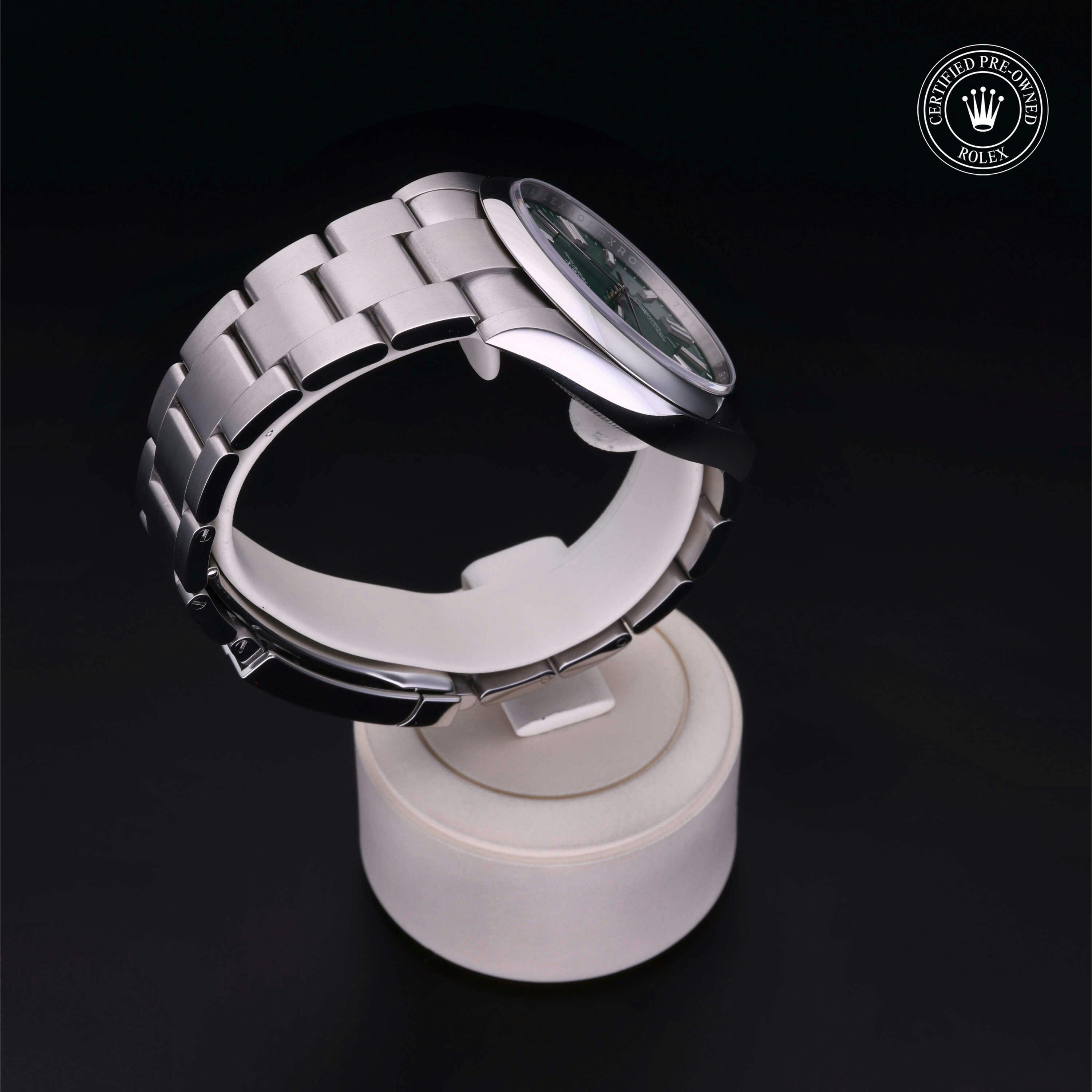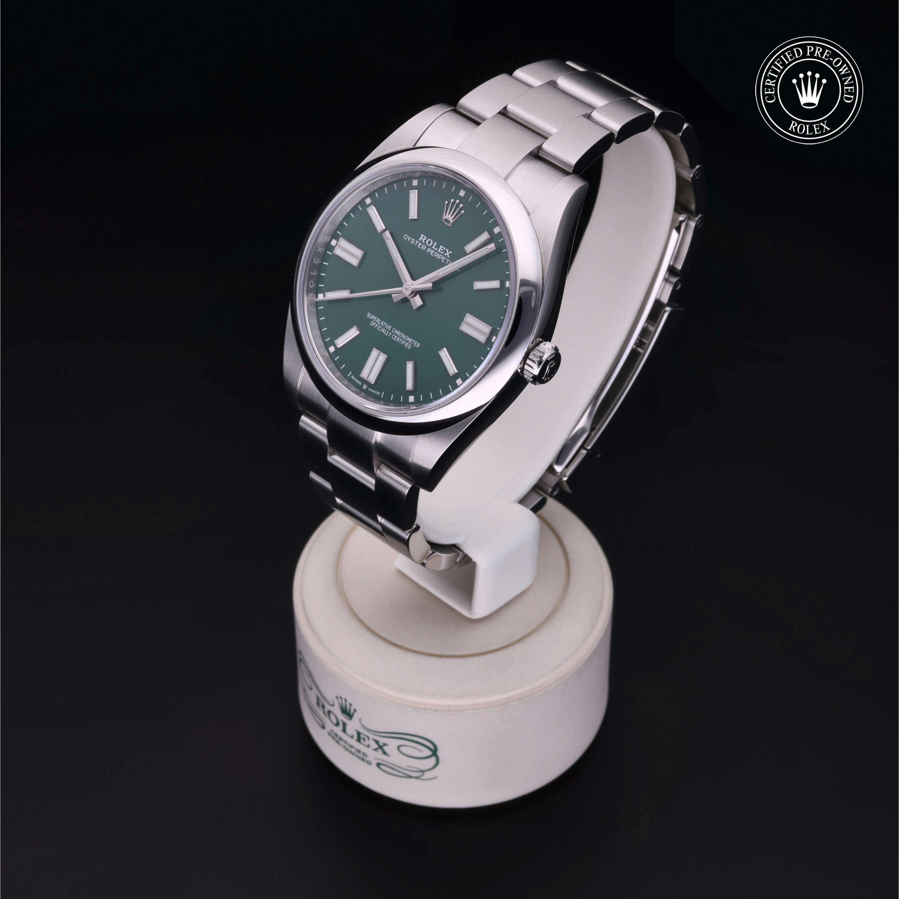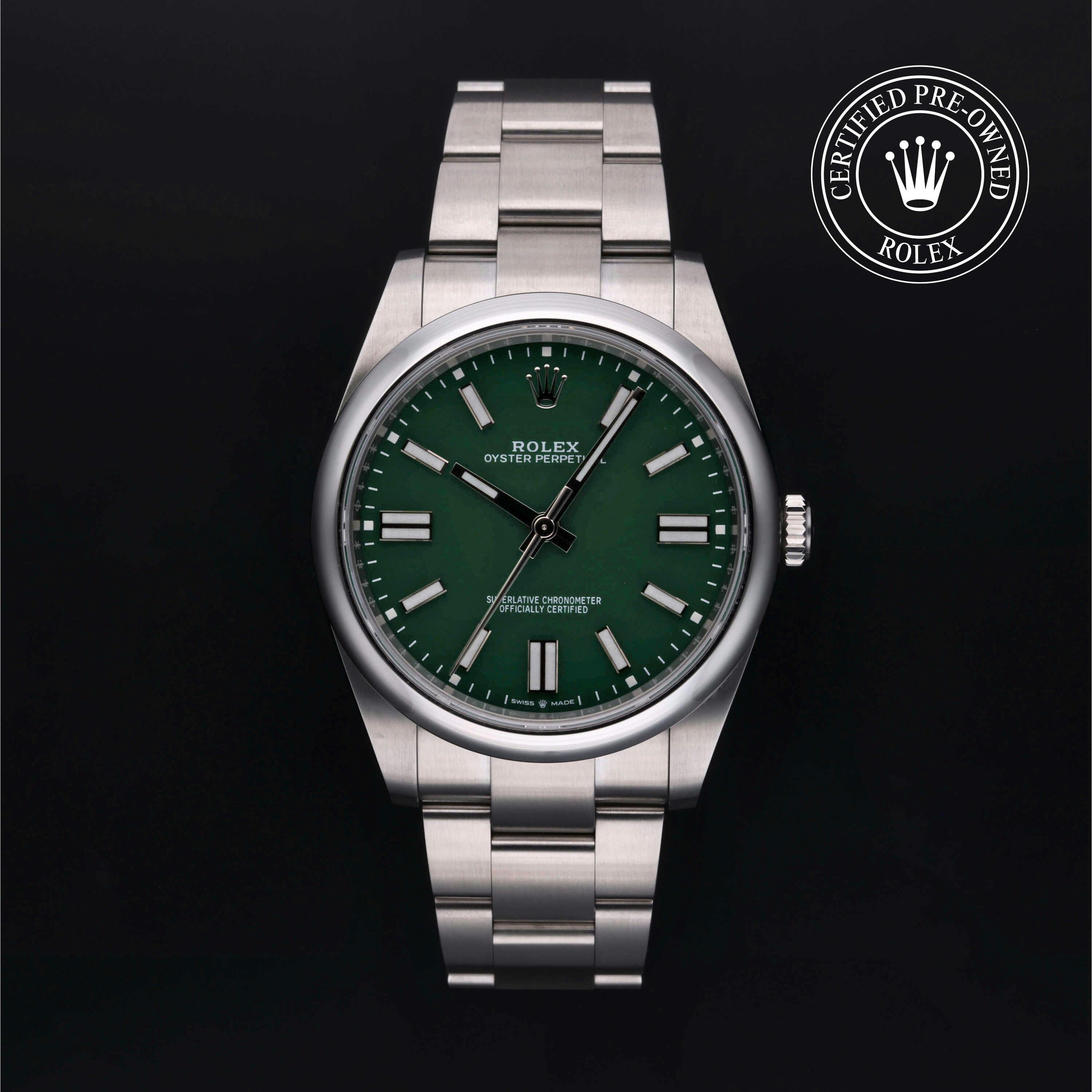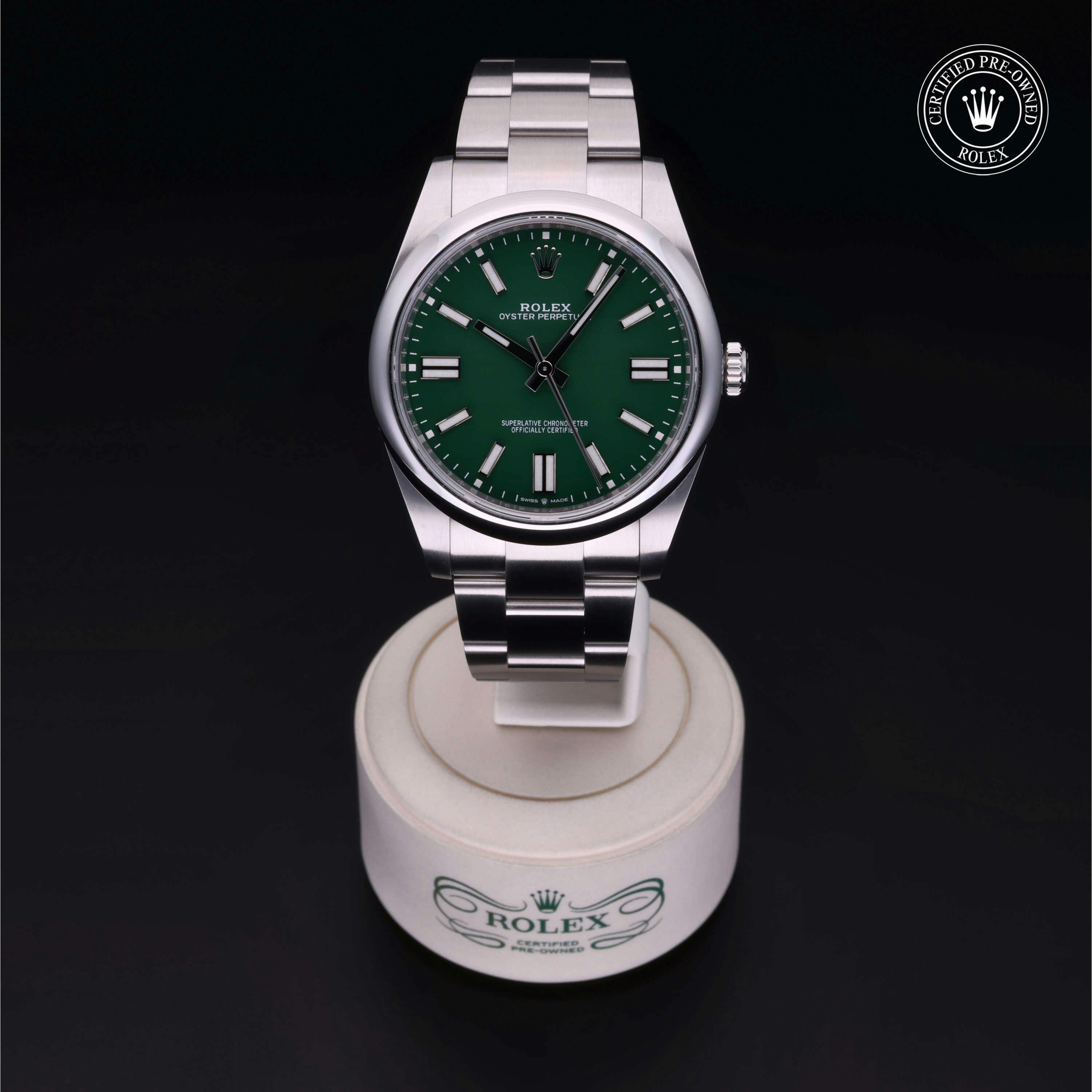 Rolex Certified Pre-Owned Oyster Perpetual (124300) self - winding automatic watch, features a 41mm stainless steel case and domed bezel surrounding a green dial on a stainless steel oyster bracelet. Functions include hours, minutes and seconds. This watch has received Rolex-authorized service and certification. It comes with the original box and papers, and includes a custom Rolex Certified Pre-Owned hang tag, travel pouch and RCPO international warranty card.